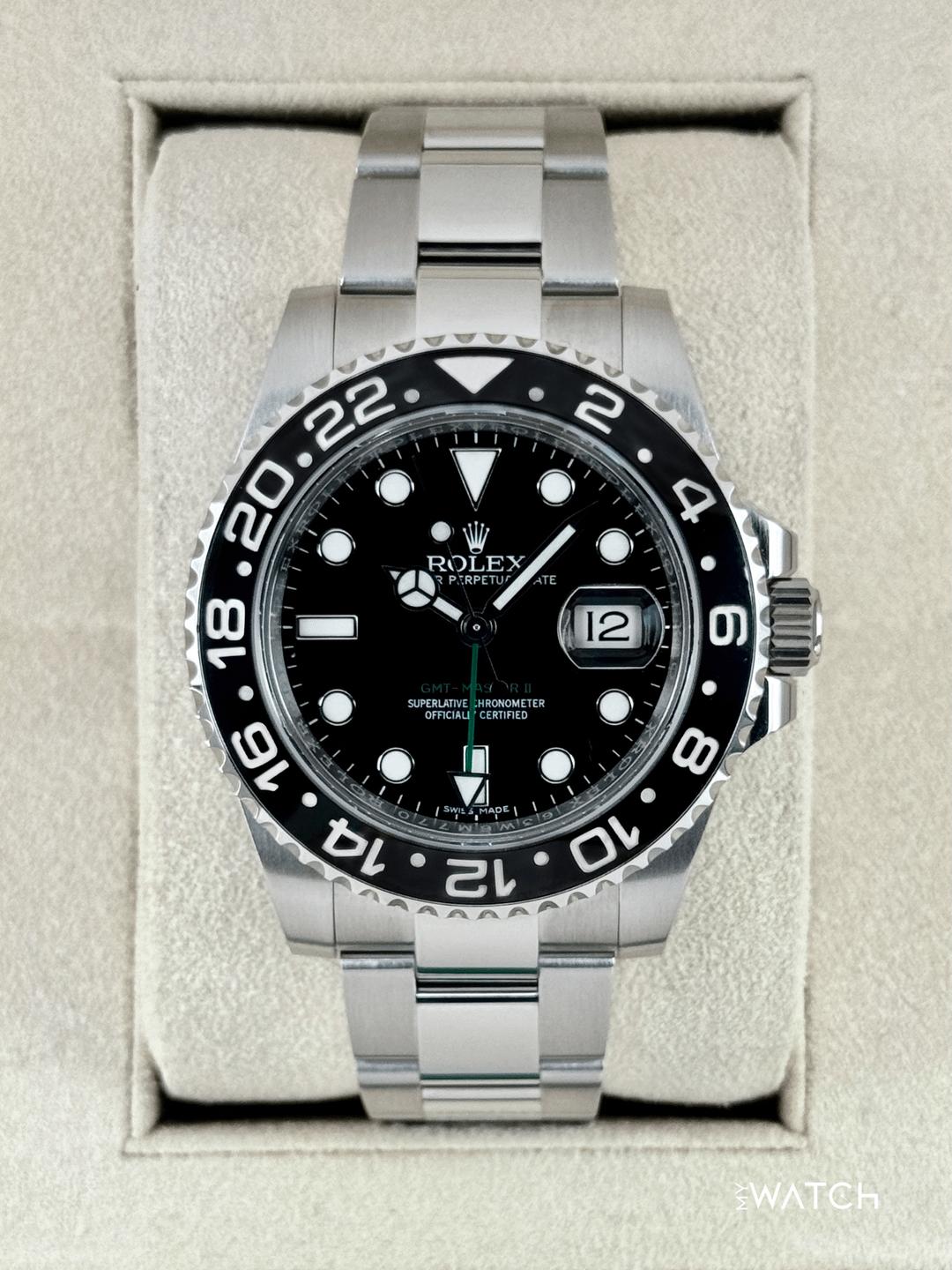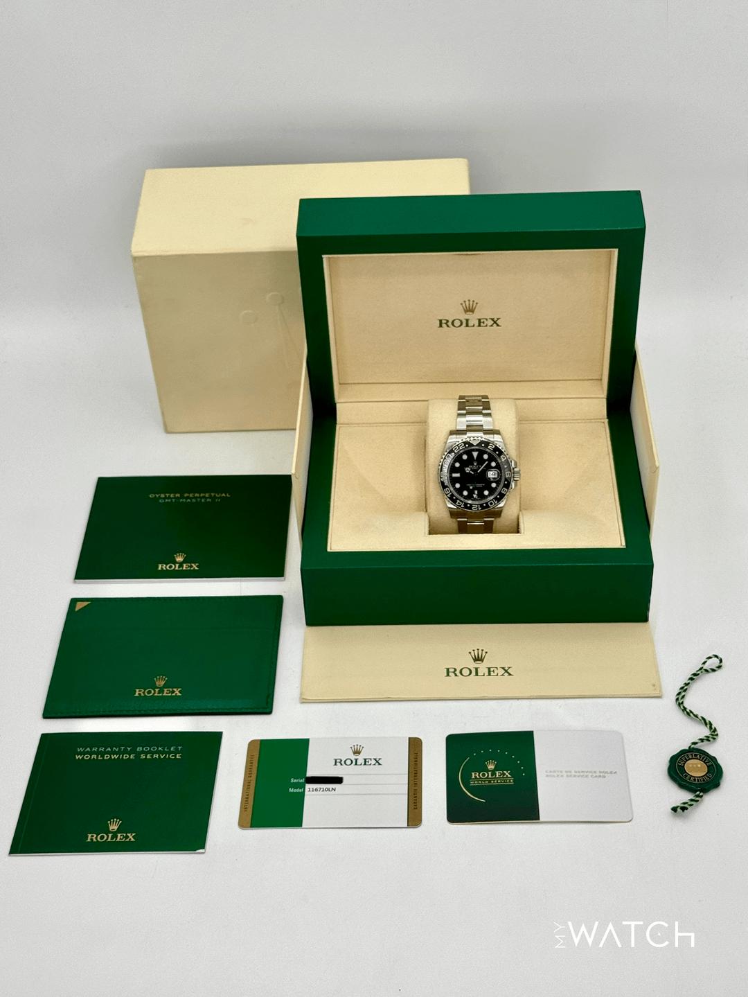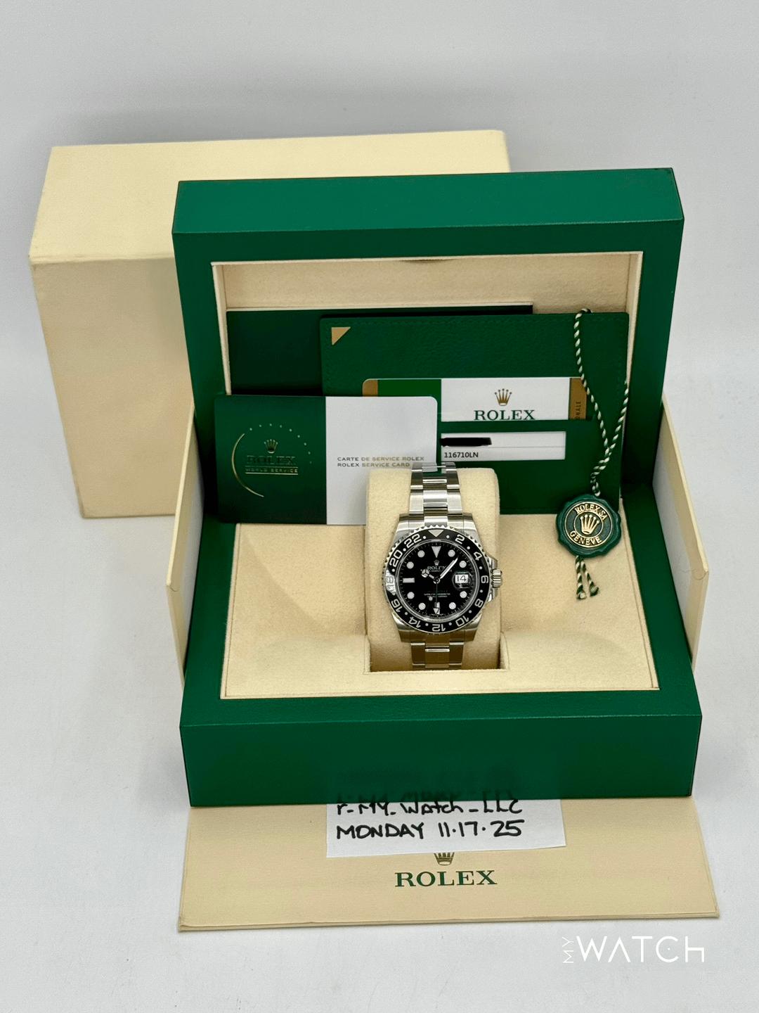 🔵**2017 Rolex GMT-Master II 40mm 116710LN Stainless Steel Black Dial** 🔵**Note: Rolex World Service Card valid until 8.2026** 🔵**TRADE or SELL us your luxury watch, all brands considered. Message me details.** **Includes the following:** **✔️Original Rolex Double boxed** **✔️Box and Papers - Yes** **✔️Warranty card dated 2017** **✔️Rolex World Service Card valid until 8.2026** **✔️Manual and Warranty booklets** **✔️Green Hang Tag included** **✔️Size: 8.0inch wrist (Full Links)** **✔️Watch is in excellent overall condition. Please see photos for details.** **✔️**[**Trades**](https://mywatchllc.com/pages/sell-rolex-watch) **welcome** Business Name: **My Watch LLC** LOCATION: Oak Park, Michigan ✔️[MyWatchLLC.com](http://mywatchllc.com/) for current inventory ✔️Google Business Listing [https://g.co/kgs/Cmd6FPW](https://g.co/kgs/Cmd6FPW) ✔️Business Hours M-F 9-6 ✔️Facetime/Video chat/calls welcome to view the watch interested. ✔️Contact: 248-422-0909 via text or call for quickest response. 🟢TERMS: Visit [MyWatchLLC.Com](http://mywatchllc.com/) for payments accepted 🟢REFERENCES/REVIEWS: We are well reviewed on all platforms from google, trust pilot, rolexforums, additionally we have 300+ reference in multiple FaceBook watch groups, reference checks welcome. 🟢SHIPPING: If you are not local, we offer Fully Insured FedEx overnight shipping in the USA for a fee. International shipping available.