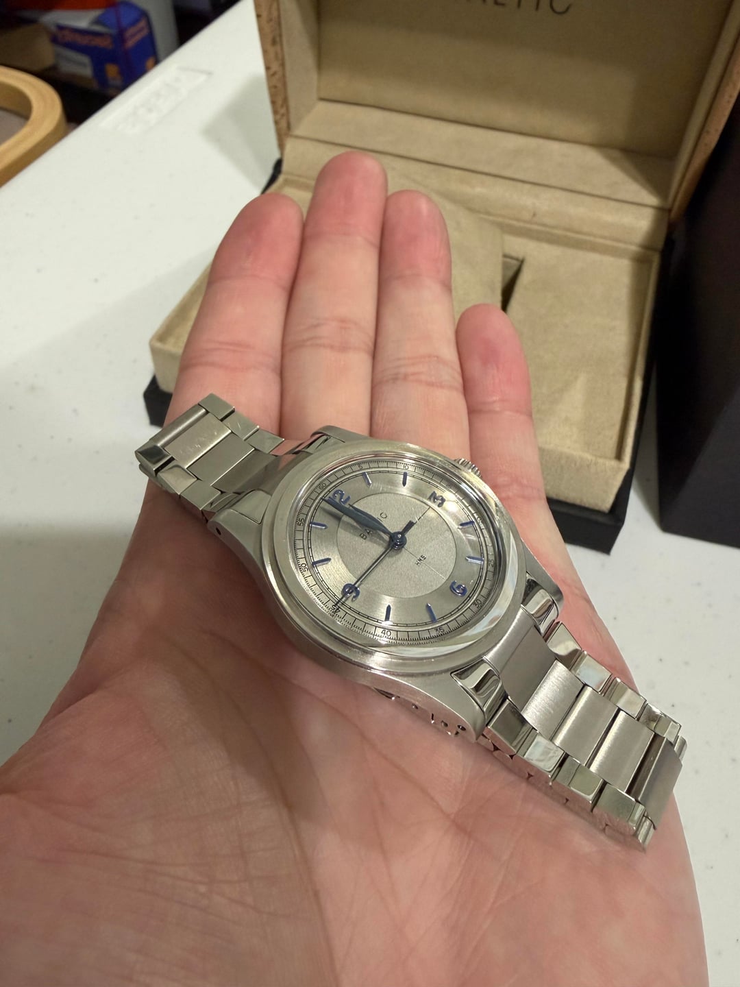 Price: $350 USD (Shipped) Paypal or Zelle Condition: Like New / Near Mint • Worn for a total of only 3 hours of wrist time. • Priced to sell, includes shipping within the continental US. Key Features & Condition This is the popular, vintage-inspired Baltic HMS 003 in the beautiful Silver-Blue configuration, featuring the classic sector dial design. The watch is in virtually brand-new condition, having been minimally worn. • Dial: Silver sector dial with a textured finish (brushed outer track, sandblasted inner circle) and striking blue hands and hour markers. • Case: Classic 1940s-inspired 36.5mm "Step Case" design with a mix of brushed and polished finishes. • Bracelet: Comes on the desirable Baltic steel bracelet flat links • Full Set: Includes the original cork and black Baltic boxes (as pictured)