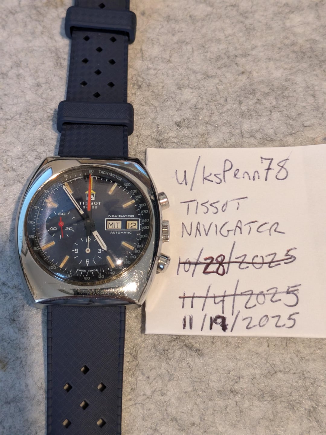 I am selling my vintage Tissot Navigator with the Lemania movement. The internals of the watch were completely cleaned and overhauled in July / August 2025 at Watch Repair & Co. on 47th Street in NYC - they provided a 1-year warranty (not sure if transferable, but I can provide the information). Tissot - Ref. 11003 - Cal. Lemania 5012 - Tissot 2920. Case reference is number 11003. Day and date wheels are in German. Subdial at 6 is for the chrono hours, at 9 is the running seconds. The airplane hand is for the chrono minutes, on the main dial itself. Size is 44mm top to bottom, 40mm side to side. This watch is in very good condition for being 50+ years old, and as noted above all time and chronograph functions are working perfectly. The blue tropical strap is new /unbranded. I'll throw in two leather straps in brown and black. Asking $1050 shipped (Venmo, Paypal). I am looking to pick up something else on this forum and need to sell a few things first! I have limited flair here but over 1,000 sales on eBay since 2000(!) with 100% positive feedback. I am comfortable on video chat or whatever.
