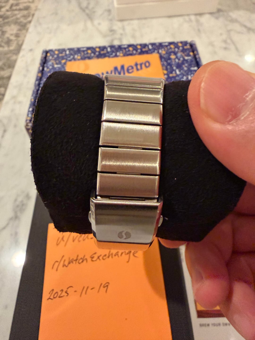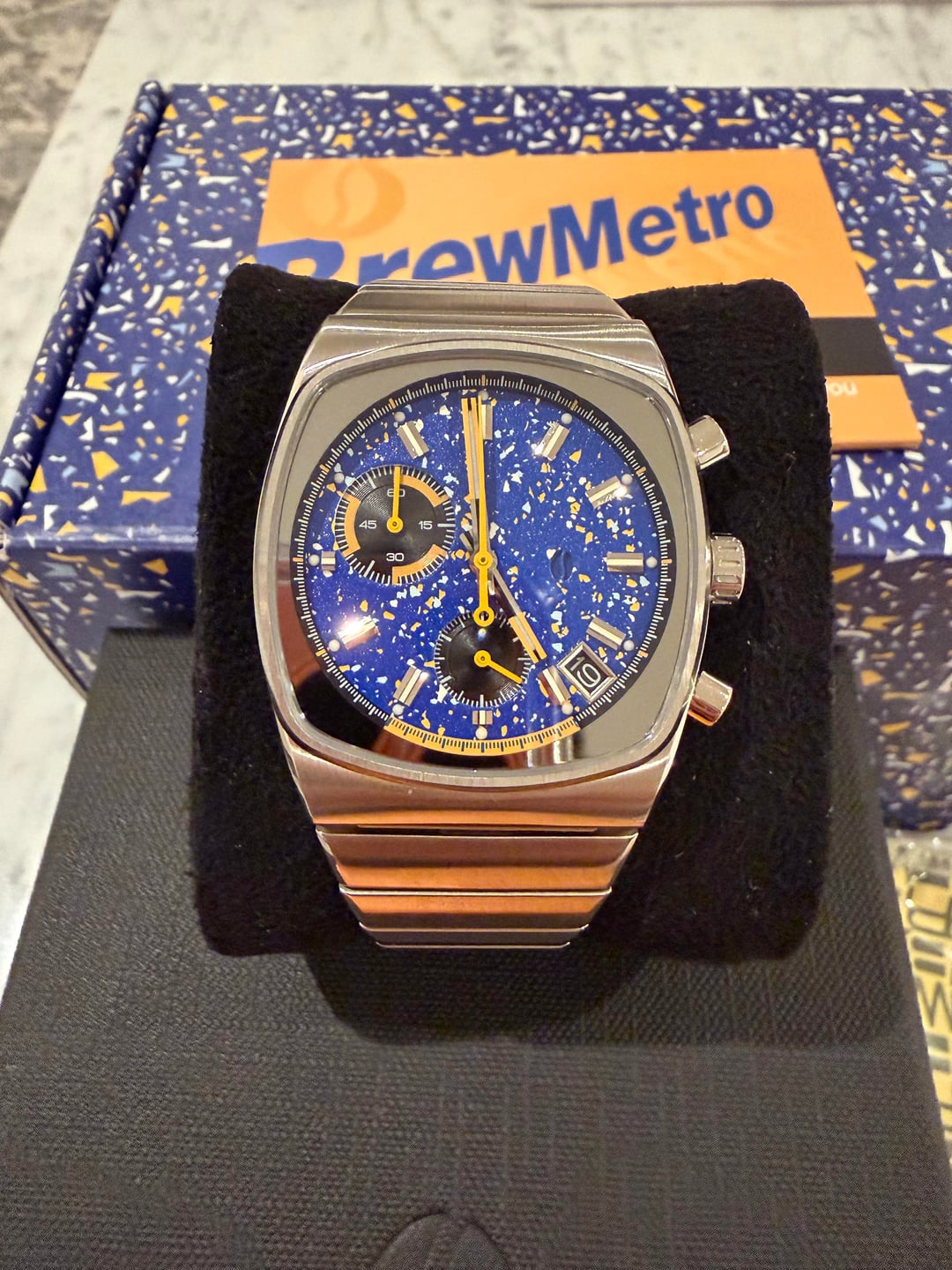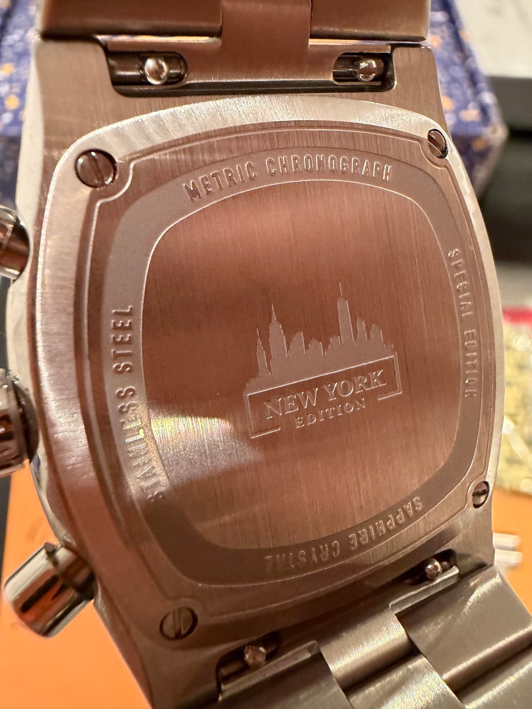 Listing Includes: Original box and watch sleeve, booklets, and warranty card. All links are included. I will provide pictures of everything that is included. I did size to my wrist of 6.5”. The watch was worn twice indoors to try on. Payment: PayPal G&S $525 shipped CONUS METRIC CHRONOGRAPH: (Available in-person at Wind^Up NYC)Inspired by New York City, this watch captures the legacy of this timeless city. The dial draws from the terrazzo flooring of the NYC subway, with unique patterns that make every piece one of a kind. Each color reflects a different subway line, celebrating the city’s vibrant spirit. The engraved NYC skyline on the caseback completes the story - a tribute to the architecture and energy of New York City. CASE DIAMETER: 36MM x 41.5MMCASE THICKNESS: 10.75MMLUG WIDTH: 19.85MMCRYSTAL: SAPPHIRE GLASSCASE MATERIAL: STAINLESS STEEL 316L PUSHER: ANODIZED ALUMINUMCASEBACK: STAINLESS STEEL 316L BAND: STAINLESS STEEL, BRUSHED + POLISHED, QUICK-RELEASEBUCKLE: FOLDING CLASP, MICRO-ADJUSTMENTSDIAL: FINE-TEXTURE, RECESSED SQUARE SUBDIALSWATER RESISTANCE: 5ATM (50 METERS)MOVEMENT: HYBRID VK68 MECA-QUARTZ CHRONOGRAPH