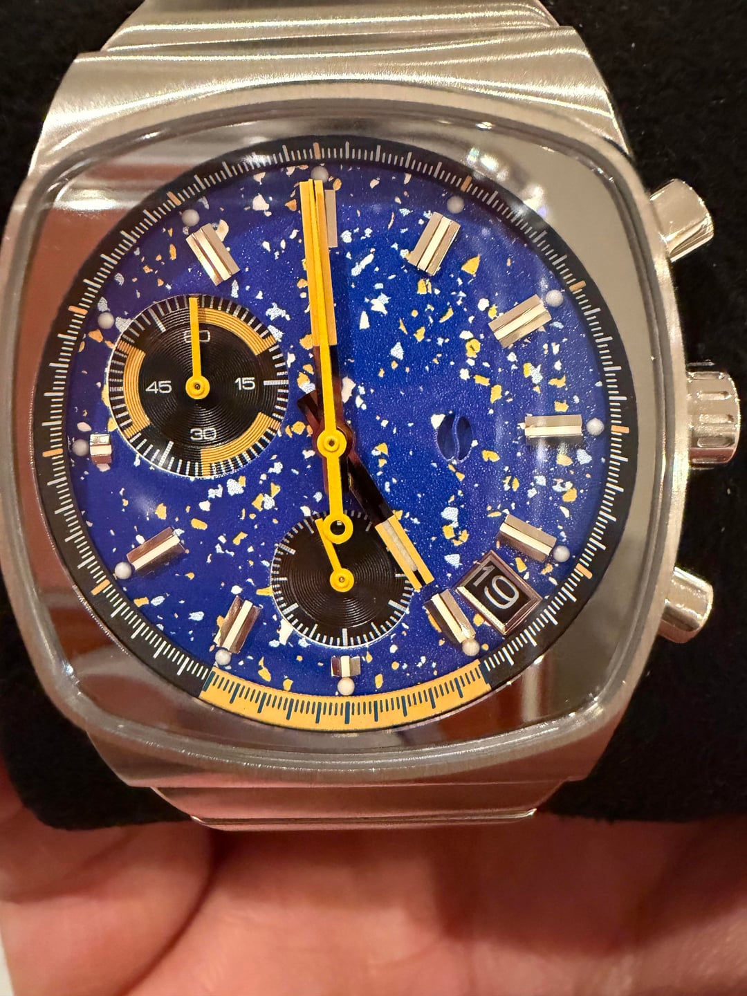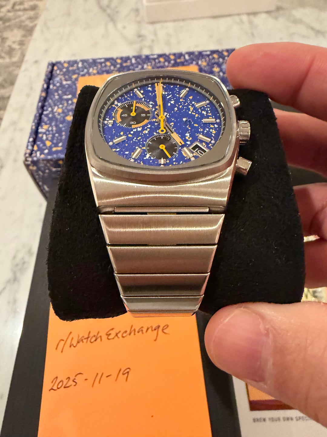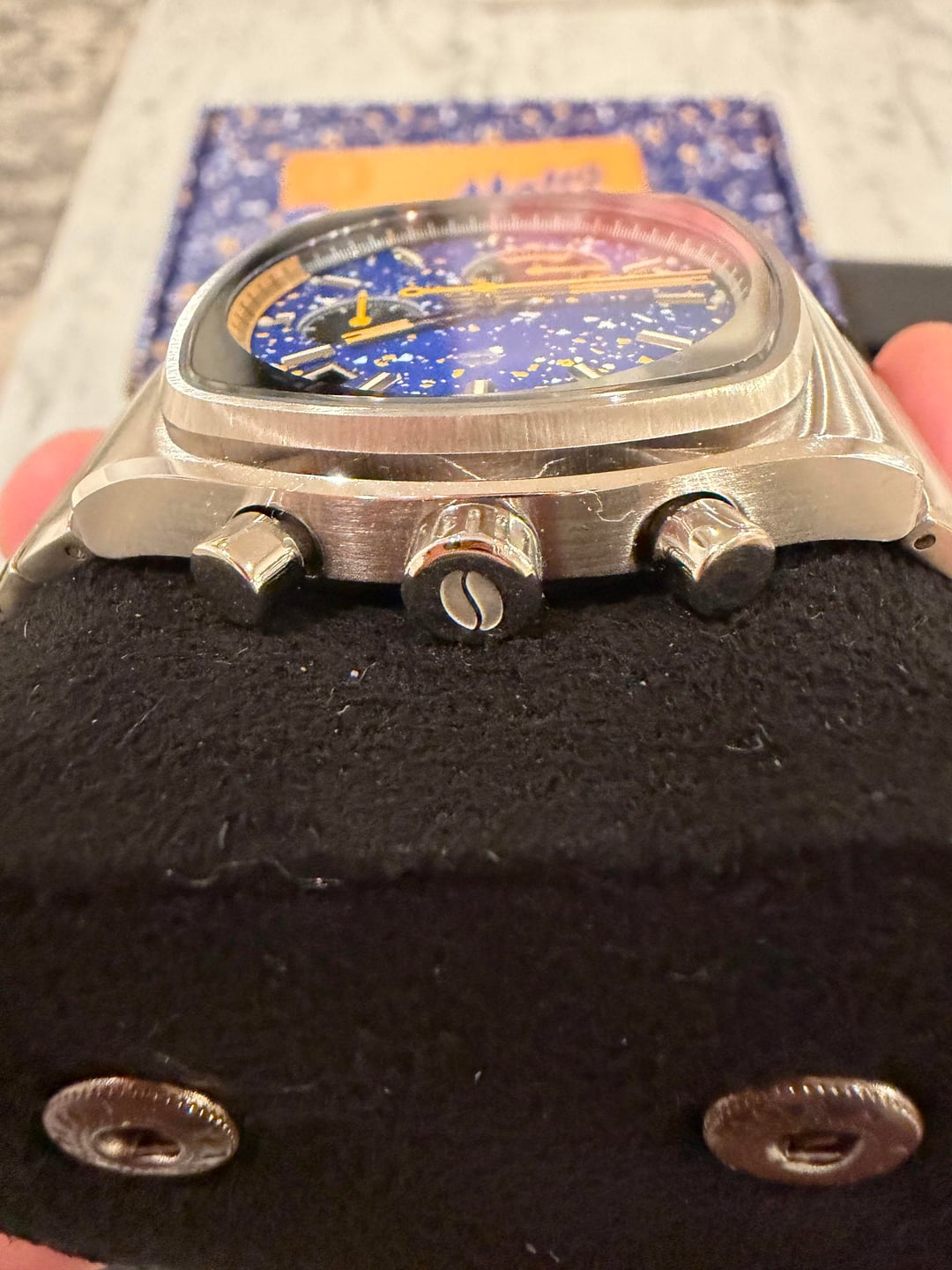 Listing Includes: Original box and watch sleeve, booklets, and warranty card. All links are included. I will provide pictures of everything that is included. I did size to my wrist of 6.5”. The watch was worn twice indoors to try on. Payment: PayPal G&S $525 shipped CONUS METRIC CHRONOGRAPH: (Available in-person at Wind^Up NYC)Inspired by New York City, this watch captures the legacy of this timeless city. The dial draws from the terrazzo flooring of the NYC subway, with unique patterns that make every piece one of a kind. Each color reflects a different subway line, celebrating the city’s vibrant spirit. The engraved NYC skyline on the caseback completes the story - a tribute to the architecture and energy of New York City. CASE DIAMETER: 36MM x 41.5MMCASE THICKNESS: 10.75MMLUG WIDTH: 19.85MMCRYSTAL: SAPPHIRE GLASSCASE MATERIAL: STAINLESS STEEL 316L PUSHER: ANODIZED ALUMINUMCASEBACK: STAINLESS STEEL 316L BAND: STAINLESS STEEL, BRUSHED + POLISHED, QUICK-RELEASEBUCKLE: FOLDING CLASP, MICRO-ADJUSTMENTSDIAL: FINE-TEXTURE, RECESSED SQUARE SUBDIALSWATER RESISTANCE: 5ATM (50 METERS)MOVEMENT: HYBRID VK68 MECA-QUARTZ CHRONOGRAPH