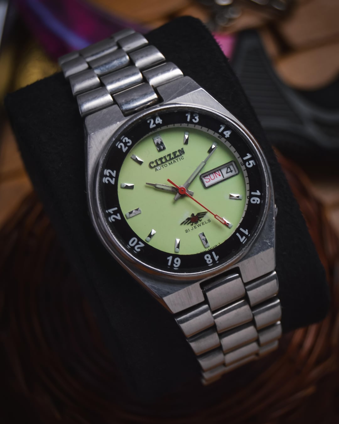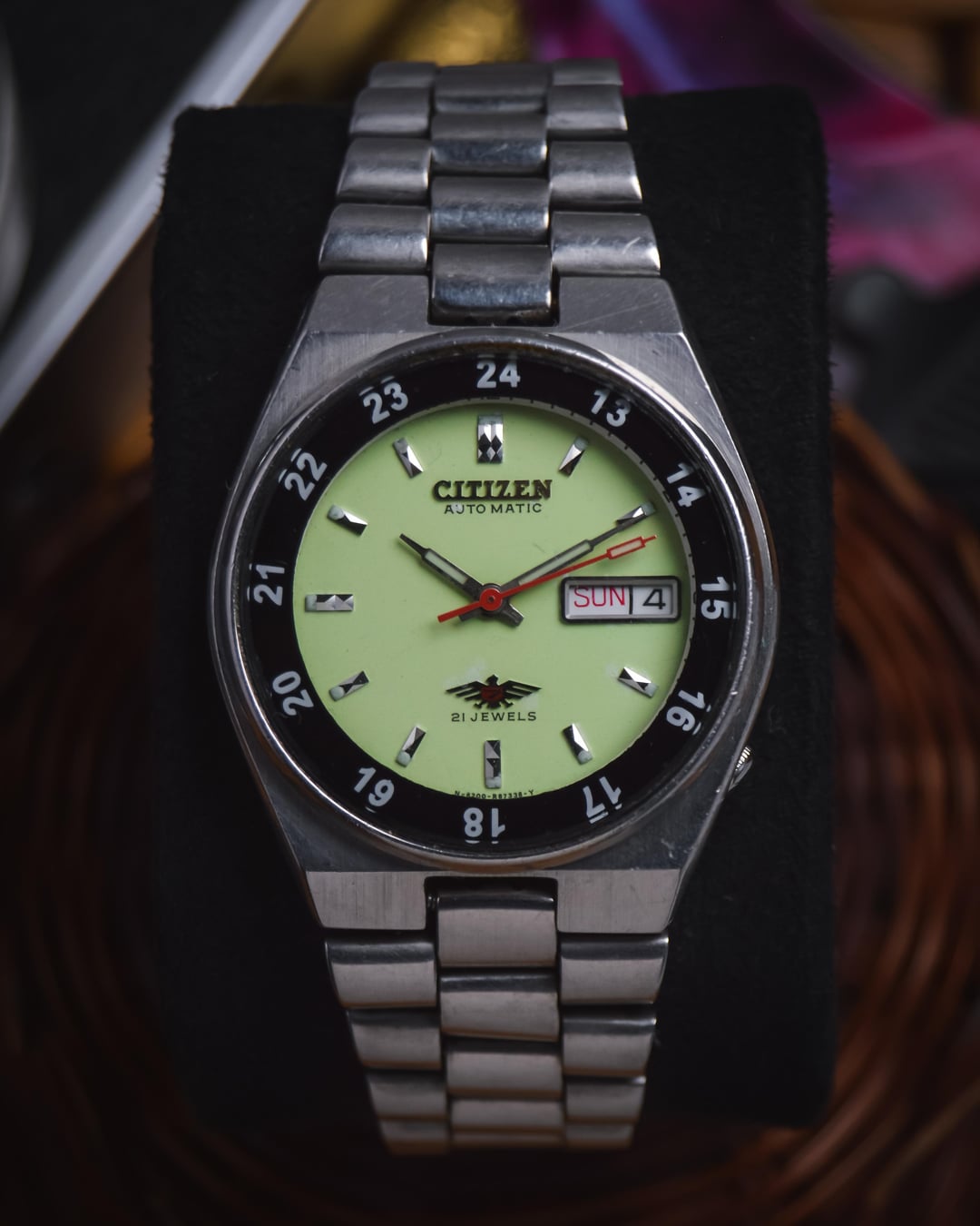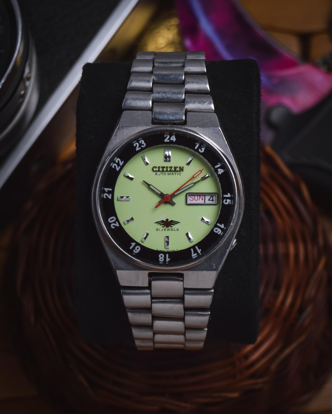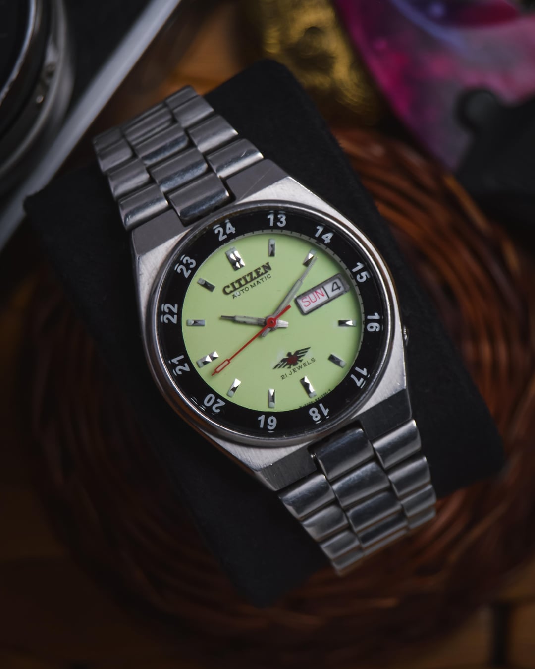 [Timestamp](https://postimg.cc/qN56yrGt) Hey Watchexchange! Up for sale is a **1992 Citizen Eagle 7 ref. 4-R13787**, a vintage automatic that perfectly captures the bold styling of early ’90s Citizen design. This particular example is especially fun thanks to its **luminous railway-time dial** — a quirky, practical feature that glows across the whole face when charged, making it a true conversation starter. The dial itself is a vibrant pale green with a full 24-hour track on the outer black ring. Applied **silver indices and syringe hands** give it a sharp, legible layout, while the red seconds hand and day/date at 3 o’clock add that extra pop of character. It runs on the robust **21-jewel Cal. 8200 automatic** — built by Miyota, Citizen’s own subsidiary — a movement known for reliability and longevity. Condition-wise, the watch remains unpolished till the date, keeping its original factory lines and edges. The crystal has been replaced with a new mineral glass for a cleaner look, while the original Citizen bracelet is still intact and wears comfortably. 🔹 **Dimensions** • Case Diameter: ***36mm*** **(without crown)** • Thickness: ***10mm*** • Lug Width: ***10mm*** **(integrated bracelet)** 💵 **Price:** $99 + shipping 🚢 **Shipping:** UPS (Worldwide) 📦 **Payment:** PayPal F&F or G&S (+4.5% fee paid by the buyer) or **bank wire**(US banks accepted) 📩 DM me for more pics or a custom timestamp. A true vintage Citizen oddball with its lume dial + railway time layout, this Eagle 7 makes for a unique and wearable collector’s piece. Follow my **Instagram** page through the link in my Reddit profile to see more vintage pieces and upcoming listings.