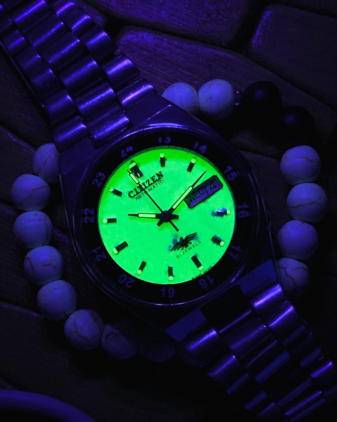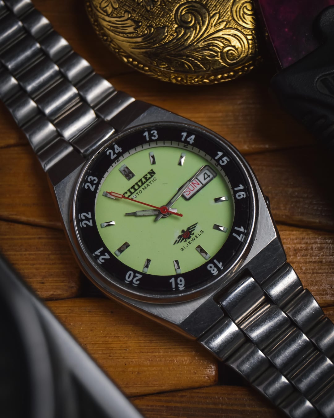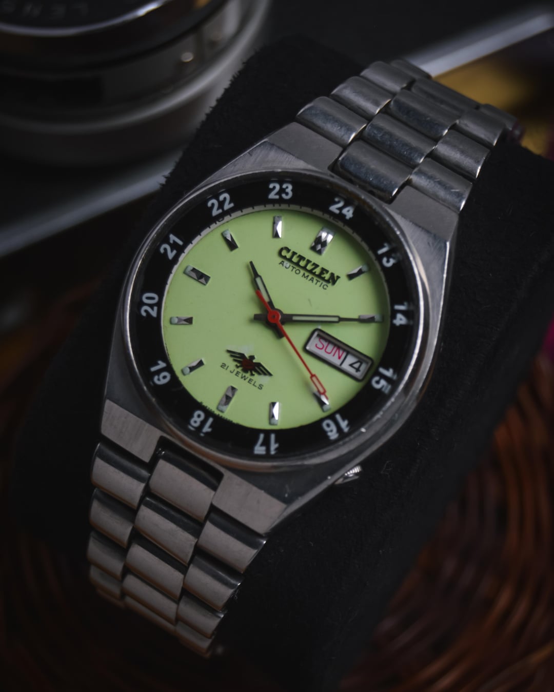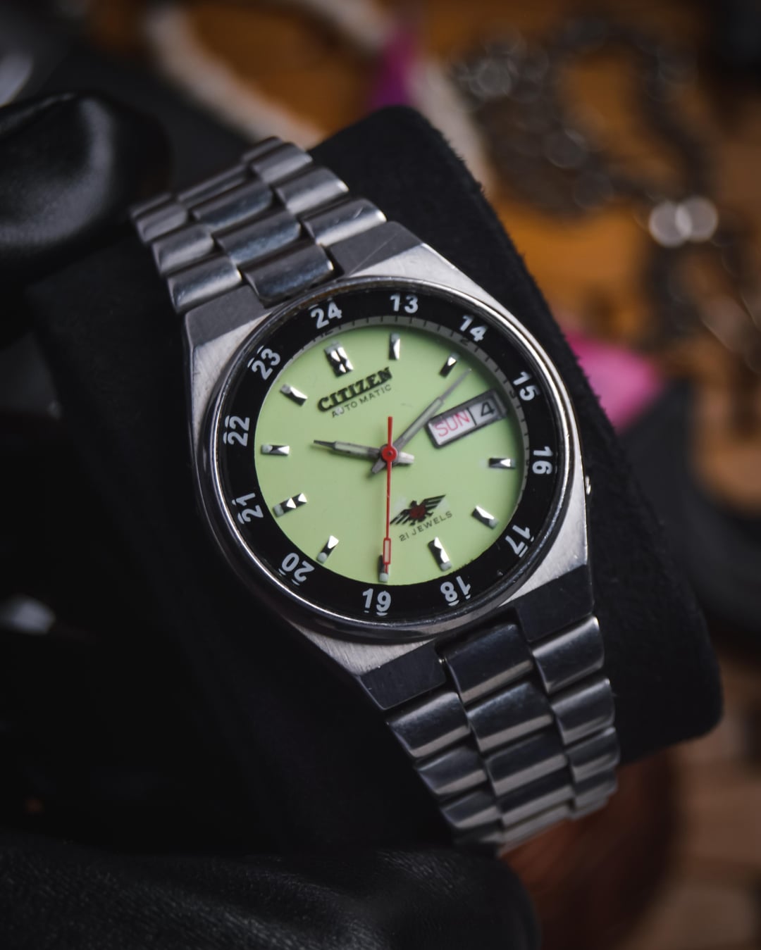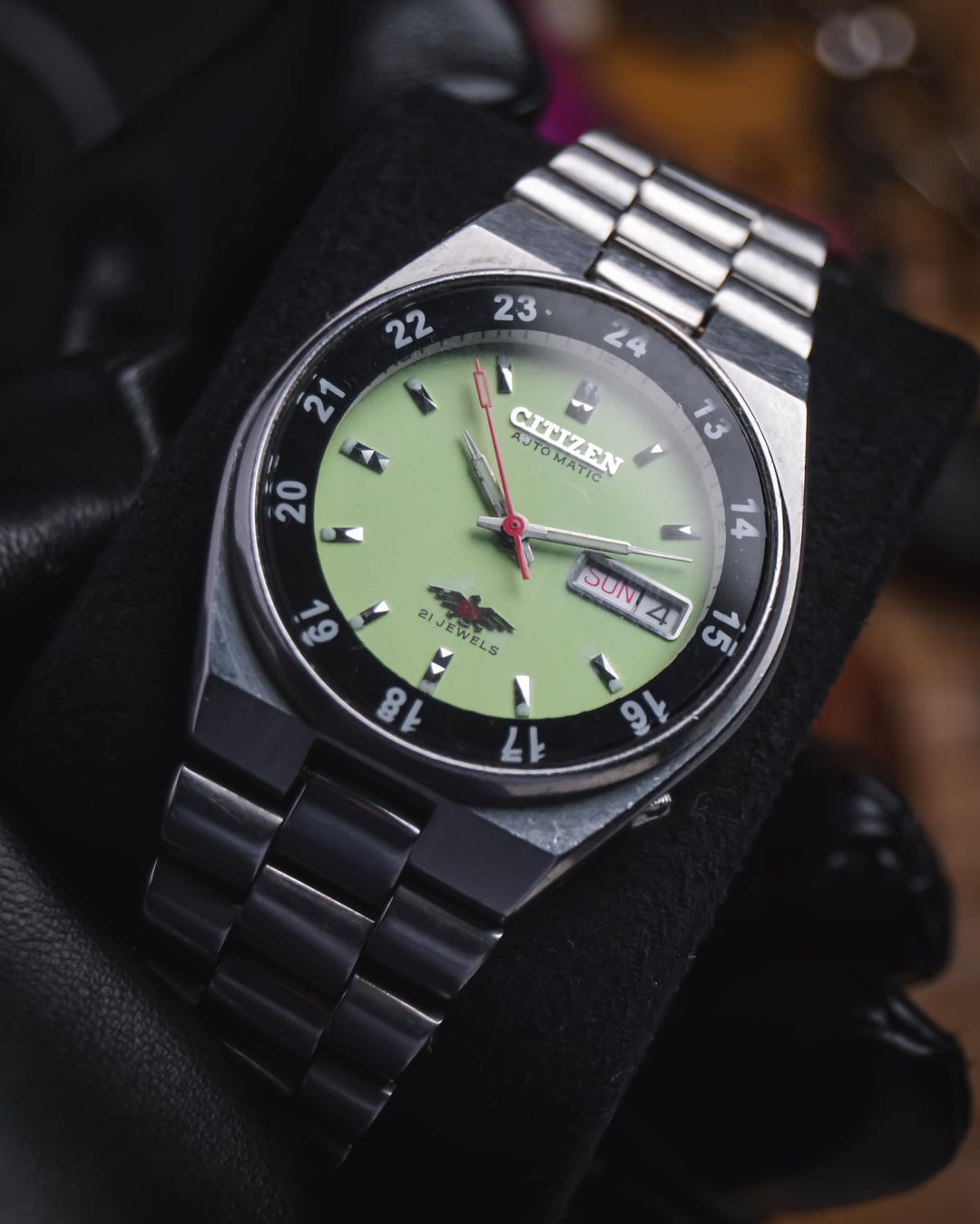 [Timestamp](https://postimg.cc/qN56yrGt) Hey Watchexchange! Up for sale is a **1992 Citizen Eagle 7 ref. 4-R13787**, a vintage automatic that perfectly captures the bold styling of early ’90s Citizen design. This particular example is especially fun thanks to its **luminous railway-time dial** — a quirky, practical feature that glows across the whole face when charged, making it a true conversation starter. The dial itself is a vibrant pale green with a full 24-hour track on the outer black ring. Applied **silver indices and syringe hands** give it a sharp, legible layout, while the red seconds hand and day/date at 3 o’clock add that extra pop of character. It runs on the robust **21-jewel Cal. 8200 automatic** — built by Miyota, Citizen’s own subsidiary — a movement known for reliability and longevity. Condition-wise, the watch remains unpolished till the date, keeping its original factory lines and edges. The crystal has been replaced with a new mineral glass for a cleaner look, while the original Citizen bracelet is still intact and wears comfortably. 🔹 **Dimensions** • Case Diameter: ***36mm*** **(without crown)** • Thickness: ***10mm*** • Lug Width: ***10mm*** **(integrated bracelet)** 💵 **Price:** $99 + shipping 🚢 **Shipping:** UPS (Worldwide) 📦 **Payment:** PayPal F&F or G&S (+4.5% fee paid by the buyer) or **bank wire**(US banks accepted) 📩 DM me for more pics or a custom timestamp. A true vintage Citizen oddball with its lume dial + railway time layout, this Eagle 7 makes for a unique and wearable collector’s piece. Follow my **Instagram** page through the link in my Reddit profile to see more vintage pieces and upcoming listings.