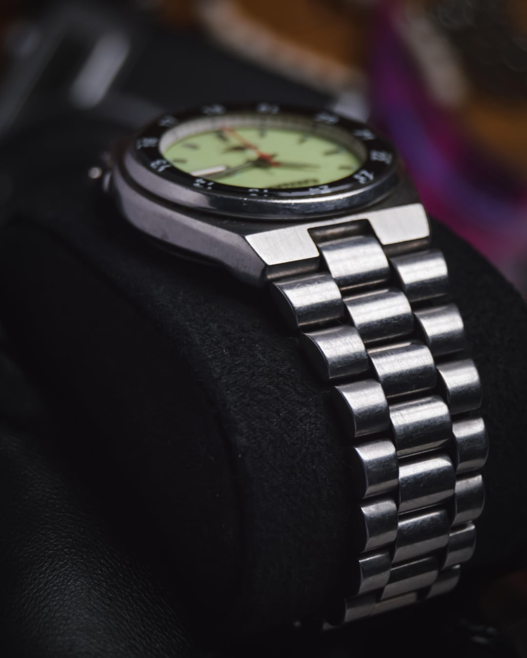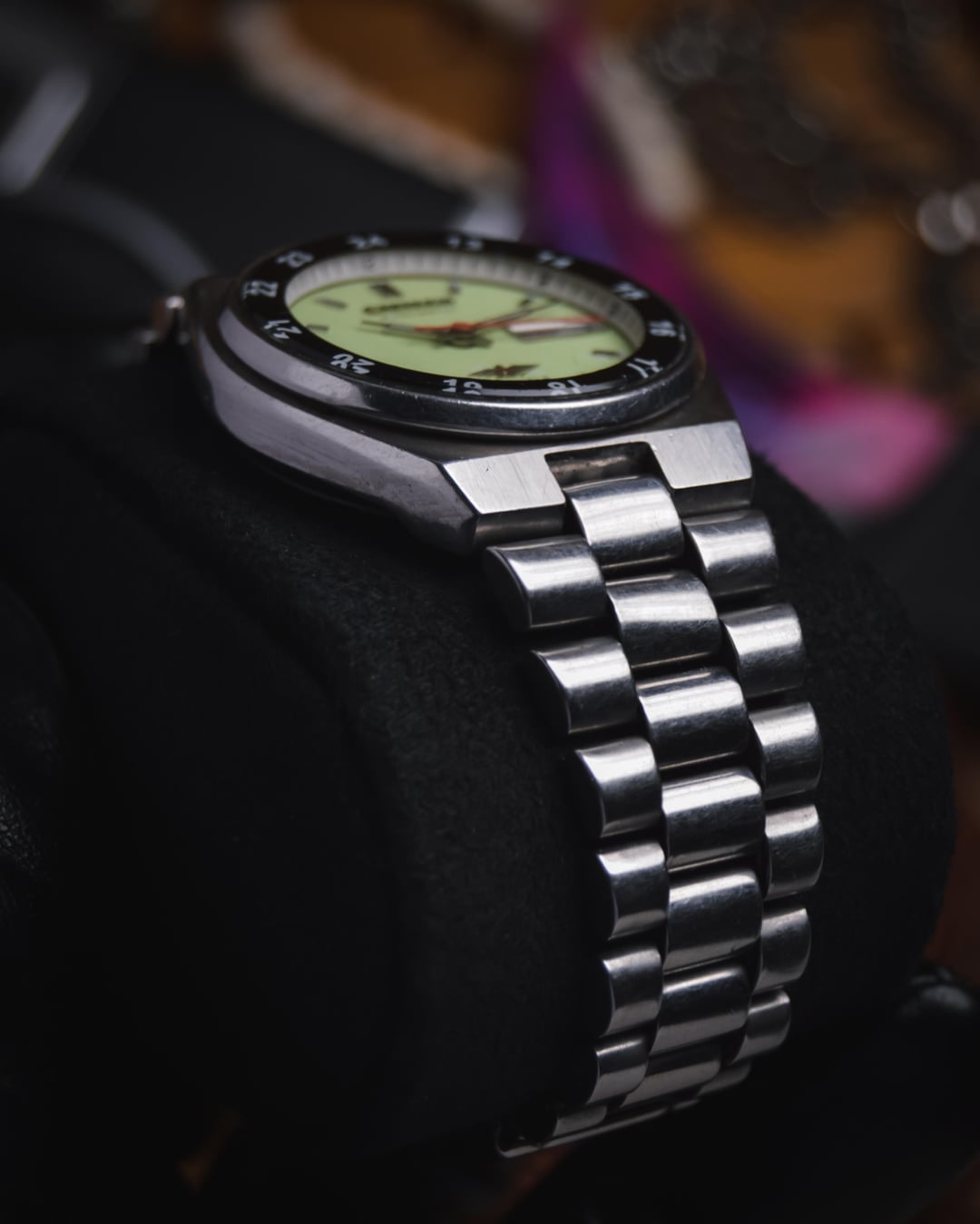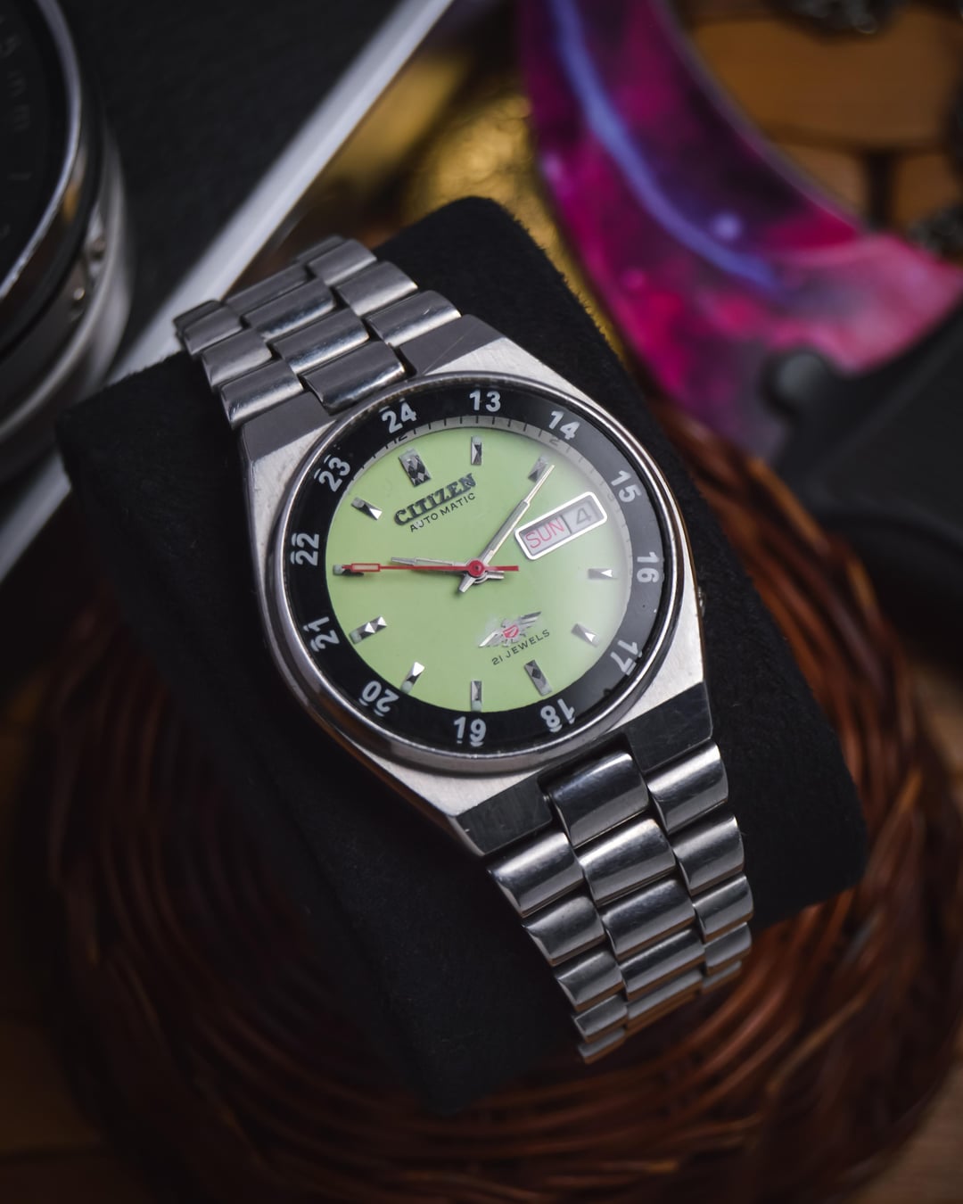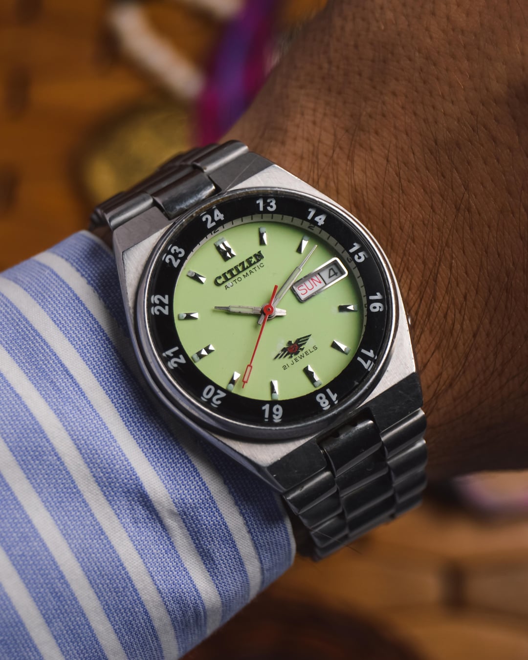 [Timestamp](https://postimg.cc/qN56yrGt) Hey Watchexchange! Up for sale is a **1992 Citizen Eagle 7 ref. 4-R13787**, a vintage automatic that perfectly captures the bold styling of early ’90s Citizen design. This particular example is especially fun thanks to its **luminous railway-time dial** — a quirky, practical feature that glows across the whole face when charged, making it a true conversation starter. The dial itself is a vibrant pale green with a full 24-hour track on the outer black ring. Applied **silver indices and syringe hands** give it a sharp, legible layout, while the red seconds hand and day/date at 3 o’clock add that extra pop of character. It runs on the robust **21-jewel Cal. 8200 automatic** — built by Miyota, Citizen’s own subsidiary — a movement known for reliability and longevity. Condition-wise, the watch remains unpolished till the date, keeping its original factory lines and edges. The crystal has been replaced with a new mineral glass for a cleaner look, while the original Citizen bracelet is still intact and wears comfortably. 🔹 **Dimensions** • Case Diameter: ***36mm*** **(without crown)** • Thickness: ***10mm*** • Lug Width: ***10mm*** **(integrated bracelet)** 💵 **Price:** $99 + shipping 🚢 **Shipping:** UPS (Worldwide) 📦 **Payment:** PayPal F&F or G&S (+4.5% fee paid by the buyer) or **bank wire**(US banks accepted) 📩 DM me for more pics or a custom timestamp. A true vintage Citizen oddball with its lume dial + railway time layout, this Eagle 7 makes for a unique and wearable collector’s piece. Follow my **Instagram** page through the link in my Reddit profile to see more vintage pieces and upcoming listings.