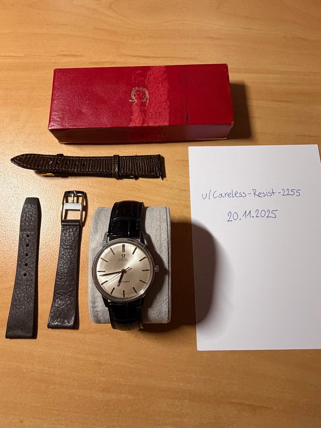 Hey, selling a 1966 Omega Seamaster, reference 165.002, bought on this forum two years ago in May 2023. Calibre 552 Serviced by a Professional watchmaker on February 2023 (according to the seller I bought it from). Stainless steel case in unpolished condition. Asking 1300€ shipped within EU. Can ship worldwide at additional cost. Included: - 1966 Omega Seamaster - Original brown factory bracelet and buckle - Black Omega alligator leather strap and buckle - Additional non-brand brown strap with golden buckle - Box, no papers