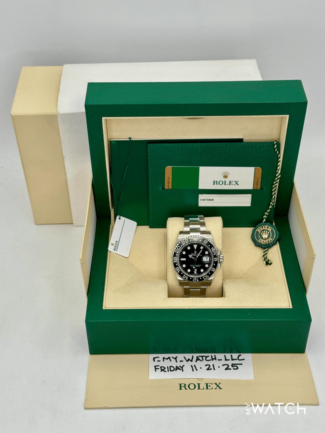 🔵**2018 Rolex GMT-Master II 40mm 116710LN Stainless Steel Black Dial** 🔵**TRADE or SELL us your luxury watch, all brands considered. Message me details.** **Includes the following:** **✔️Original Rolex Double boxed** **✔️Box and Papers - Yes** **✔️Warranty card dated 2018** **✔️Manual and Warranty booklets** **✔️Green and White Hang Tags included** **✔️Size: 8.0inch wrist (Full Links)** **✔️Watch is in excellent overall condition. Please see photos for details.** **✔️Trades welcome** Business Name: **My Watch LLC** LOCATION: Oak Park, Michigan ✔️[MyWatchLLC.com](http://mywatchllc.com/) for current inventory ✔️Google Business Listing [https://g.co/kgs/Cmd6FPW](https://g.co/kgs/Cmd6FPW) ✔️Business Hours M-F 9-6 ✔️Facetime/Video chat/calls welcome to view the watch interested. ✔️Contact: 248-422-0909 via text or call for quickest response. 🟢TERMS: Visit [MyWatchLLC.Com](http://mywatchllc.com/) for payments accepted 🟢REFERENCES/REVIEWS: We are well reviewed on all platforms from google, trust pilot, rolexforums, additionally we have 300+ reference in multiple FaceBook watch groups, reference checks welcome. 🟢SHIPPING: If you are not local, we offer Fully Insured FedEx overnight shipping in the USA for a fee. International shipping available.