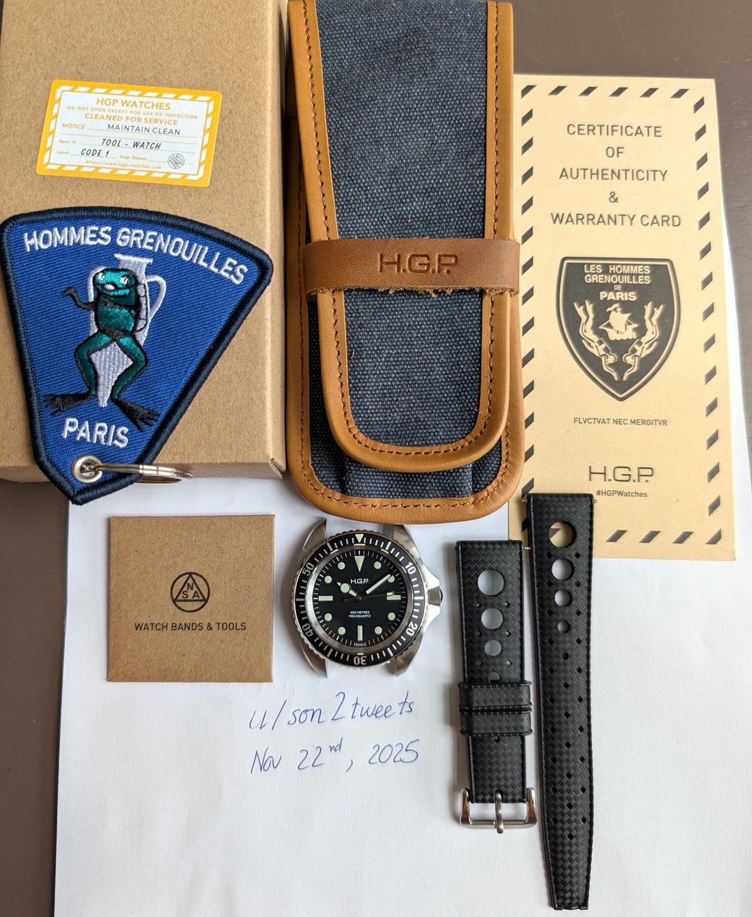 Hello WatchExchange, For sale is my H.G.P Diver 200m Mecaquartz watch in excellent cosmetic and mechanical condition. Super fun all rounder; from the beautiful Monnin case to the smooth sweeping low-maintenance movement, this watch has a lot of charm. Comes on vulcanized NBR rubber strap (like new) made for HGP by NSA. Full kit, including travel pouch and HGP key ring. Quick Specs: * 42 mm diameter x 47 mm lugs to lugs x 11.9 mm thickness | 20mm lug width * 200 m ≈ 20 ATM / Screw-down crown & Screw-in caseback * C3 Super-LumiNova® on all hands & indices * Smooth sweep Mechaquartz movement * Hand-assembled and tested in France Timestamp: [https://imgur.com/a/849lY6a](https://imgur.com/a/849lY6a) Priced at $190 OBO inclusive of shipping within Continental US via PayPal F&F or Zelle. Let me know if you have any questions. Thanks for looking!