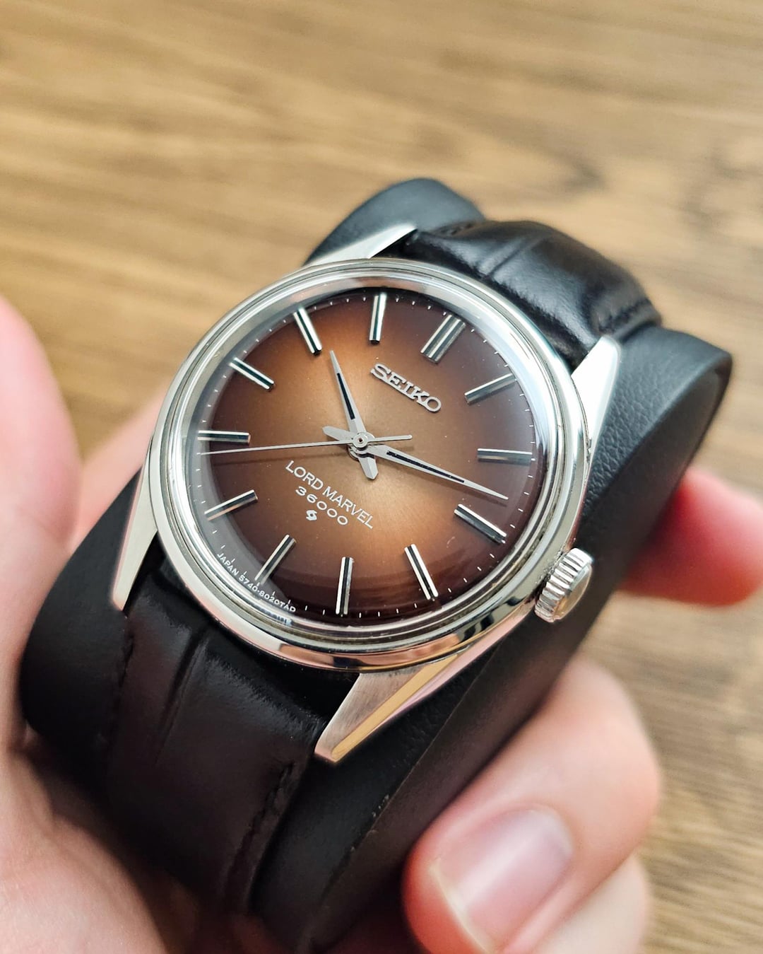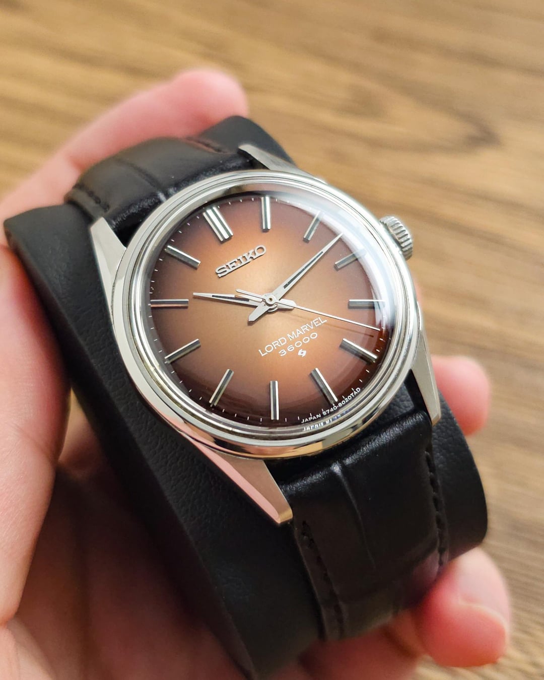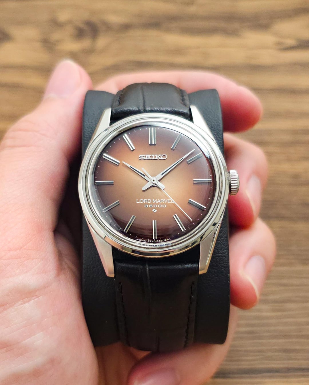 Up sale for my Seiko Lord Marvel 5740-8000 — the very first high-beat watch produced by Seiko, powered by the famous and reliable 5740C caliber. Back in the mid-20th century, most watch movements operated at 18,000 vph. As the race for greater precision accelerated, manufacturers pushed frequencies higher: first to 21,600, then 28,800, and ultimately 36,000. While Girard-Perregaux is recognized as the first to introduce a 36,000 vph movement (cal. 30.5, 31.5, and the well-known 32A), Seiko followed shortly after, proving it could provide the high-beat movement along with the Swiss brand. Watch details are provided as following: - Case size: 37.5 mm stainless steel - Thickness: 10 mm - Movement: Original manual-wind Seiko 5740C, high-beat 36,000 vph, 23 jewels - Strap: Black leather strap with a third-party buckle The dial has been professionally redialed with a striking tiger-eye effect, transitioning from deep chocolate to a glowing amber that feels alive on the wrist. The sunburst finish reflects light like polished gemstone, giving the dial incredible depth and richness. It blends vintage character with refined elegance, making the watch feel both classic and uniquely expressive. All other dial elements including the text, applied indices, and dauphine-style hands remain faithful to the original design. The case has been serviced and is in good condition overall. The edges are still sharp and crisp. The top side of the case shows some small dents, but they do not affect the watch’s performance. The movement has been serviced as well and is keeping excellent time. The watch comes without its original box or papers. A paper box will be included. Price: $375 + $55 (DHL/UPS Express, tariff fees covered). Payment via PayPal Goods & Services (+4.6% fee paid by the buyer). No trades at this time. Feel free to reach out with any questions or if you're interested. Have a nice day everyone!