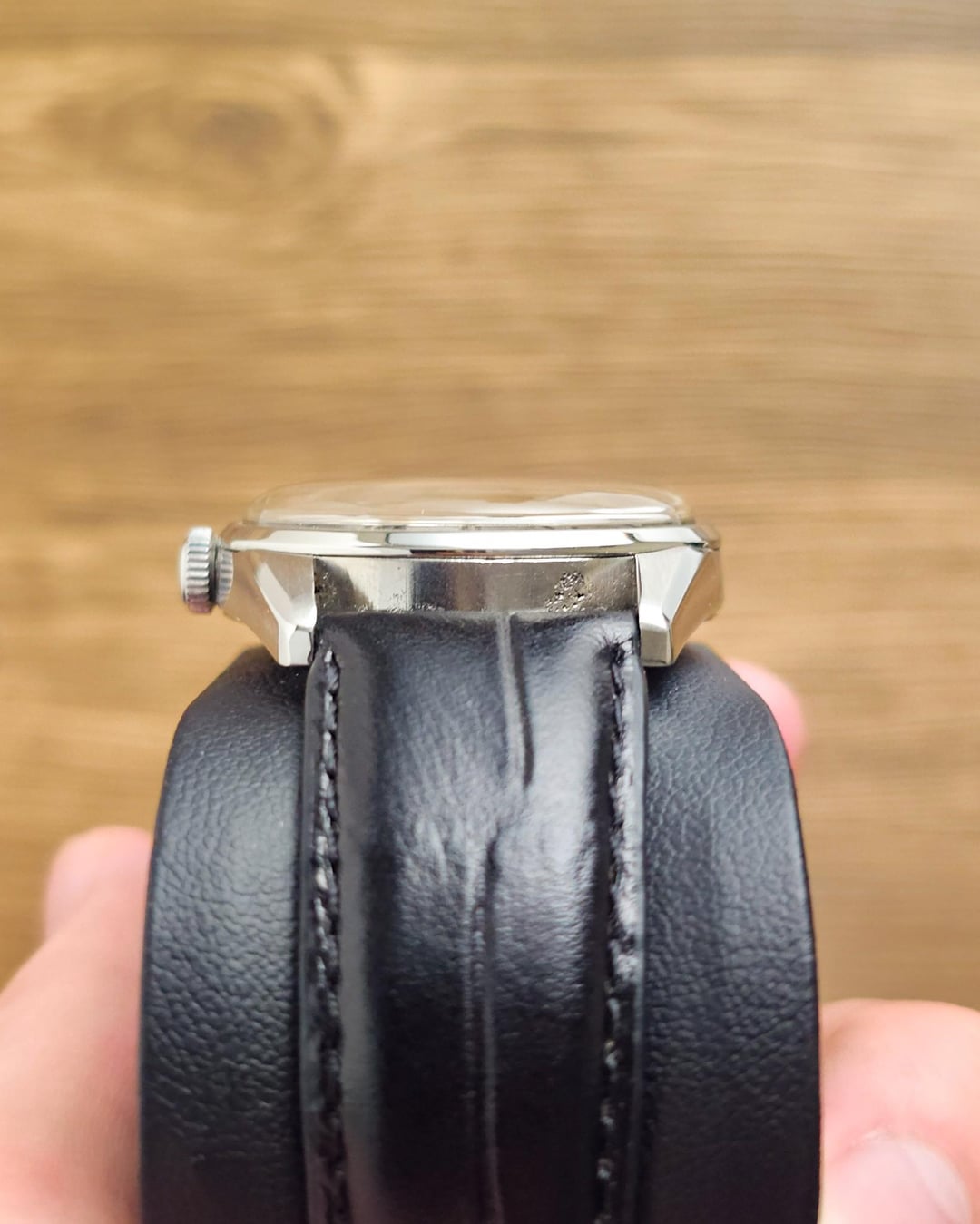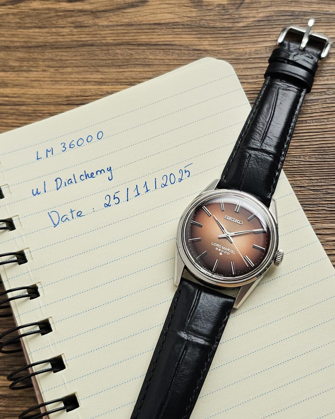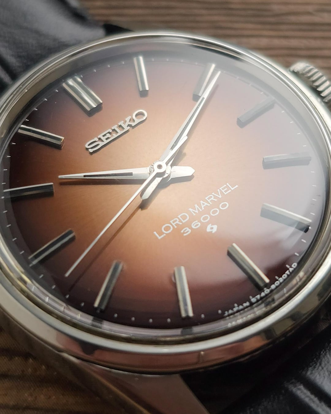 Up sale for my Seiko Lord Marvel 5740-8000 — the very first high-beat watch produced by Seiko, powered by the famous and reliable 5740C caliber. Back in the mid-20th century, most watch movements operated at 18,000 vph. As the race for greater precision accelerated, manufacturers pushed frequencies higher: first to 21,600, then 28,800, and ultimately 36,000. While Girard-Perregaux is recognized as the first to introduce a 36,000 vph movement (cal. 30.5, 31.5, and the well-known 32A), Seiko followed shortly after, proving it could provide the high-beat movement along with the Swiss brand. Watch details are provided as following: - Case size: 37.5 mm stainless steel - Thickness: 10 mm - Movement: Original manual-wind Seiko 5740C, high-beat 36,000 vph, 23 jewels - Strap: Black leather strap with a third-party buckle The dial has been professionally redialed with a striking tiger-eye effect, transitioning from deep chocolate to a glowing amber that feels alive on the wrist. The sunburst finish reflects light like polished gemstone, giving the dial incredible depth and richness. It blends vintage character with refined elegance, making the watch feel both classic and uniquely expressive. All other dial elements including the text, applied indices, and dauphine-style hands remain faithful to the original design. The case has been serviced and is in good condition overall. The edges are still sharp and crisp. The top side of the case shows some small dents, but they do not affect the watch’s performance. The movement has been serviced as well and is keeping excellent time. The watch comes without its original box or papers. A paper box will be included. Price: $375 + $55 (DHL/UPS Express, tariff fees covered). Payment via PayPal Goods & Services (+4.6% fee paid by the buyer). No trades at this time. Feel free to reach out with any questions or if you're interested. Have a nice day everyone!