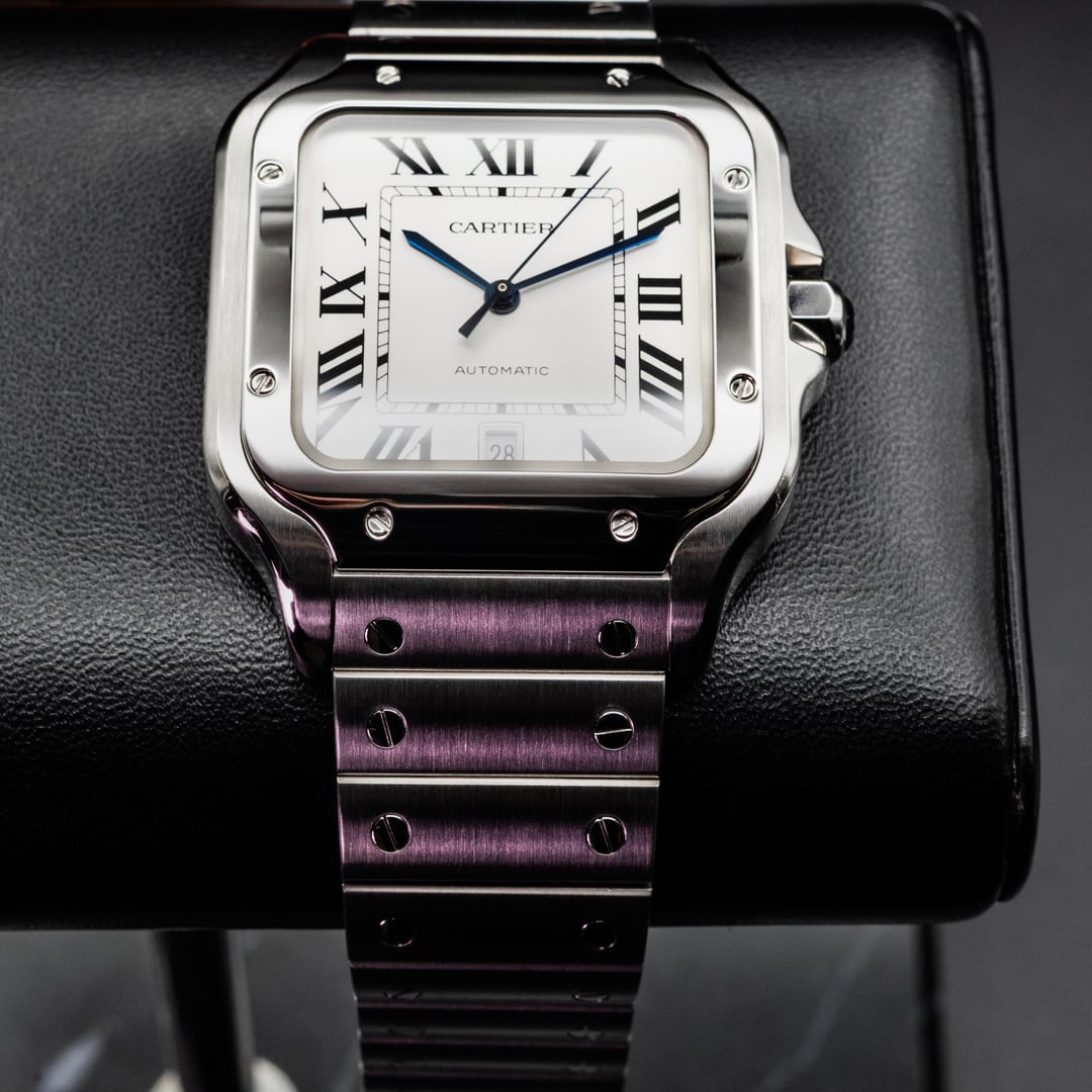 [https://www.dropbox.com/scl/fo/h01aktiazkdq1b5itn0uq/ADHj\_jrrH6vm3LvQBi7z4To?rlkey=3ngn23o224y3daci35133531m&st=bxerorhn&dl=0](https://www.dropbox.com/scl/fo/h01aktiazkdq1b5itn0uq/ADHj_jrrH6vm3LvQBi7z4To?rlkey=3ngn23o224y3daci35133531m&st=bxerorhn&dl=0) **SANTOS DE CAR. LARGE MODEL STAINLESS STEEL SILVERED OPALINE DIAL 39.8MM - BOX AND PAPERS** **.** Here is a beautiful and easy wearing Santos model that has endless range; it can be worn casually with ease, or dressed up if need be. 39mm is a great size for most wrists, and this one also comes with an extra leather strap on the deployant to change up the look! **.** * **Reference: WSSA0009** * **39.8mm stainless steel case** * **Caliber 1847 MC, automatic movement** * **MSRP: $8,650 plus tax** **.** ***Contents*****:** Watch, box, 2018 warranty card, fully linked stainless steel bracelet, and extra OEM calfskin leather strap on deployant clasp.***One year service warranty is included at no charge via Bo Knows Luxury, LLC, beginning on the date of purchase!*** . **Condition:** Excellent, near mint condition with faint wear on the case, bezel, and bracelet.The photos in this album were taken using a macro setup to ensure an accurate representation of the watch's condition. This timepiece has been professionally pressure-tested and thoroughly validated to confirm all functions operate within factory specifications. . ***Price: $6,350.*** *Fully insured overnight shipping included in the US. Payment accepted via:* * *Bank Wire* * *Zelle* * *All major credit cards* . Please message me directly to confirm availability before marking sold! USAF veteran owned company with hundreds of successful deals done, and plenty of references available to any interested buyers. Thanks for looking! 🙏