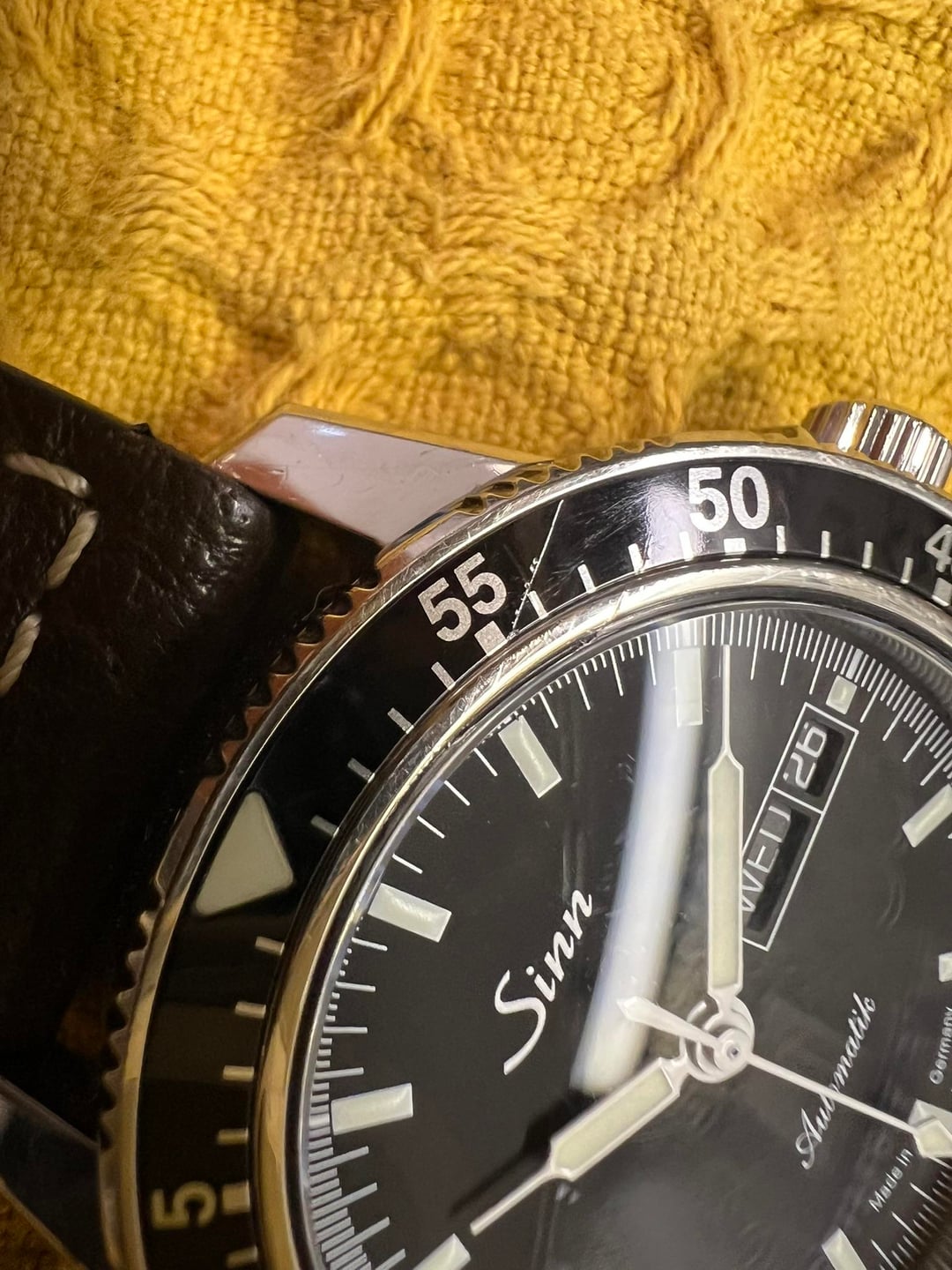Slimming down my collection again, selling my Sinn 104 black dial on Rios brown leather strap. Watch only. The bezel has a few hair scratches, most notably at the 55 and the 18 minute marks. Case has normal wear marks. Please see all pictures. The watch works as it should. Price: **$999** shipped Conus *\*\*\*Will ship after Thanksgiving weekend\*\*\** Payment: Zelle (preferred), PayPal F&F, or PayPal G&S (Buyer pays fees) Not interested in trades at this time.