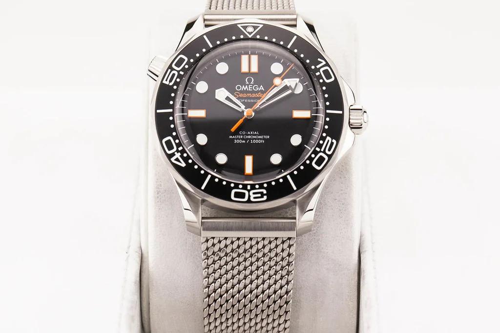 Up for sale is a brand new Omega Seamaster 300 42mm Black Aluminum Dial & Bezel with Orange Accents on Mesh Bracelet, reference # 210.30.42.20.01.018. It comes complete with all boxes, papers, booklet, hang tag and Omega Warranty Card dated November 2025.