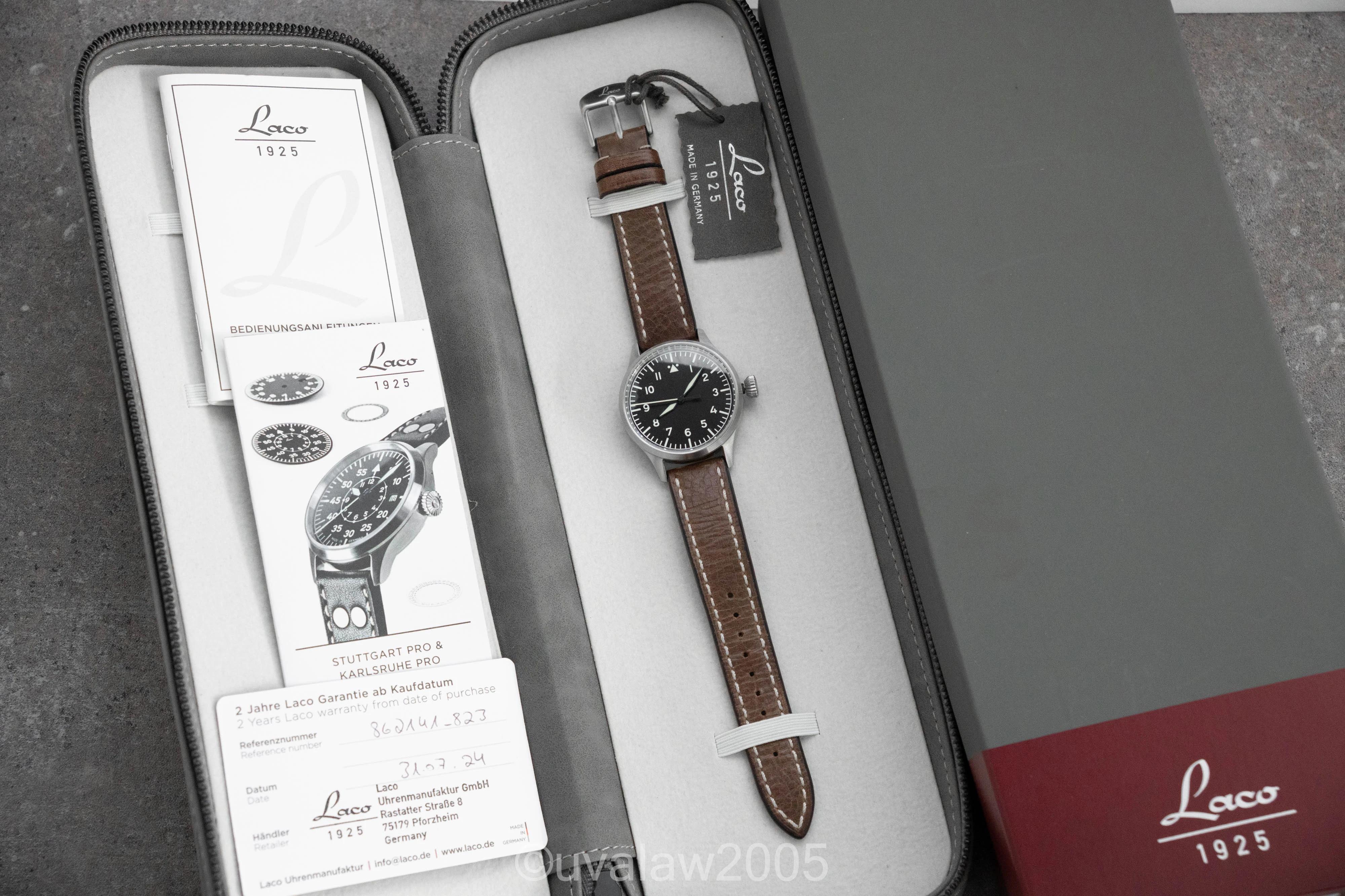 For sale is my near mint Laco Flieger Stuttgart Pro. This is the 37mm model, just under 11mm thick, 44.5mm lug-to-lug, 18mm lug width, and 200-meter water resistance via the screw-down crown.