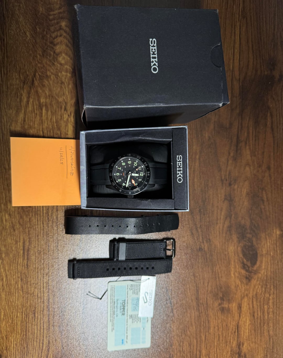Up for sale is my 39.4mm Seiko 5 Automatic GMT SSK025. This gorgeous textured dial piece was added to my collection due to the need of a black watch. It doesn’t get any wrist time anymore, so I figured I’d give someone else a chance to show it off. It is in like-new condition with no scratches on the crystal or case. Also comes with the original strap, box and papers. Asking price is $285 shipped to the CONUS. Payment: Zelle or PayPal F&F