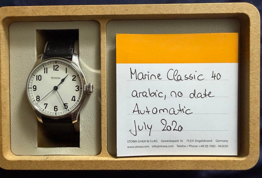Another one has to go! Selling my Stowa Marine Classic 40 case diameter 40.0 mm height 10.2 mm strap width 20.0 mm lug-to-lug size 48.6 mm waterproof up to 5 ATM material case stainless steel surface polished crystal sapphire crystal dial white hands temperature-blued movement caliber automatic Sellita SW 200 version basic mechanism automatic specific features screwed case back In excellent shape and keeps very good time! Just a bit too large for me. See pics for details. Retails from Stowa for about $825 UDS plus tax, plus shipping, plus tariffs if in U.S. $600 shipped to CONUS. Thanks for looking!