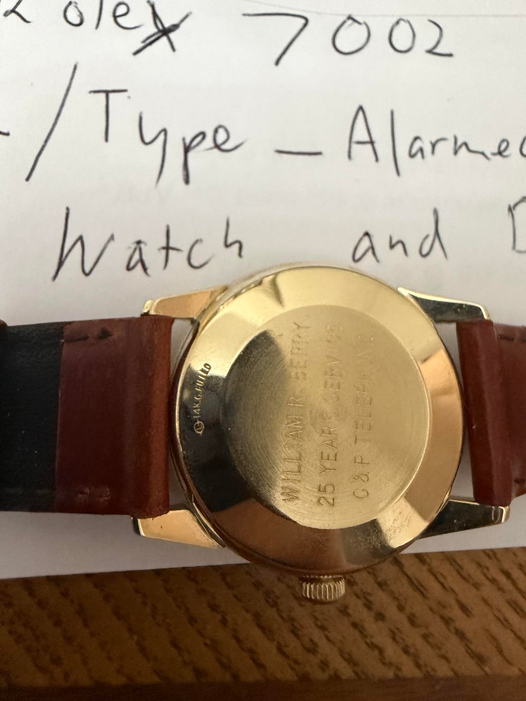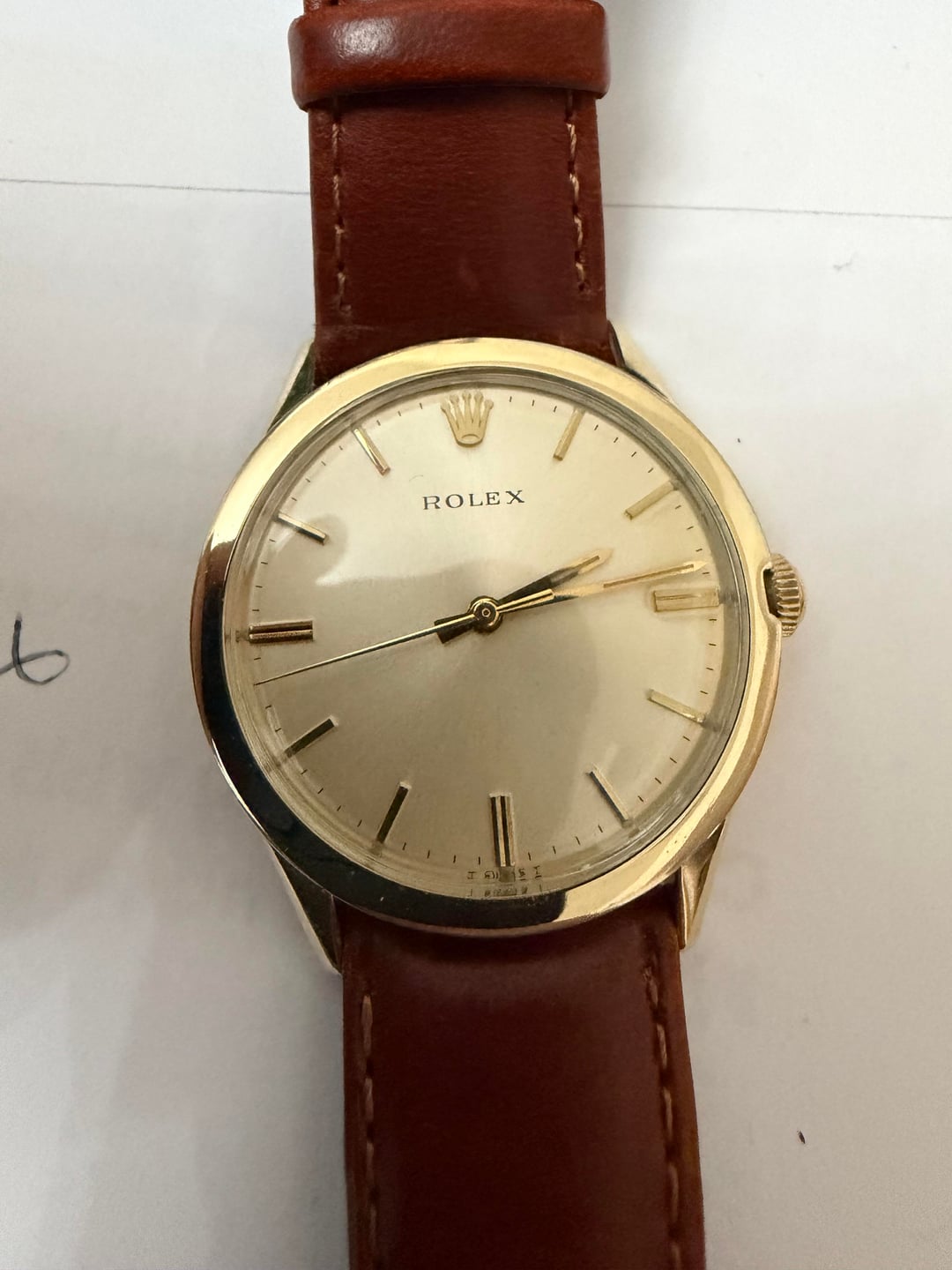 Reference number 7002, produced in the 1960s, was specifically crafted for the U.S. market as a corporate gift. Powered by the in-house Rolex caliber 1520 automatic movement, this self-winding watch boasts 17 jewels, a smoothly sweeping second hand, and has been adjusted to two positions. Operating at a frequency of 18,000 vibrations per hour, the watch offers an impressive 44-hour power reserve. The dial is a striking champagne hue, accented with gold hour markers and gold minute/second track. The gold hands are perfectly matched to the overall design, and the iconic Rolex crown logo sits proudly at the 12 o'clock position, with the Rolex name signed at the top of the dial. The watch is encased in a 35mm round case with a classic lug design, crafted in 14K yellow gold fill, providing both elegance and durability. Asking Price: $3000 + Label
