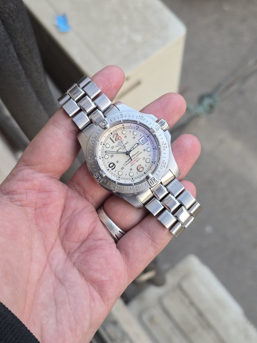 [WTS] Breitling Superaocean 44mm Steelfish A17390. Up for sale is a Breitling Superaocean 44mm Steelfish A17390 Size: 44mm Condition: Watch is in great condition overall. The sapphire crystal is in perfect condition with no scratches or chips. The dial is clean with no imperfections. Big case at 44mm with 2000M of water resistance. No deep scratches or dings to the case. The bracelet is fully linked.Automatic movement is keeping good time with no issues. No service history. No box, no papers. Please consider these pictures as part of my description. My askig is 1400$Usd shipped . Payment Accepted through wire , Zelle /paypal f&f only Shipping eta is 7-10 days.