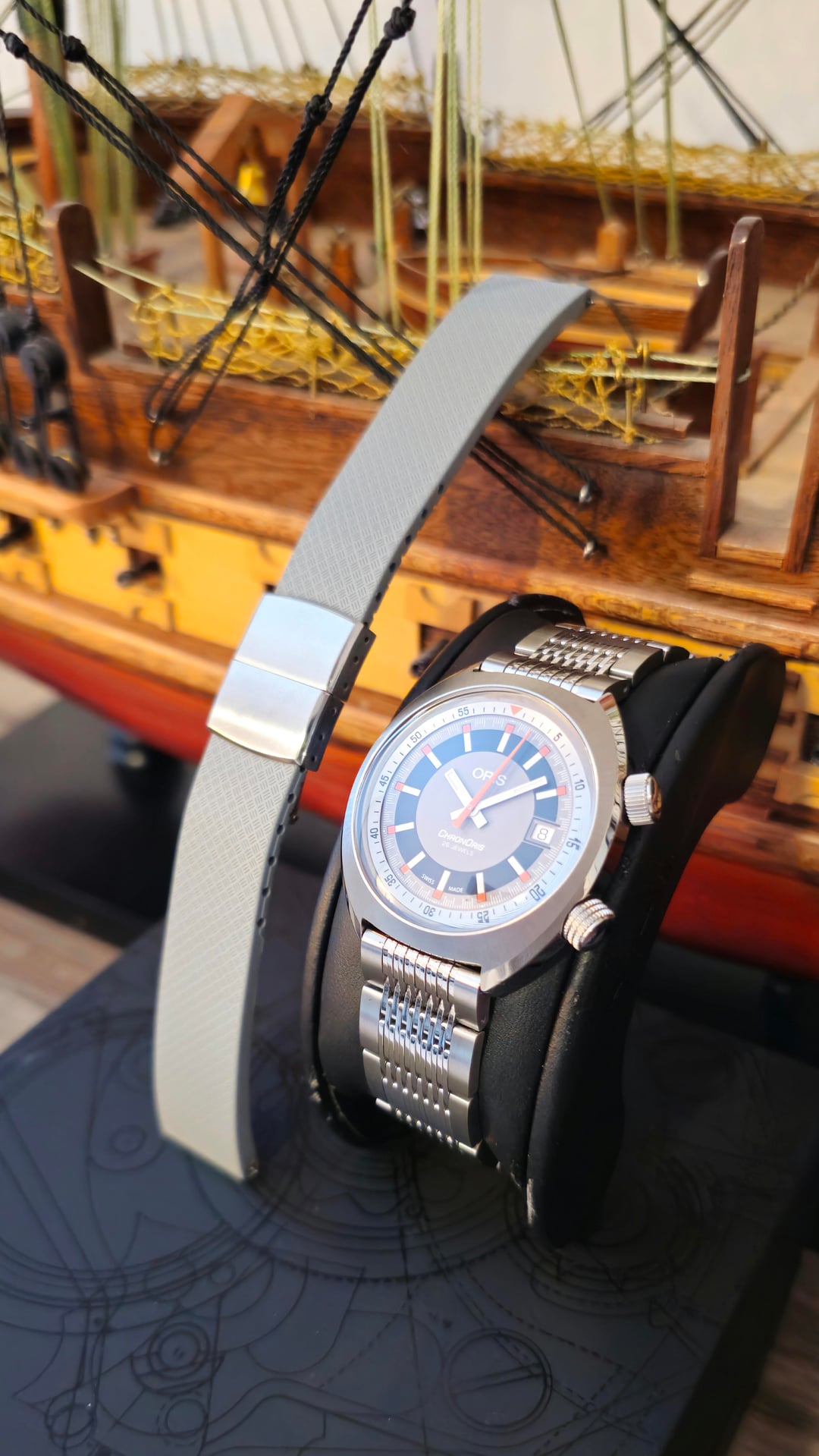 Howdy watch Fam! Up for grabs is my Oris Chronoris on the bracelet with Oris Nato and FKM CTS rubber strap and full trimmings (Inner/outter box, warranty card, manual, extra link, etc) The 120 click Inner roating bezel is so much fun to tinker with and along with the perfect size/thickness at 39mm/12mm respectively makes this watch special. It exudes that quirky 70s fun and combines it with modern Oris build quality. Ill be sad to see this one leave, I just have not thrown it into rotation much recently and need to cull the herd a bit. The model of the USS Constitution is not included of course! My example is in excellent shape, the beautiful brushed bezel which gets really dinged up in these is in excellent shape, with only the tiniest weat showing at maybe 1 o'clock ish and 3 o'clock ish, tried my best to photograph it but it's really hard to see. The case is in great crisp shape and the crystal is perfect. Bracelet has minor usual desk diving wear, along with the FKM rubber strap clasp. $1,750 MSRP without the bracelet back in the day, pick this beauty up for over a $1k off! First $745 USD PayPal F&F takes it shipped and insured. NO TRADES. CONUS only please. Happy to PM ya pictures of the watch set to random times upon your request for verification of possession. I also have loads more pictures, pictures are an extension of the description. Thanks for looking!