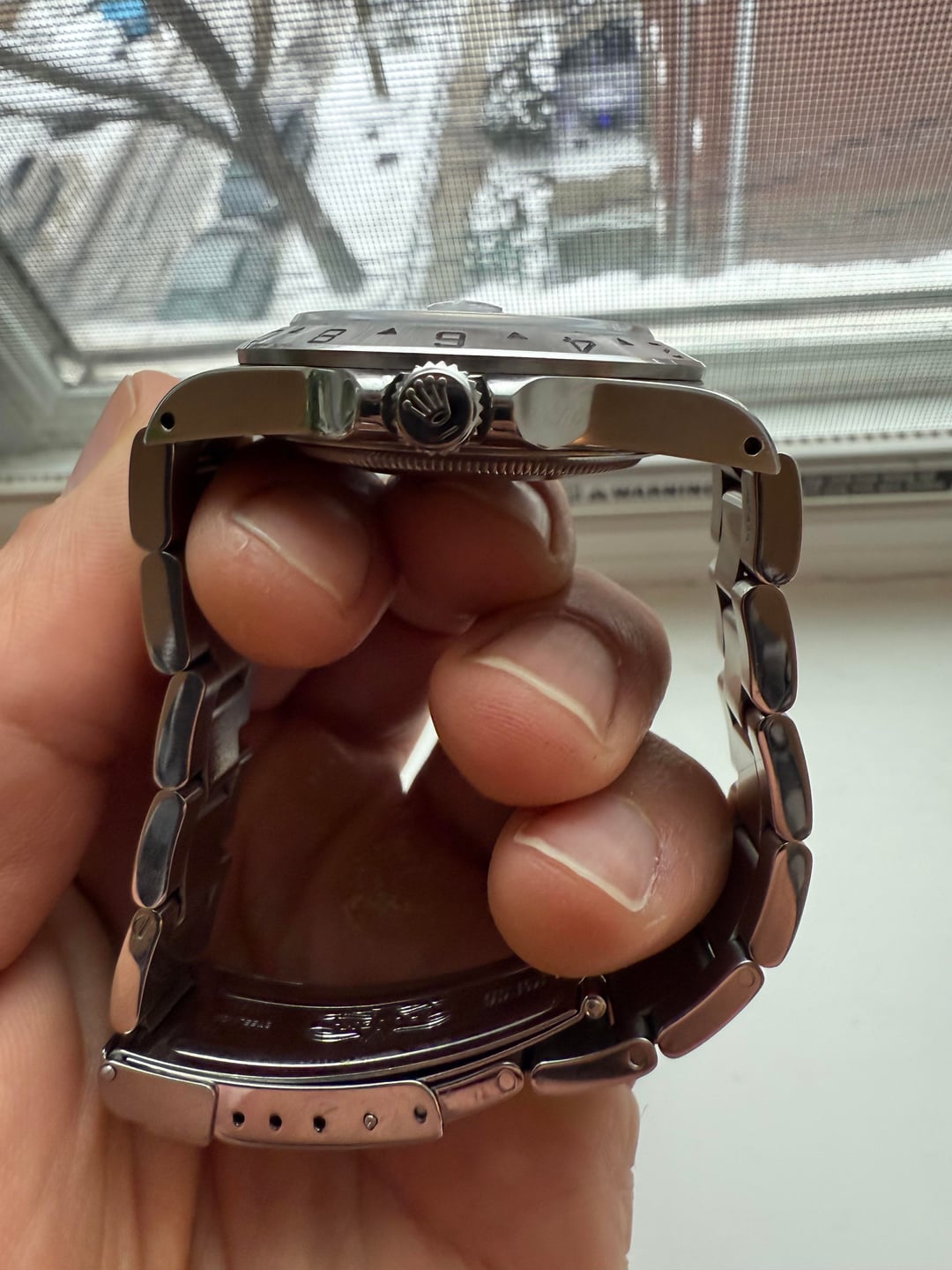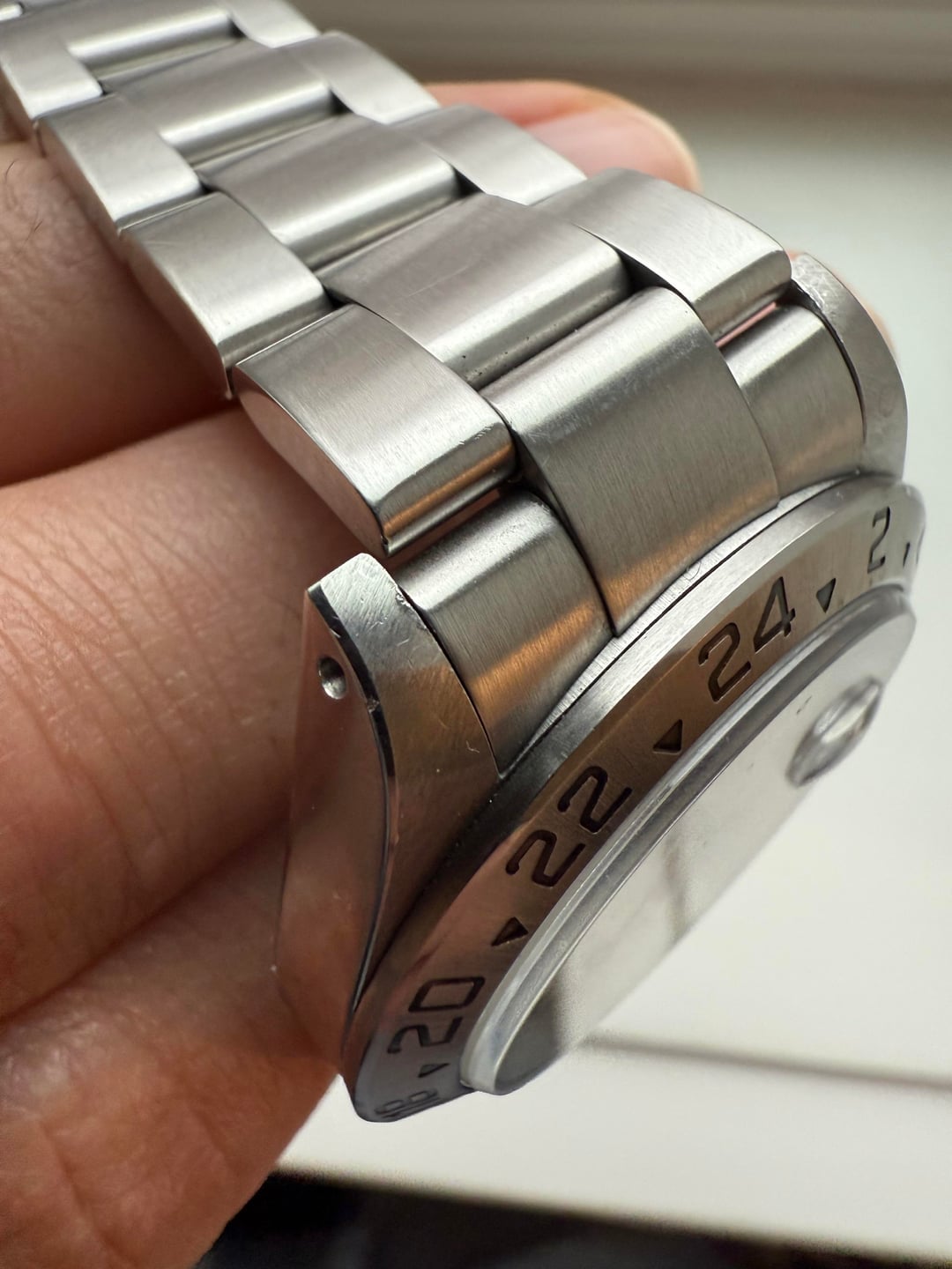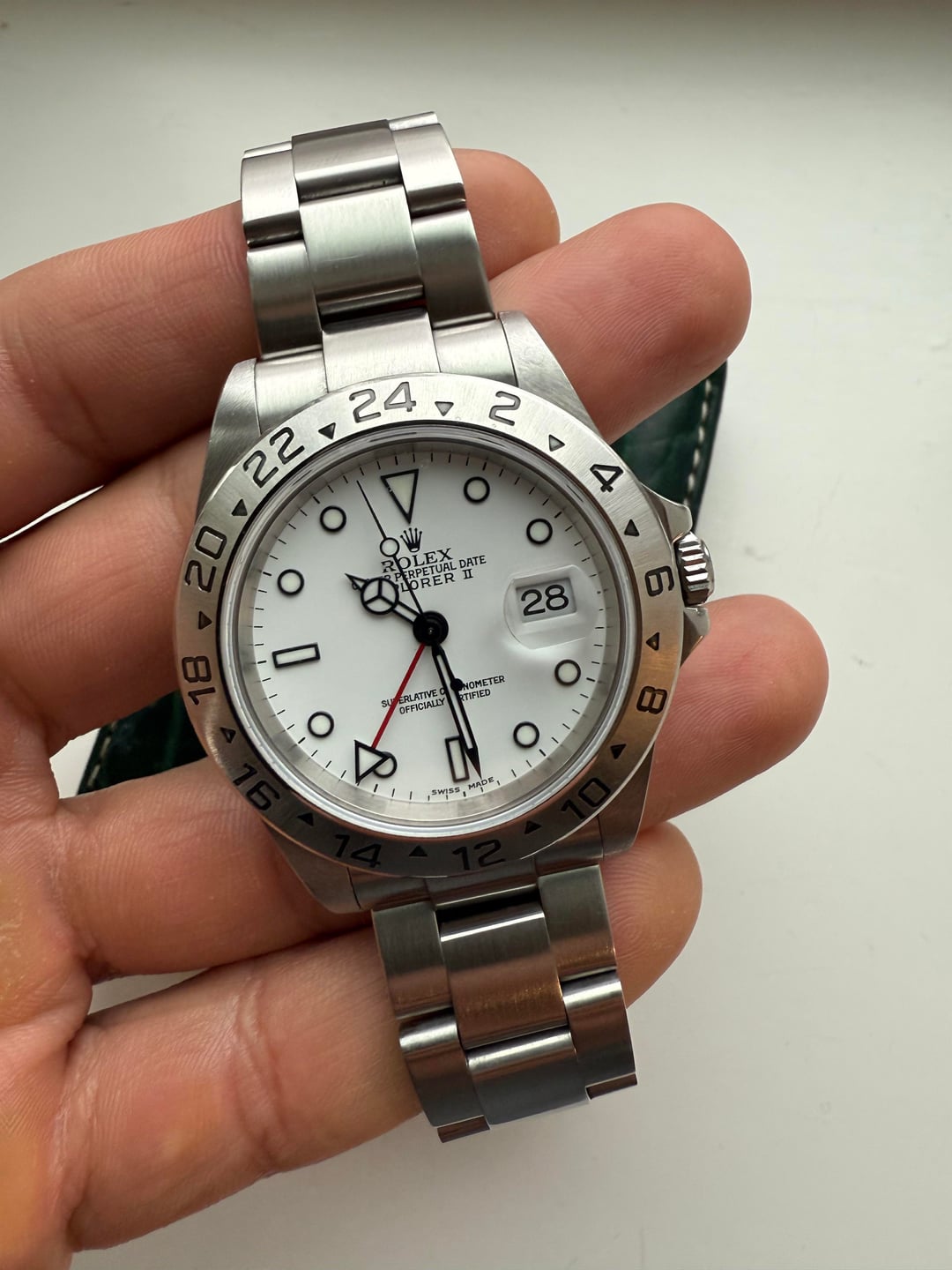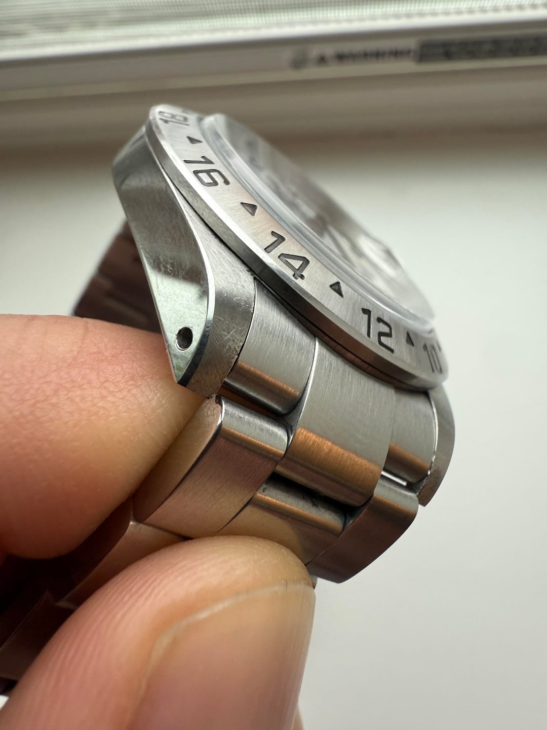 Video: [https://imgur.com/a/Uqf6JAN](https://imgur.com/a/Uqf6JAN) Timestamp: [https://imgur.com/a/XXwUwBv](https://imgur.com/a/XXwUwBv) Selling one of my favorite watches I've ever owned - my 16570 Polar Explorer ii P Serial from 2001. Coveted solid end links / holes case combo. The watch is in excellent unpolished condition. I truly have not seen another 16570 posted here with as sharp of a case and thick lugs as this one. This is my go anywhere, do anything watch. Perfect proportions on the bracelet, and my favorite watch to wear on a NATO strap in the summer. This one was meant to be a keeper for me. I had it serviced by Rolliworks in November 2024 with a complete service of the movement and replacement of the mainspring. I have all paperwork for the service in my name, along with the replaced mainspring, amounting to $875 before tax. Still has a year left of warranty that will be transferred to the new owner. All will be included with the watch. No box or original warranty papers. Known flaws: The bottom two lugs have light scratches from strap changes and there is a small nick on the bottom 9 o'clock side of the case (shown in pictures). I am asking $8,250 shipped. Willing to meet for a face to face transaction in the Chicagoland area.
