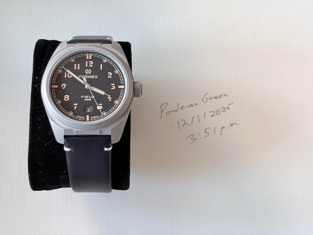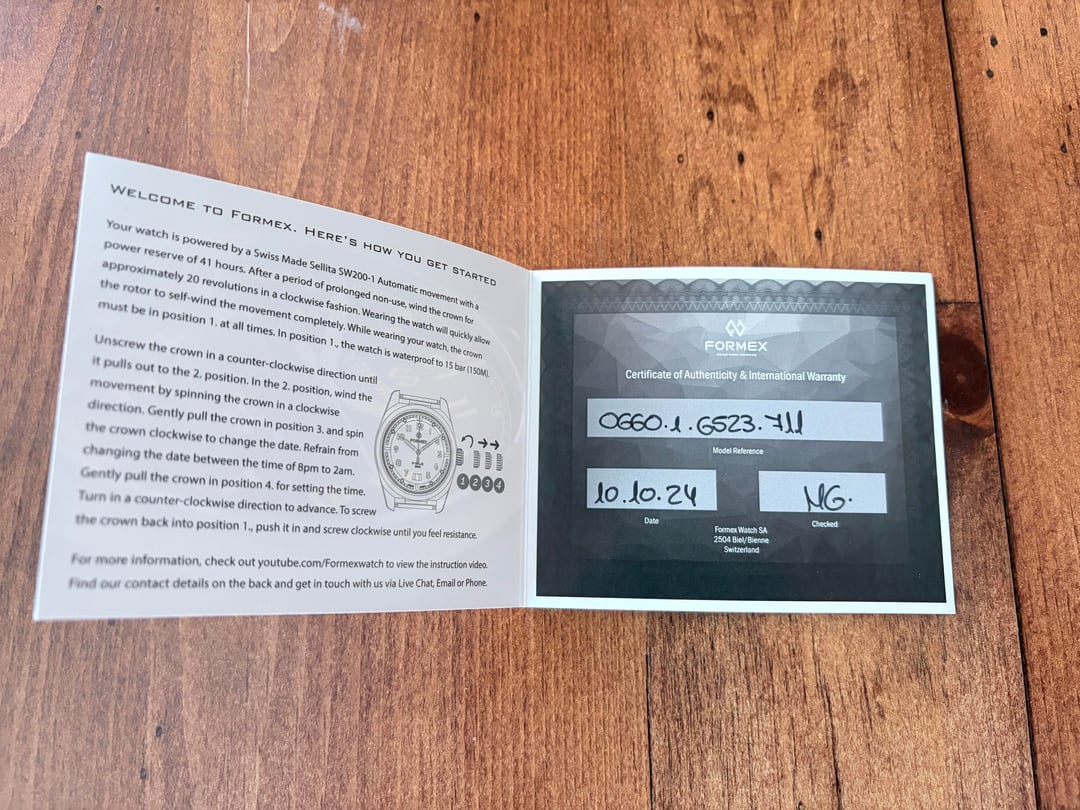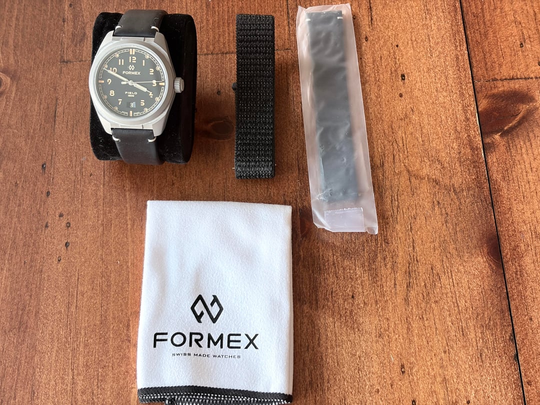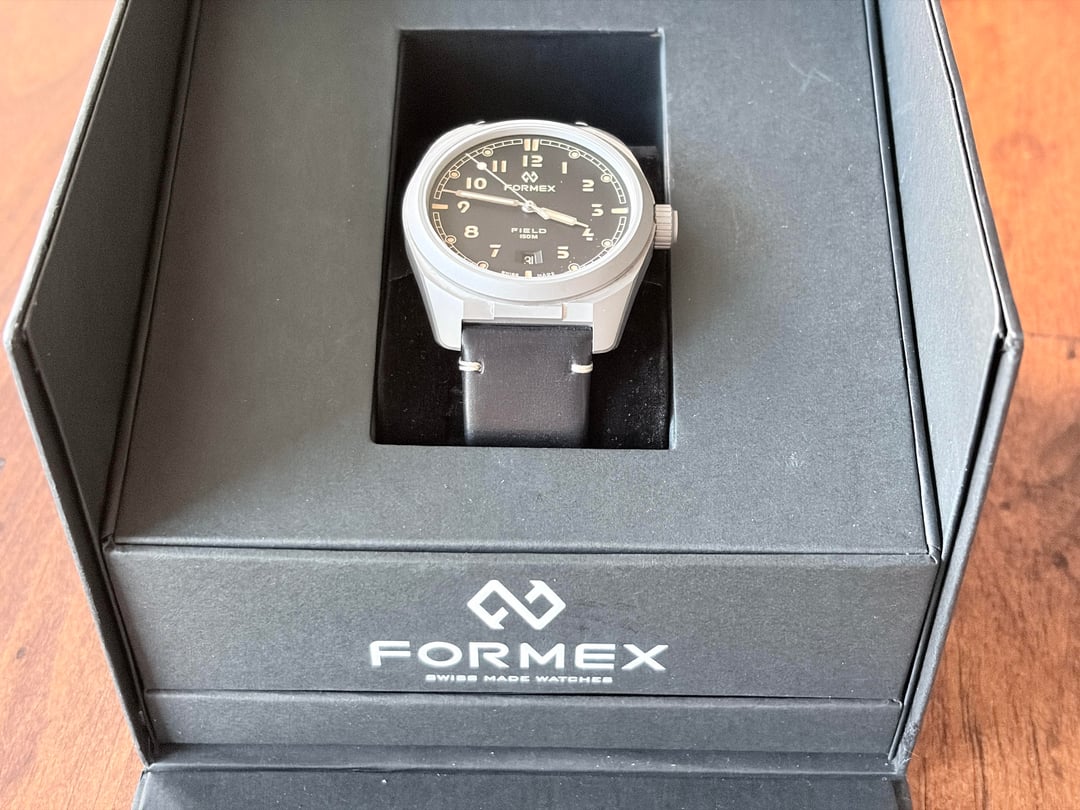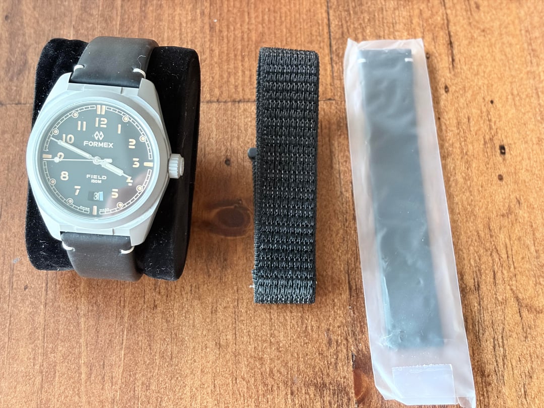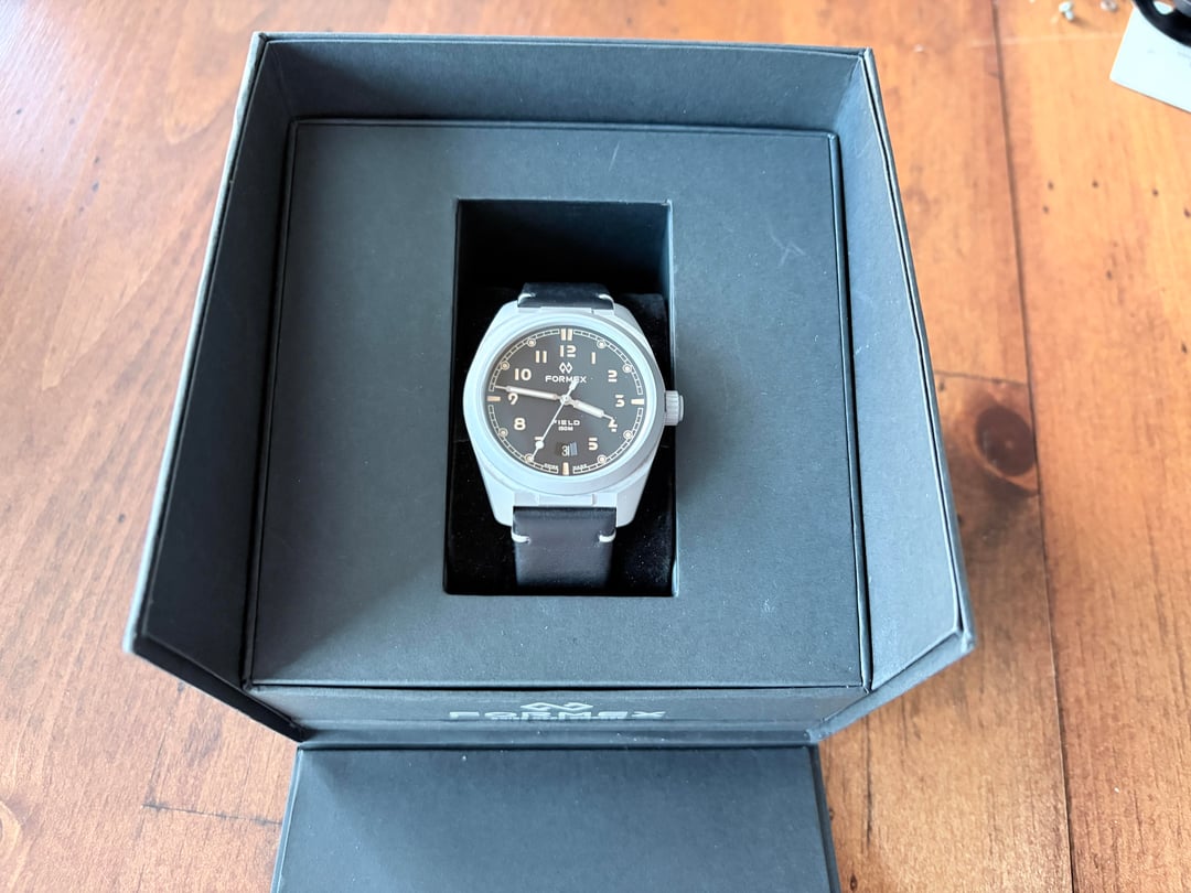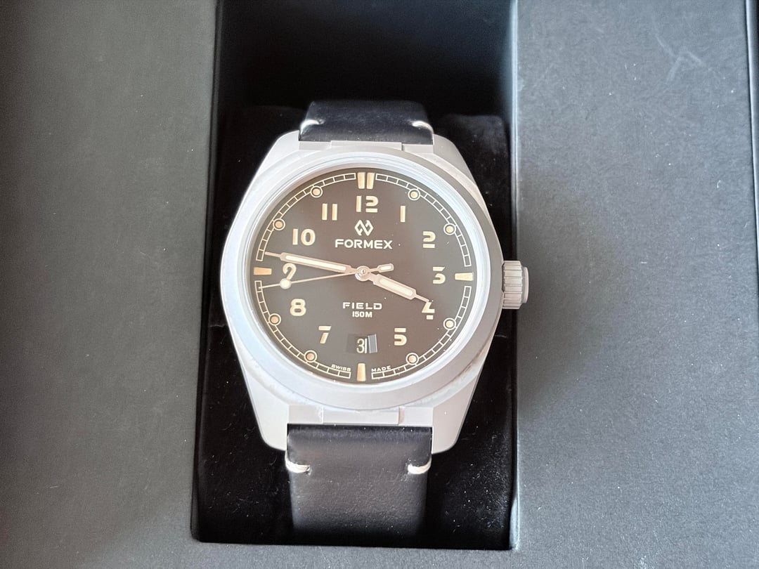Selling my Formex Field Watch in Black Dial. The watch is working great and I purchased it in October 2024. It is in very good condition and keeps good time. It is incredibly lightweight and comes with two factory straps - leather and the fabric band - both in black. Comes with all the papers and original warranty information. Selling for $765 with ground shipping via UPS. Purchased directly from Formex. The one and only owner.