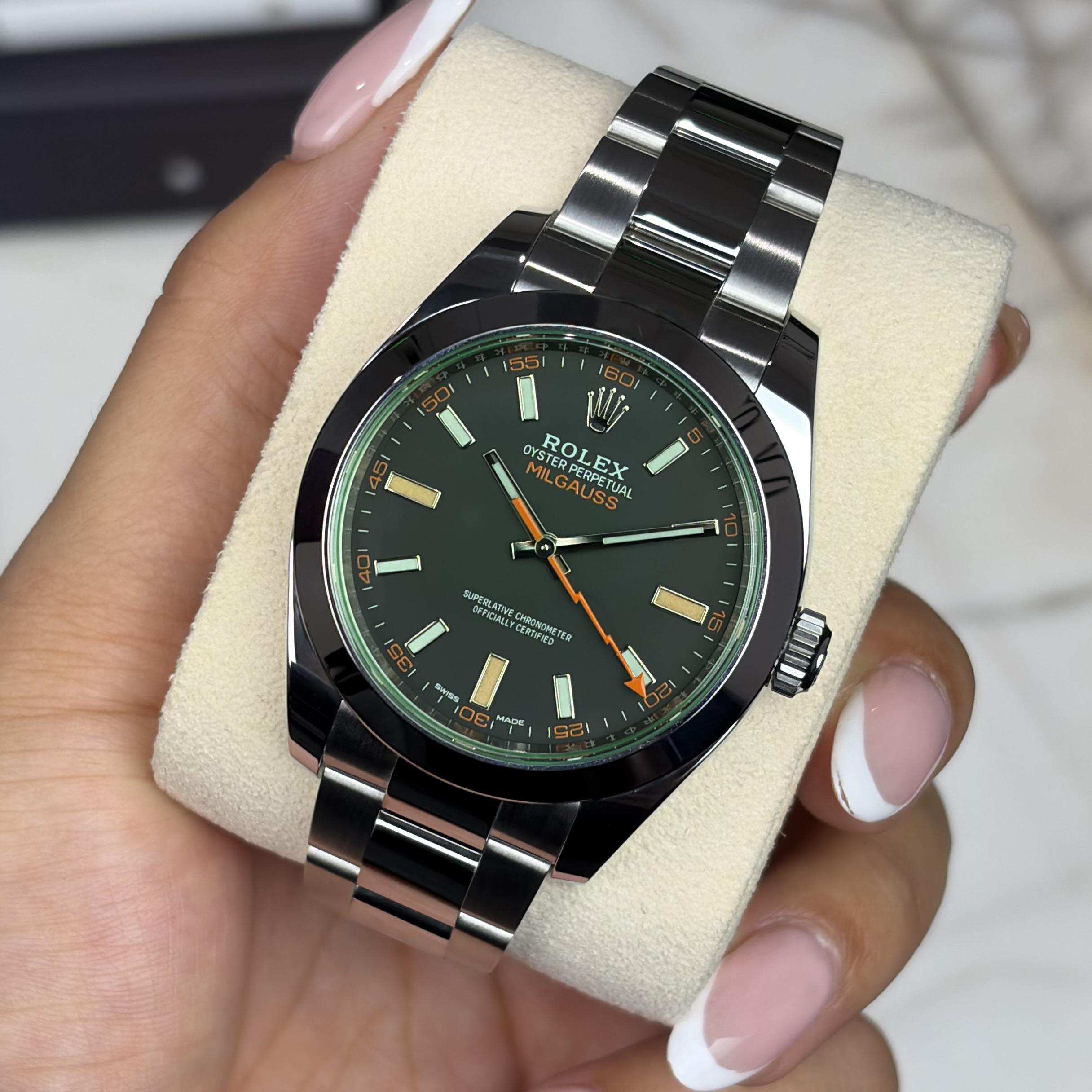 Timestamp: https://imgur.com/a/y4HwgJs Album: https://imgur.com/a/OjAiiUK ________________________________________________________________________________________ The Rolex Milgauss 116400GV stands out with its distinctive black dial, vibrant orange lightning-bolt seconds hand, and the signature green-tinted sapphire crystal. Designed for magnetic resistance up to 1,000 gauss, it blends scientific heritage with unmistakable Rolex character. This example is in mint condition with extremely light signs of wear and comes as a partial set, including the watch, hangtag, white tag, and booklet. This watch measures 40mm diameter, ~49mm lug to lug, and ~13mm thick. **Condition:** Mint condition with extremely light signs of wear. See pictures for the most accurate representation of condition. **Includes:** This example comes as watch, tags & Milgauss booklet only. _________________________________________________________________________________________ **Price:** **9,000** **Shipping:** Free shipping to US addresses! I'm willing to ship internationally at an additional cost to the buyer. *Local pickup available at our Scottsdale, AZ office. Sales tax may apply.* **Payment:** Wire, Zelle, Crypto, or CC (with 4% fee). **Trades:** Yes, open to trades up or down for modern Rolex, AP, or Patek Philippe. Thank you for your consideration and feel free to reach out with any questions! -Aneisa