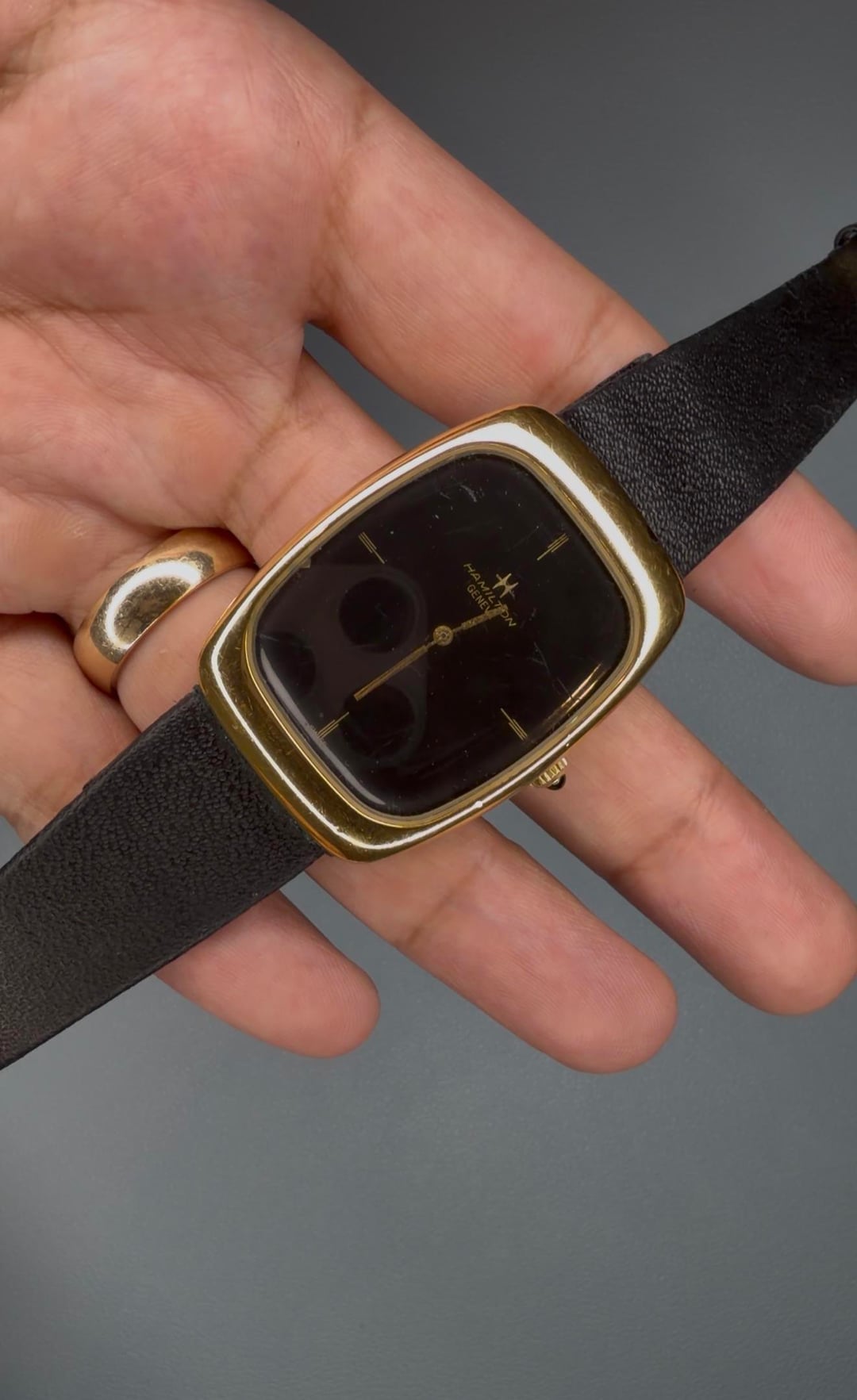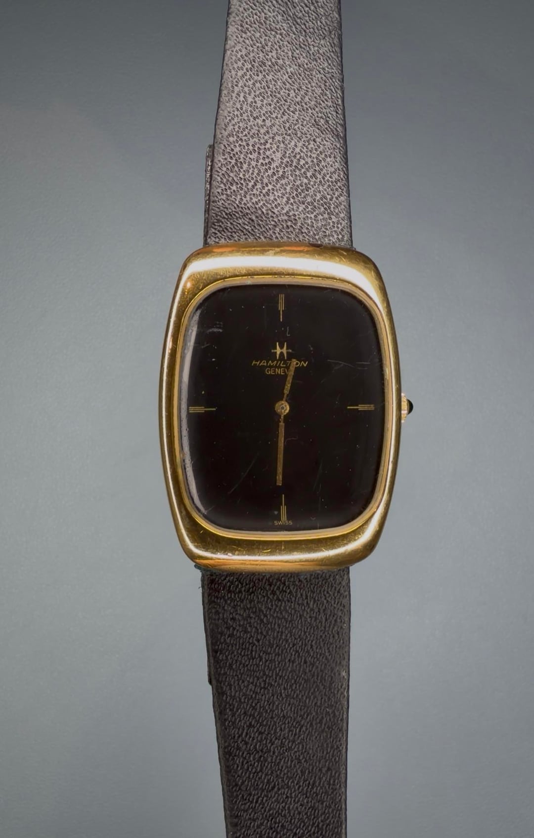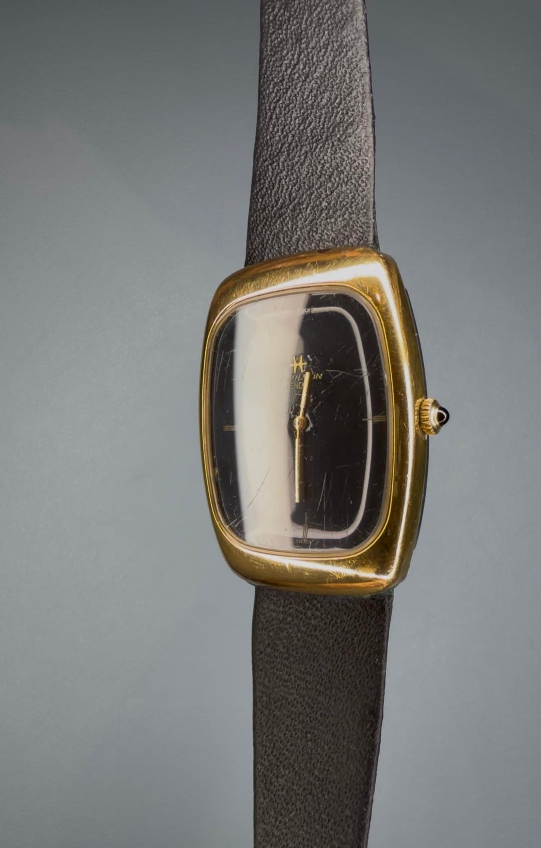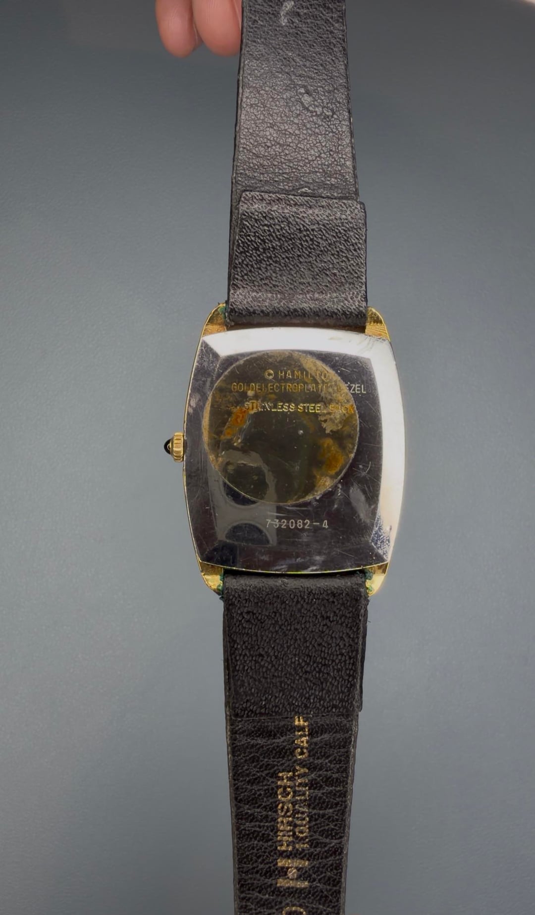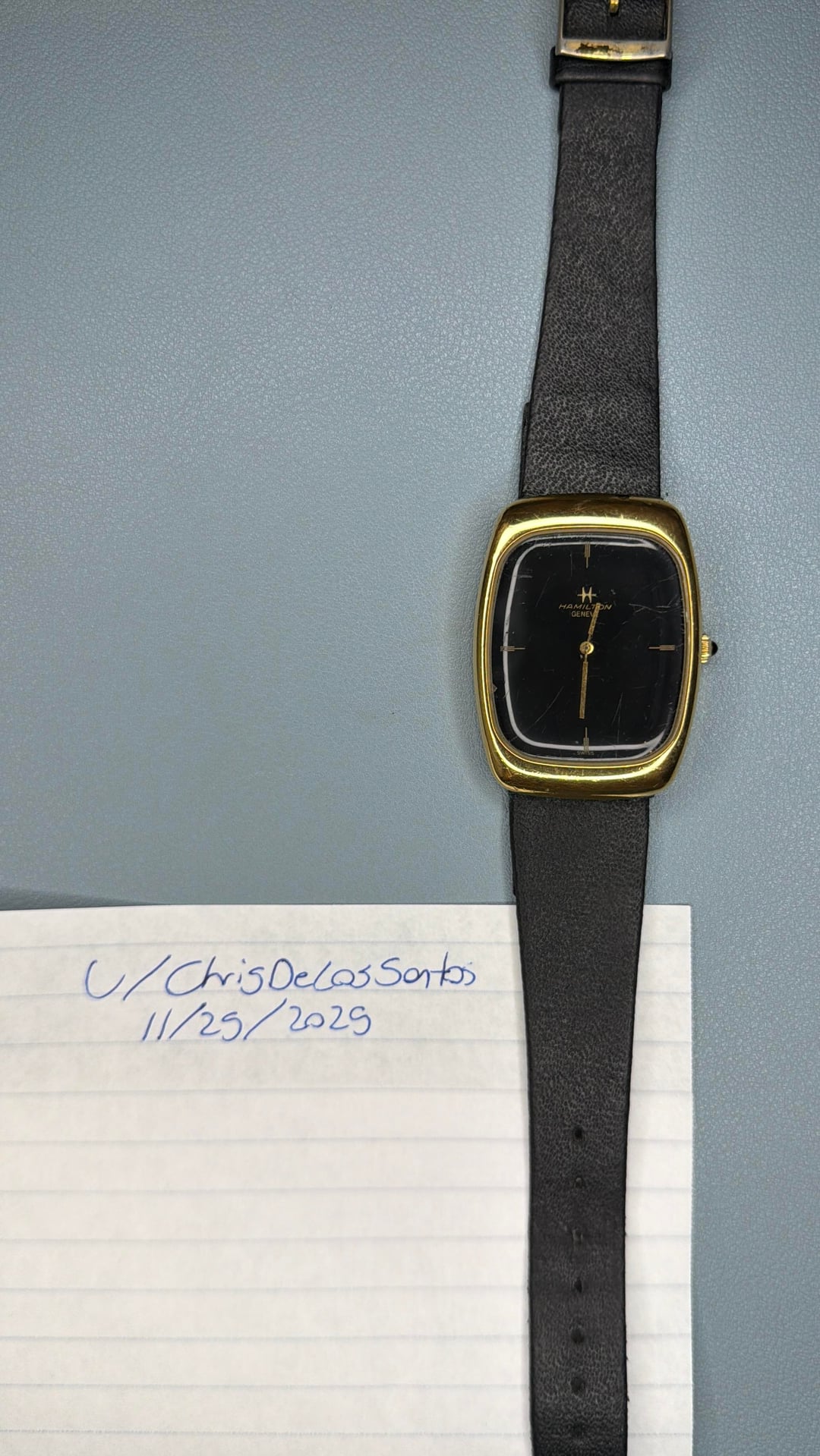 Hamilton Geneve - Needs Service -Details: A beautiful vintage gold tonneau style watch for men. Has a deep black dial, black cabuchon on crown, case back sticker still on. Light signs of wear. Estimated to be from the 80’s. The watch runs/ticks but stops, so it needs to be serviced. The $$ reflects the need for service, please no messages about cost of parts or service. -$150 shipped -Includes shipping (US). I accept Venmo, Zelle, CashApp, and PayPal (+4% if using G&S) -Case size: 32x43mm -Movement: Manual winding -Timestamp: https://imgur.com/a/ePEPGwf -Location: Downtown Los Angeles -IG: @ColeccionDeLosSantos -TikTok: Chris.DeLosSantos