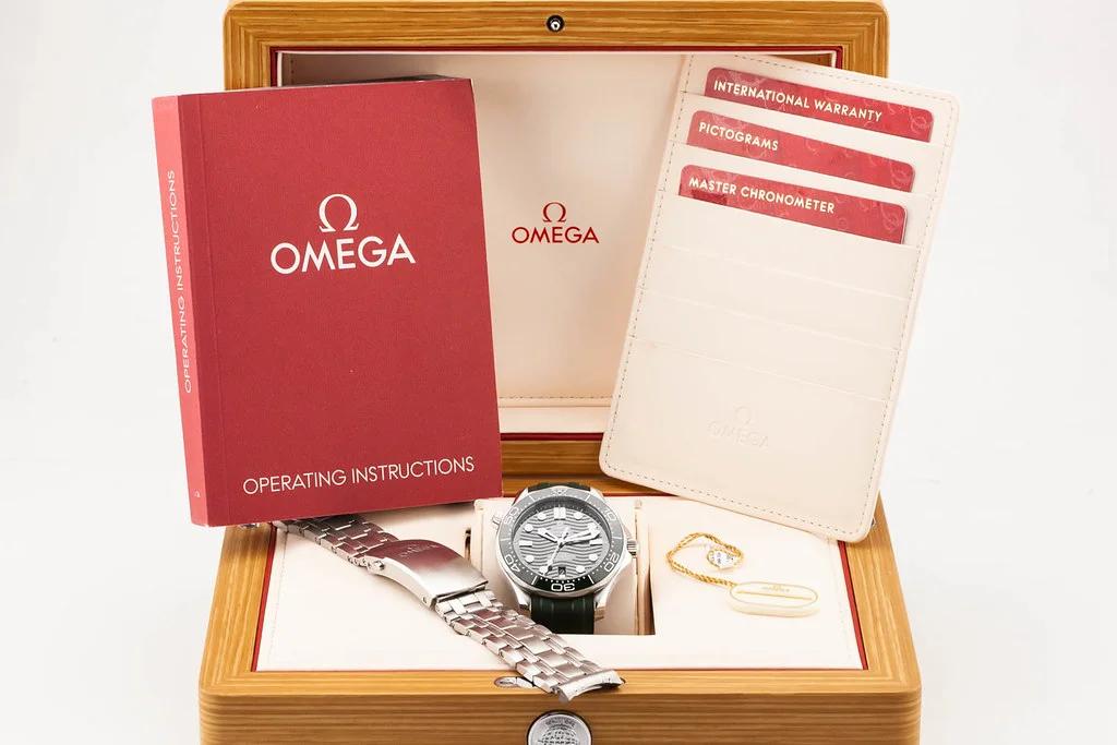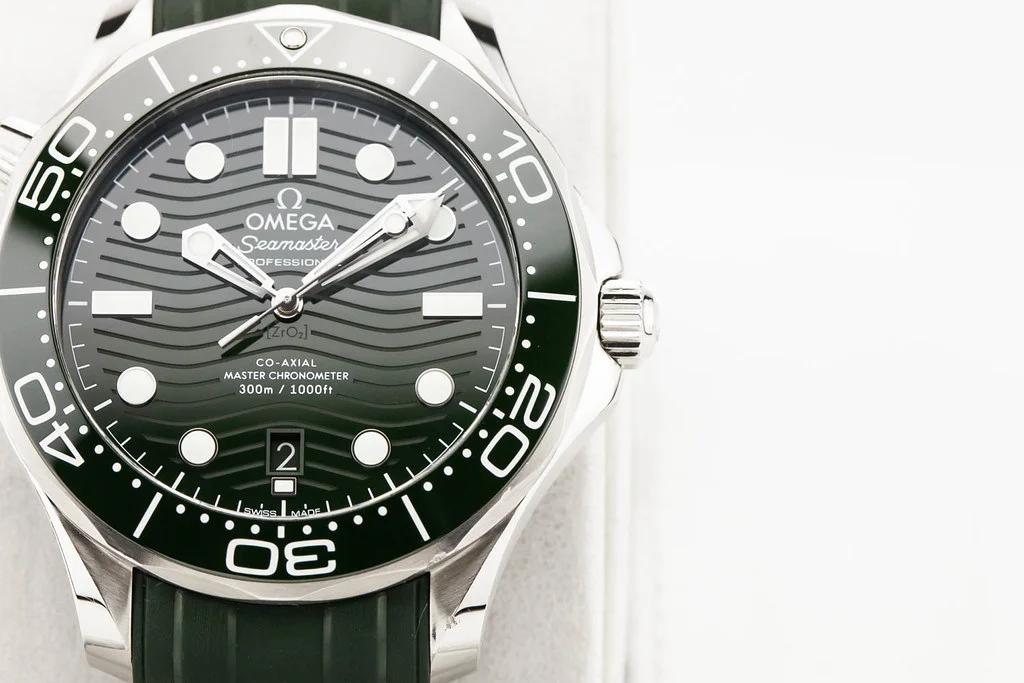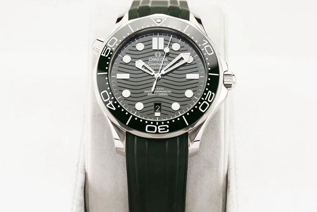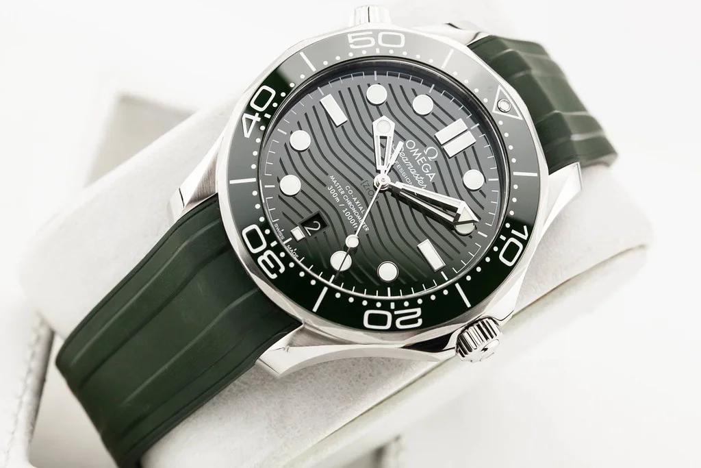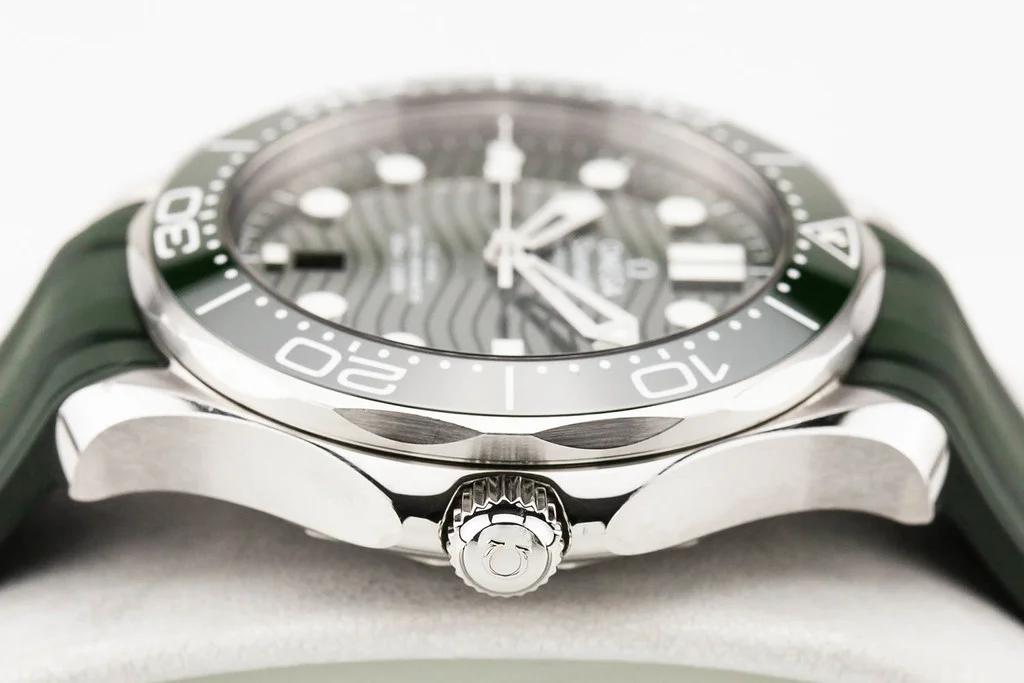 Up for sale is an excellent condition Omega Seamaster 300 Green Wave Dial on Rubber Strap, reference # 210.32.42.20.10.001. It comes complete with all boxes, papers, booklets, hang tag, OEM bracelet and Omega Warranty Card dated June 2024.