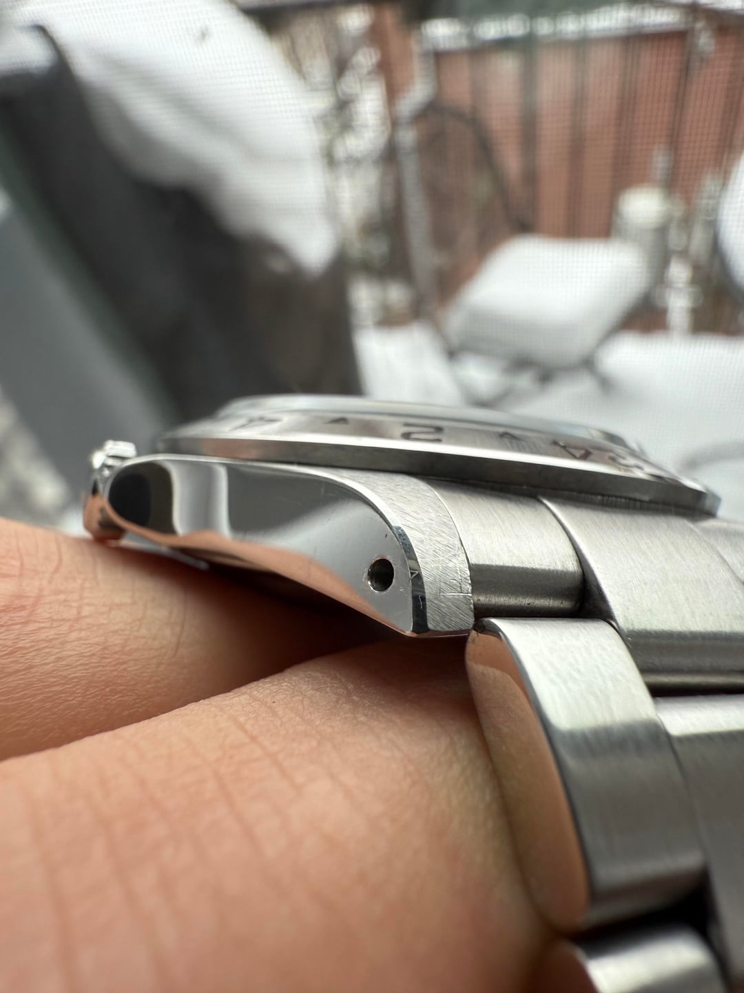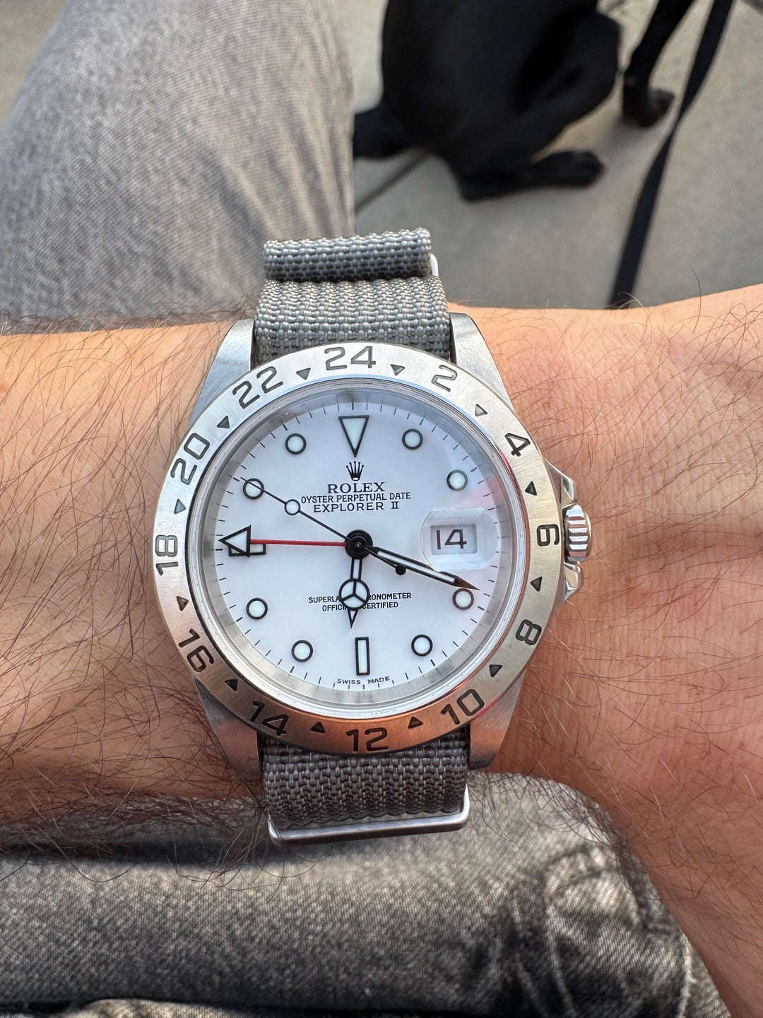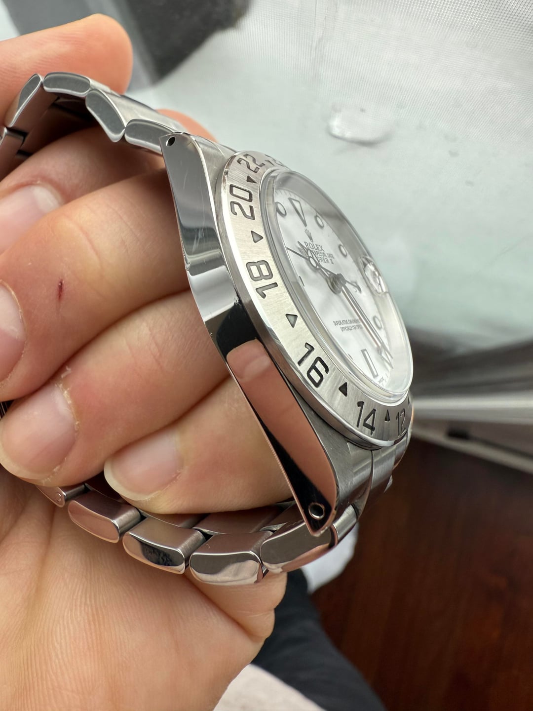 Video: [https://imgur.com/a/Uqf6JAN](https://imgur.com/a/Uqf6JAN) Timestamp: [https://imgur.com/a/oherakn](https://imgur.com/a/oherakn) Selling my beloved 16570 Polar Explorer ii K Serial from 2001. Solid end links and holes case combo. The watch is in excellent condition. Honest condition with sharp, thick and even lugs. Full service by Rolliworks in November 2024 with paperwork in my name. Still has a year left of warranty from Rolliworks service. All service documents will be included with the watch. No box or original warranty papers. Bracelet is tight with no slack, fits up to a 7.5" wrist. The bottom two lugs have light scratches from strap changes and there is a small nick on the bottom 9 o'clock side of the case (shown in pictures). I am asking $8,250 shipped. Willing to meet for a face to face transaction in the Chicagoland area.