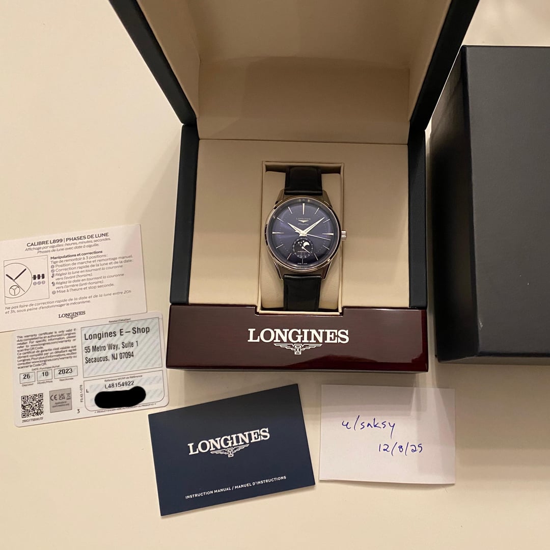 For sale today is the beautiful Longines Flagship Heritage Moonphase with the blue sunray dial. The caseback includes an 18k gold medallion painted with blue enamel. Model number L4.815.4.92.2. 38.5mm case, 46.5mm lug-to-lug, 12.4mm thin, 19mm lug width. I am the original owner, purchased directly from Longines in October 2023. Running well within spec + see pictures for the mint condition. Comes with original everything. Only selling due to the acquisition of a watch for my upcoming wedding. Asking $2150 shipped within the CONUS. Will send insured via USPS. Payment via Zelle, Venmo, or PayPal F&F (add 3.5% for G&S). This is the first example of this watch I’ve seen for sale on Reddit and well over $1k off retail. Please don’t hesitate to reach out with any questions. Hoping someone else can enjoy this beautiful watch as much as I have!