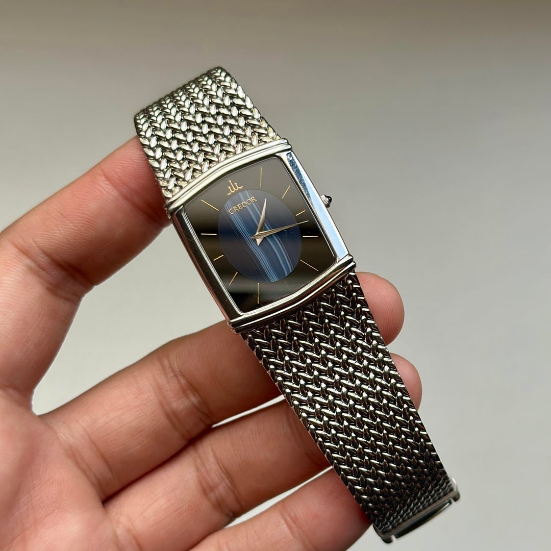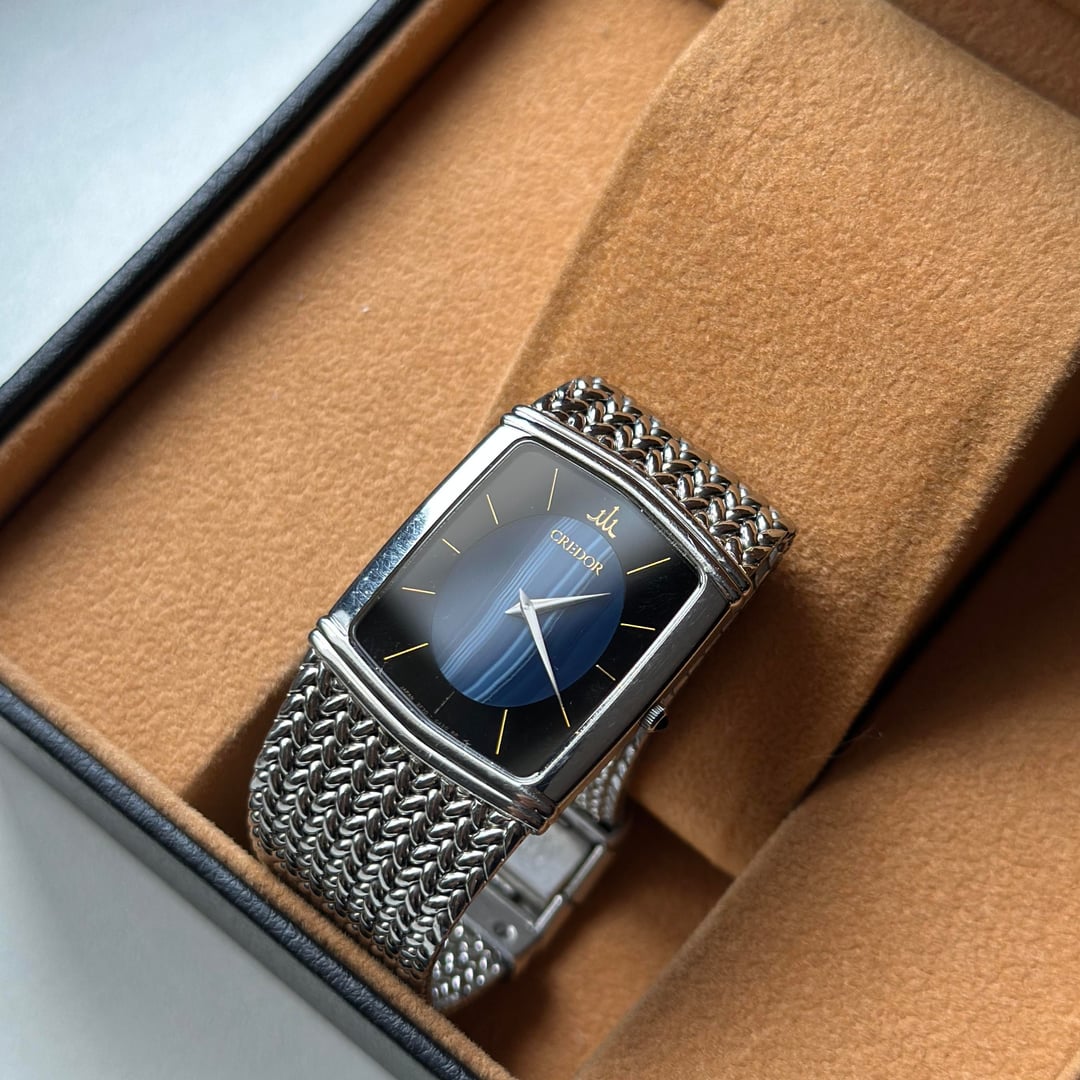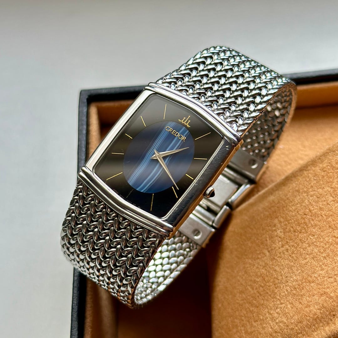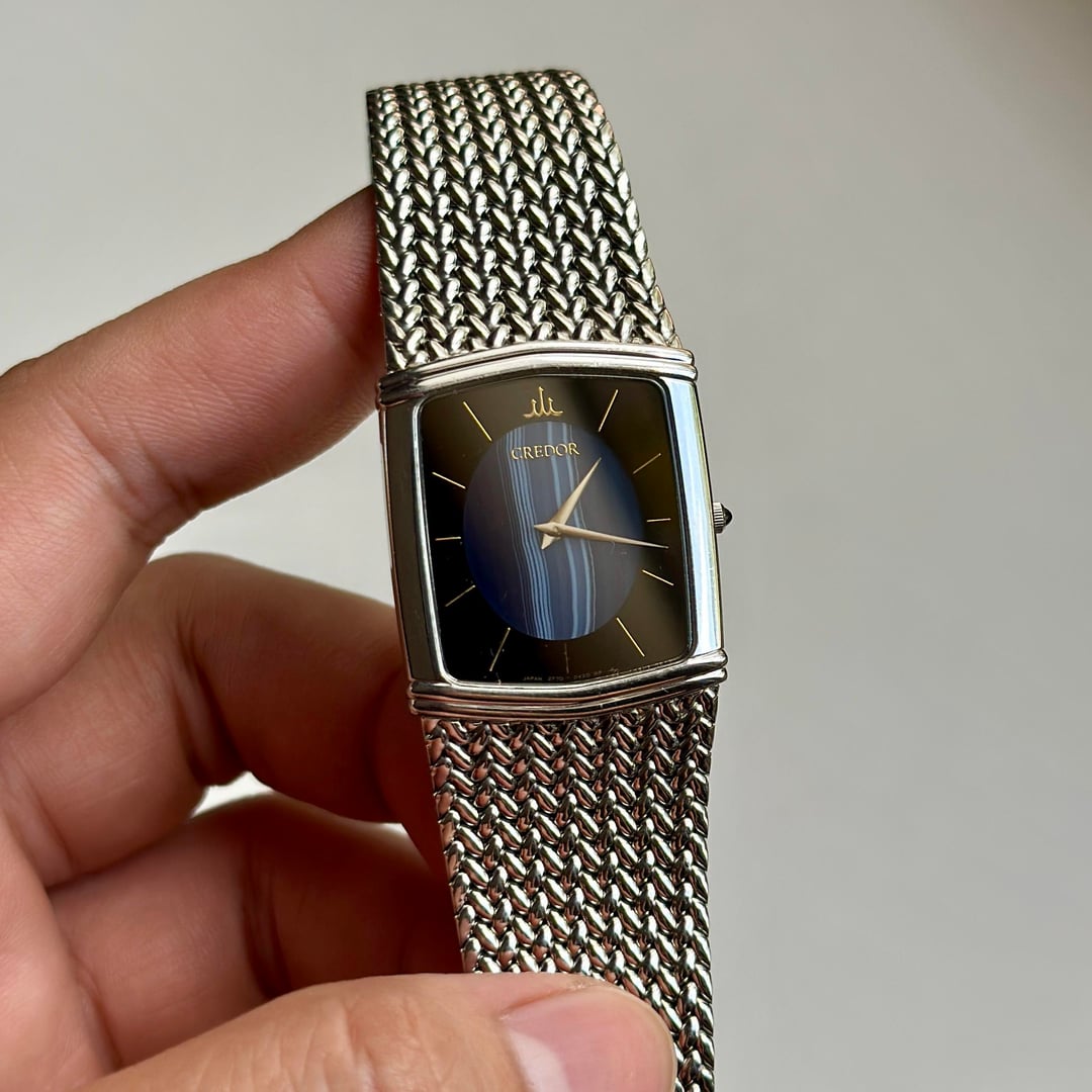 Up for sale is a refined and elegant Seiko Credor from 1987, featuring a stunning blue agate dial. 2F70-5380 Dial: Blue Agate with Onyx Stone Case Material: Stainless Steel Case Size: 26mm x 29mm Bracelet: Integrated Credor bracelet **(fits approx. 6–6.3 inches)** **Price:** * **$380 USD shipped** * Shipping: Worldwide available (DHL Express) * Payment: PayPal F&F (or G&S +5% for established buyers), Wise also accepted * Comment before PM.