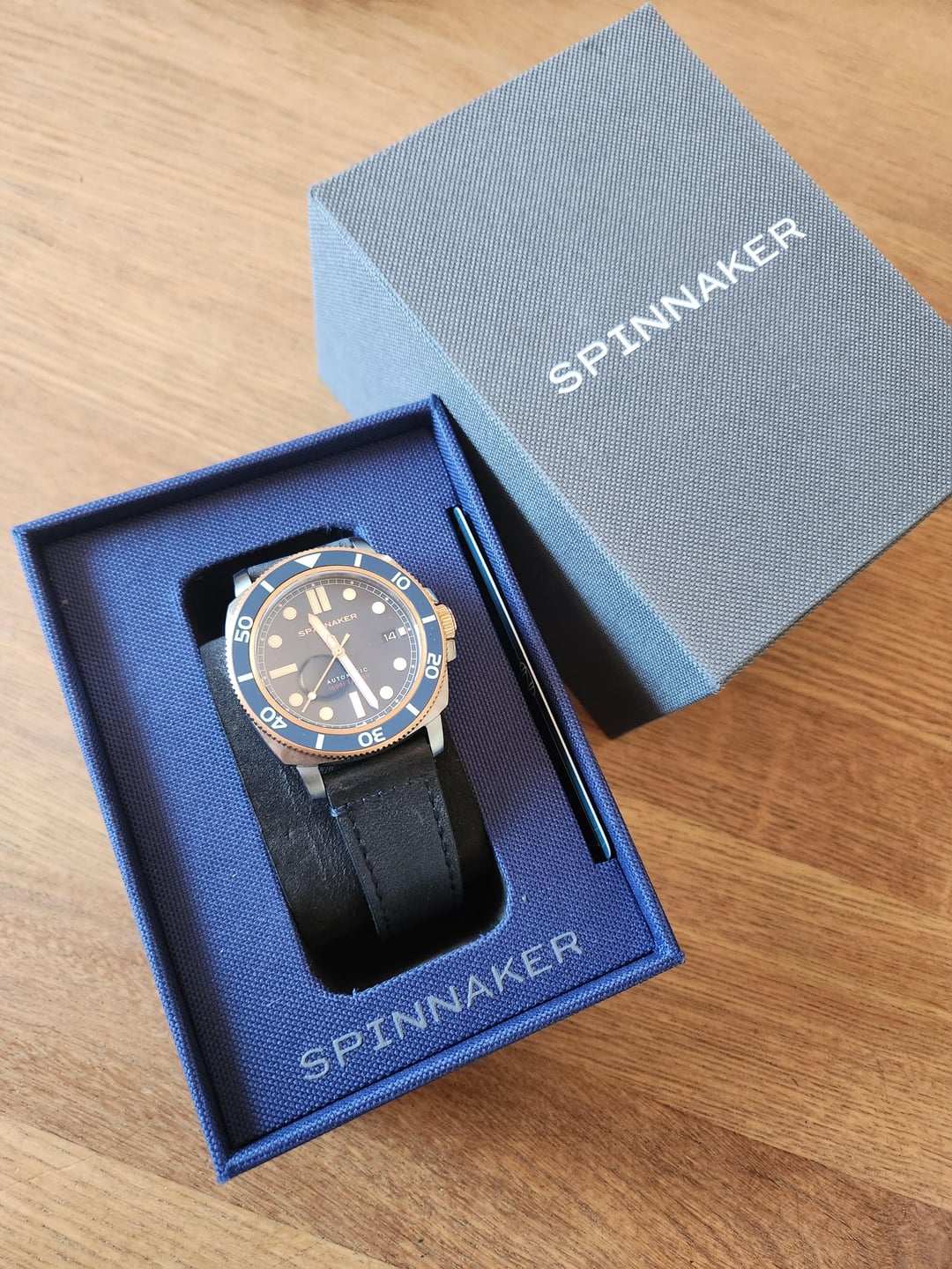 Hello, Trying again to selling a NEW Spinnaker Hull Diver Automatic watch in Officer Blue. Asking $175 shipped CONUS. Purchased April 2024, never worn. Includes box and warranty card. This watch is solid, and the fit on this watch surprised me when it arrived, much nicer than some perceptions seem to be of this brand. Plus 1000' WR (claimed)! The bronze/rose highlights don't do it for me, so trying to find someone they work for. Details: Stainless 42mm case with bronze crown and bezel highlights. Dark blue dial on navy blue leather band. 14m thick. Japanese movement, NH35, with date window. WR to 1000'/300m. Thanks!