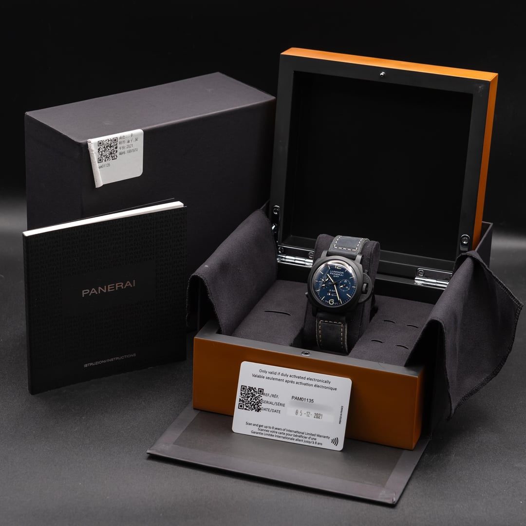 PANERAI Luminor Chrono Monopulsante Ceramic 8 Day GMT Blu Notte 44mm PAM01135 Price: $16,500 A bold fusion of classic Panerai design and refined complication, the PAM01135 “Blu Notte” features a striking deep blue sunburst dial housed in a 44mm ceramic case. This Monopulsante Chronograph offers an 8-day power reserve, GMT function, and a beautifully displayed manual-wind movement visible through its sapphire caseback. This watch is in excellent condition. Please review the pictures closely for accuracy. The photos are taken with a high-powered macro lens and may show imperfections not typically seen with the human eye. Includes: \- Double Box \- Warranty Card/Paper (2021) \- Manual We deal with absolute transparency and welcome any communication regarding the watch. The watch ships overnight priority FedEx fully insured within 2 business days of purchase. Charlotte, NC