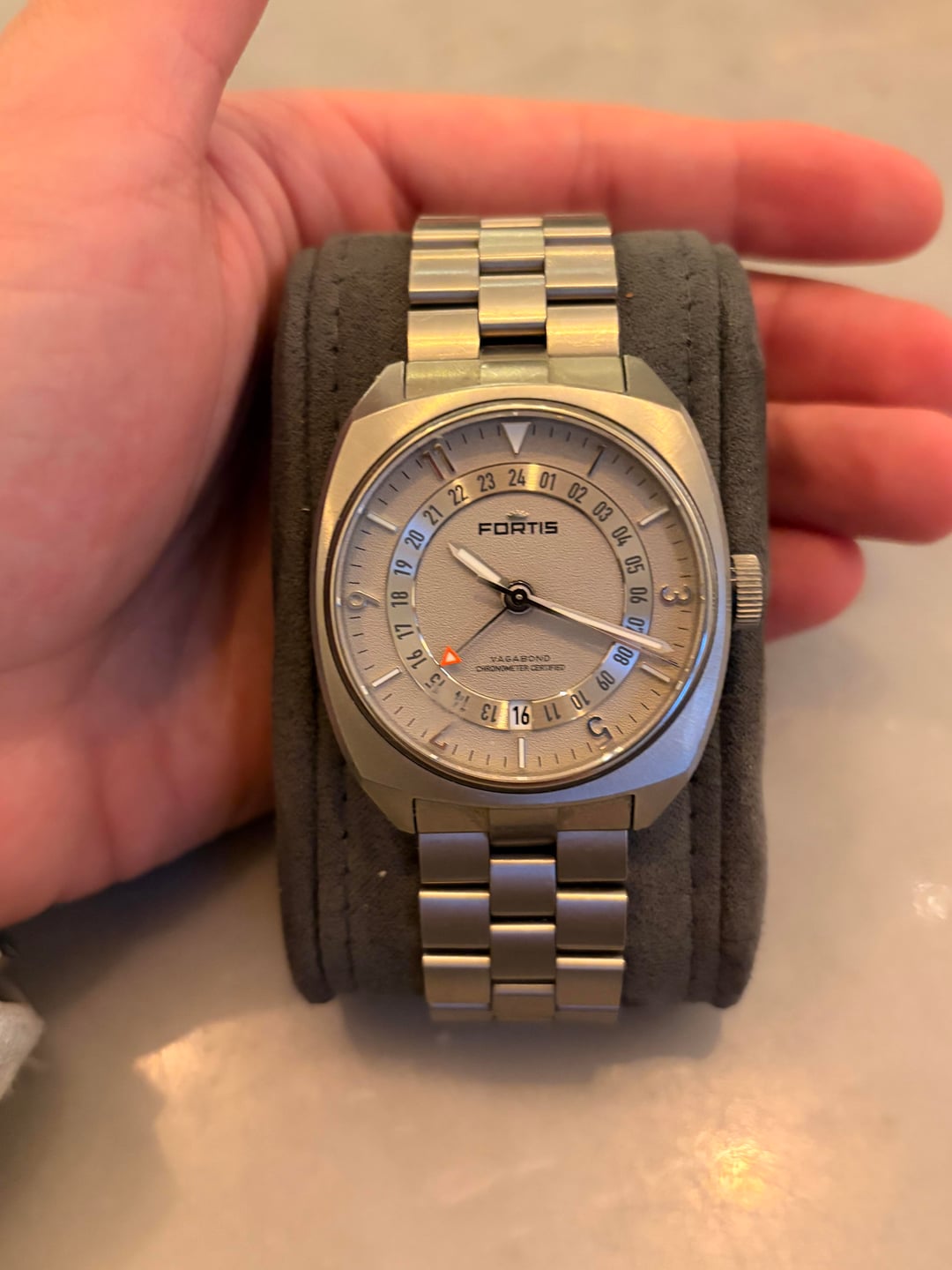 [WTS] The Fortis Vagabond V-40 Stormy Gray on the Block Bracelet is a traveler’s GMT watch designed for the modern cosmopolitan, emphasizing home time while delivering robust functionality and premium materials. Crafted with a lightweight yet durable Grade 5 titanium case, it combines elegance and resilience, making it ideal for everything from boardroom meetings to adventurous escapades. The grained light gray dial features applied numerals and indices, paired with a striking 18-karat white gold GMT ring that allows effortless tracking of a second time zone. Luminescent Superluminova® X1 elements on the hands and indices ensure readability in low light, while the chronometer-certified automatic Manufacture Calibre Werk 13—co-developed with Kenissi—provides a 70-hour power reserve, GMT complication, and date display at 6 o’clock. Key features include a screw-down crown with a triple gasket system for enhanced water resistance, performance FKM gaskets, and a smoked sapphire crystal case back that offers a view of the Kenissi movement. The titanium block bracelet comes with an integrated microadjustment slide clasp for a secure, customizable fit. Its versatile design prioritizes comfort and style, with a polished titanium bezel adding a refined touch. Specifications: • Case: 40 mm diameter, 13.9 mm height, 46.5 mm lug-to-lug, 74 g (watch head only); Titanium Grade 5; 200m (20 ATM) water resistance; Sapphire crystal with anti-reflective coating on both sides. • Dial: Grained light gray (Stormy Gray) with applied 18-karat white gold GMT ring; Superluminova® X1 luminescence with blue glow. • Hands: Metallic hour and minute hands with Superluminova® X1; Metallic sweep second hand. • Movement: Automatic Manufacture Calibre Werk 13 (same as the movement in TUDOR Black Bat GMT); GMT and date complications; 70-hour power reserve; Chronometer-certified. • Bracelet: Titanium block bracelet with titanium slide clasp and microadjustment. • Additional Inclusions: 5-year warranty, chronometer certificate, user manual, and reversible screwdriver for strap changes. Price: $4,250 full set, including all extra links, a sizing tool, and warranty. Price negotiable. Shipped CONUS via UPS priority. Accept Zelle, PayPal F&F, and wire. Pictures and timestamp: https://imgur.com/gallery/dhX7c25