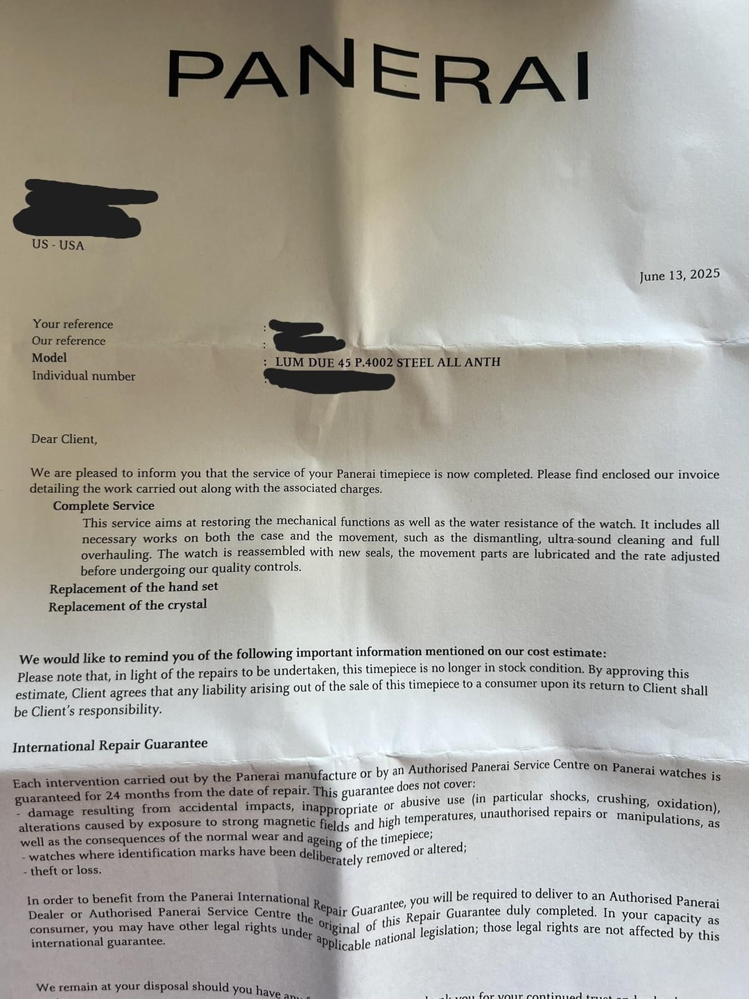 Hello WatchEx, I am selling my Panerai Luminor Due GMT PAM00944. I believe this is the best condition example I see online barring new old stock. This comes as full set with the box, papers, tags, strap tools, service papers, watch cover, literally everything. The watch is in great condition as shown in picture. Orignally purchased in 2018, it went through complete servicing in Jun 2025, and is under service warranty for another 18 months. I also have good reference on ebay and C24 which I am happy to share. Asking for $5999 (MSRP $12,100) plus shipping via bank wire or Zelle to CONUS. Also happy to do a face to face transaction around NYC metro. Cheers!