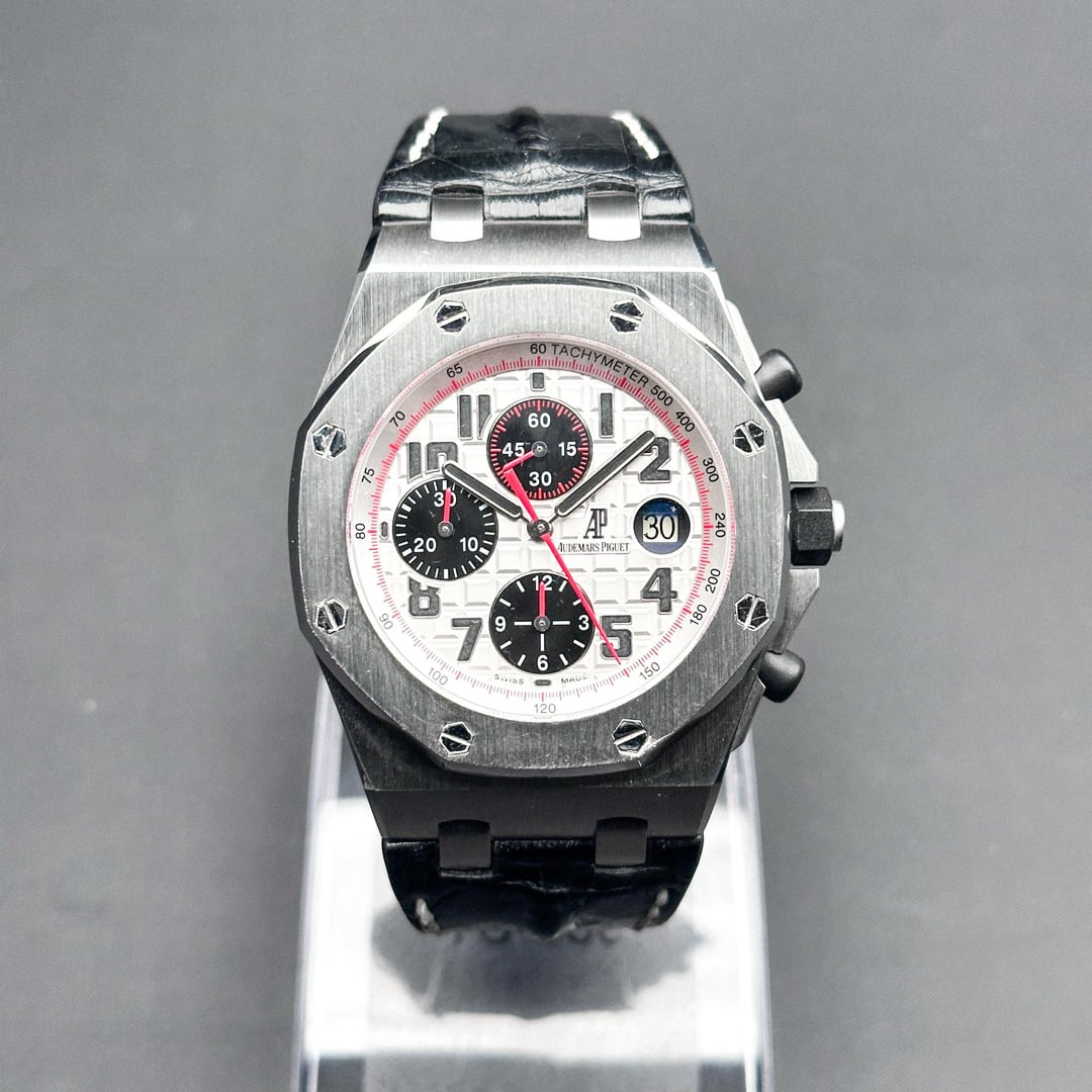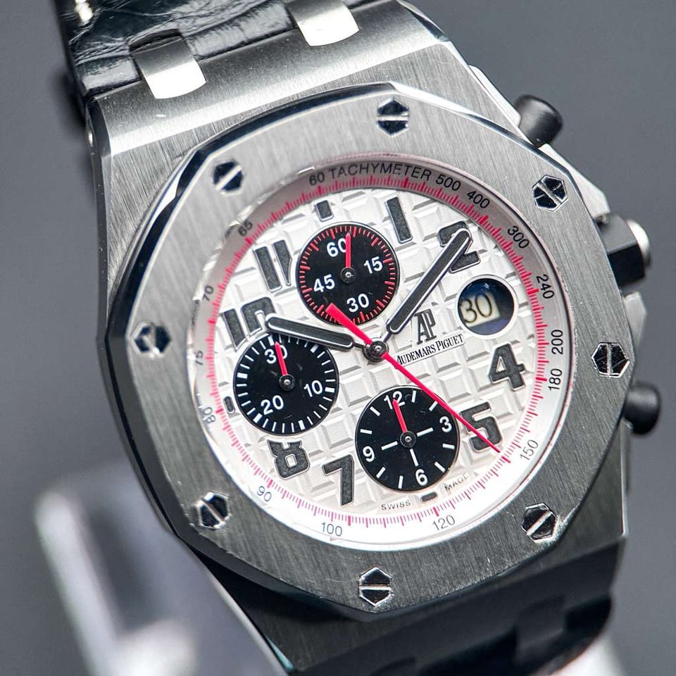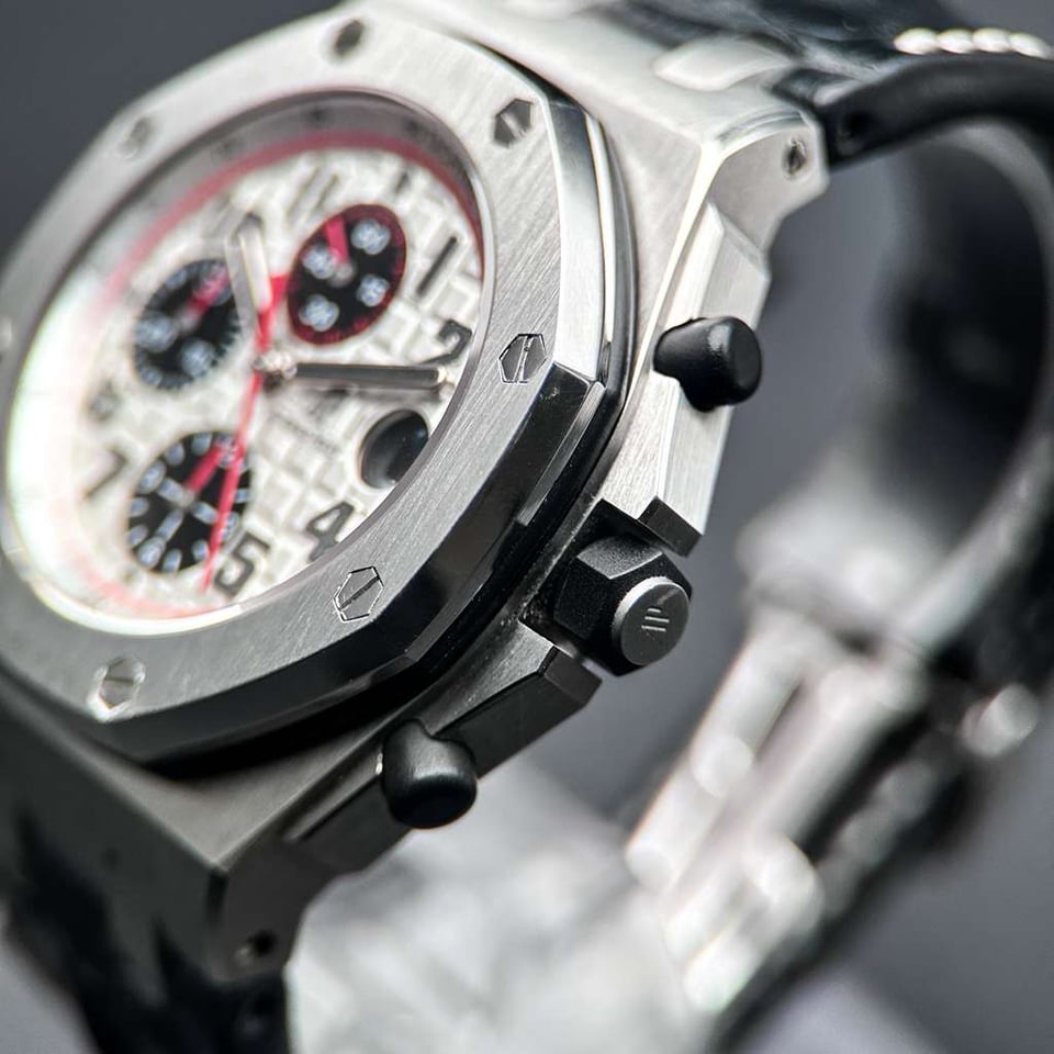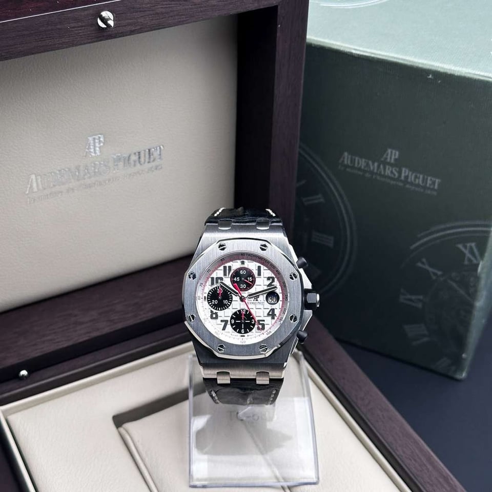 Audemars Piguet Royal Oak Offshore "Panda" | White Dial Ref. 26170ST.OO.D101CR.02 | 42mm | Stainless Steel | W/ Box | White Dial | Red Accents   Price: $17,840   The Royal Oak Offshore “Panda” is a legendary reference within the AP catalog, celebrated for its high-contrast, racing-inspired aesthetic. The crisp white “Méga Tapisserie” dial is offset by deep black sub-dials and vibrant red chronograph hands, creating a dynamic visual tension that is both sporty and sophisticated. This is a timepiece for the collector who values the bold, oversized "Beast" lineage but seeks a classic colorway that remains one of the most recognizable and coveted configurations in Offshore history. Beneath the Size 42 brushed stainless steel case lies the Manufacture 3126 / 3840, an automatic movement featuring a 50-hour power reserve and a hacking seconds function for precise synchronization. This generation of the Offshore is characterized by its signature black rubber-clad screw-locked crown and push-pieces, offering a tactile, tool-watch ruggedness that defined an era of AP design. This example is presented in excellent condition (9/10), maintaining its razor-sharp Zaratsu-style chamfers and technical integrity as a quintessential high-luxury sports chronograph.