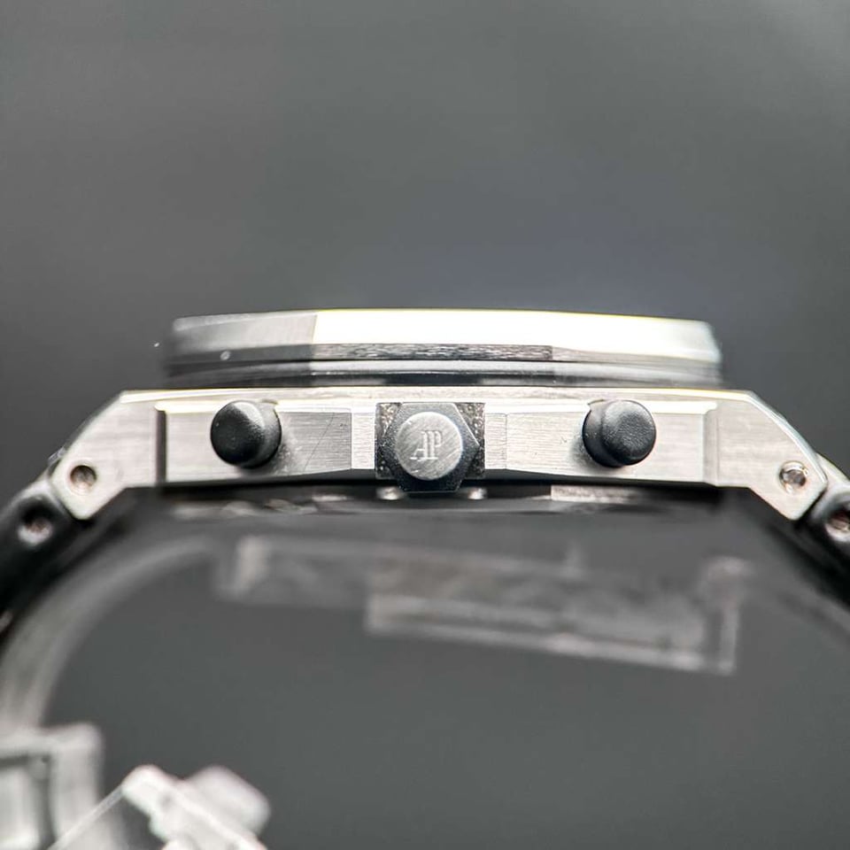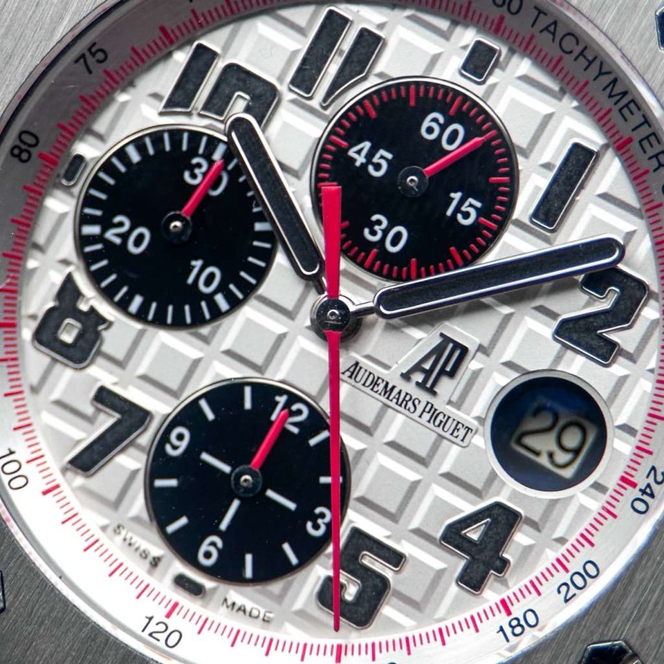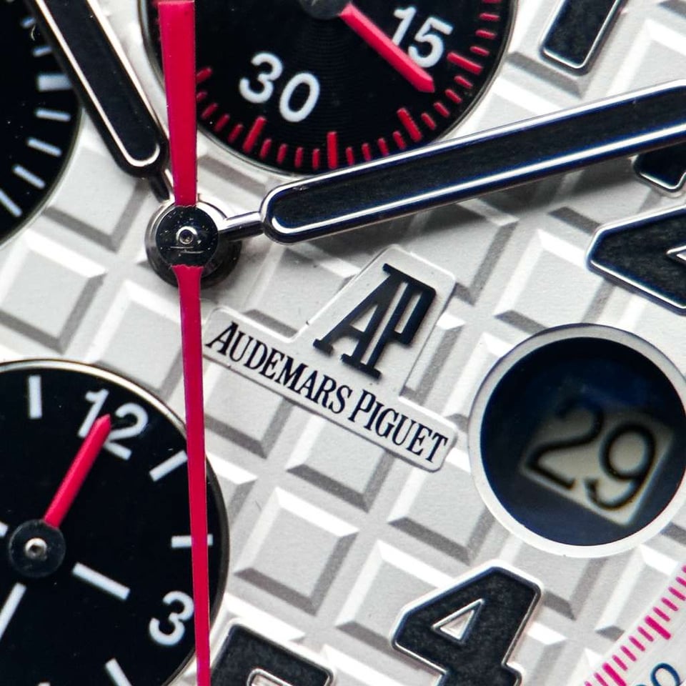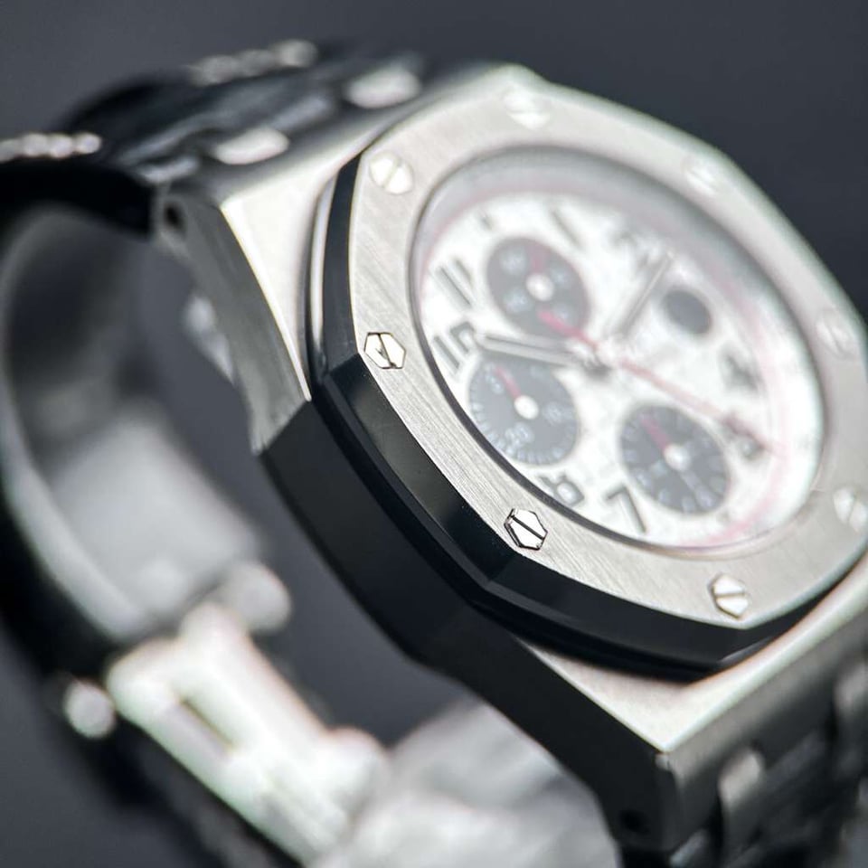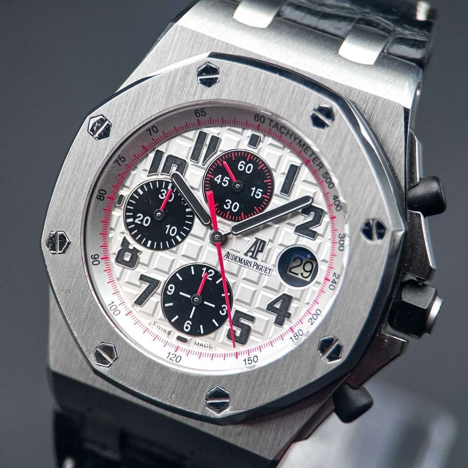 Audemars Piguet Royal Oak Offshore "Panda" | White Dial Ref. 26170ST.OO.D101CR.02 | 42mm | Stainless Steel | W/ Box | White Dial | Red Accents   Price: $17,840   The Royal Oak Offshore “Panda” is a legendary reference within the AP catalog, celebrated for its high-contrast, racing-inspired aesthetic. The crisp white “Méga Tapisserie” dial is offset by deep black sub-dials and vibrant red chronograph hands, creating a dynamic visual tension that is both sporty and sophisticated. This is a timepiece for the collector who values the bold, oversized "Beast" lineage but seeks a classic colorway that remains one of the most recognizable and coveted configurations in Offshore history. Beneath the Size 42 brushed stainless steel case lies the Manufacture 3126 / 3840, an automatic movement featuring a 50-hour power reserve and a hacking seconds function for precise synchronization. This generation of the Offshore is characterized by its signature black rubber-clad screw-locked crown and push-pieces, offering a tactile, tool-watch ruggedness that defined an era of AP design. This example is presented in excellent condition (9/10), maintaining its razor-sharp Zaratsu-style chamfers and technical integrity as a quintessential high-luxury sports chronograph.