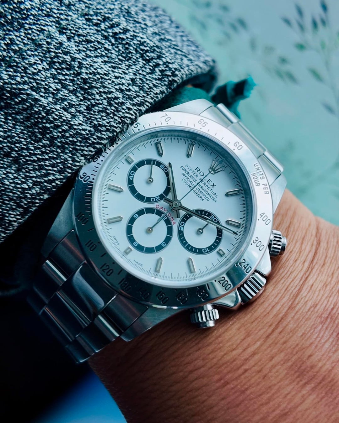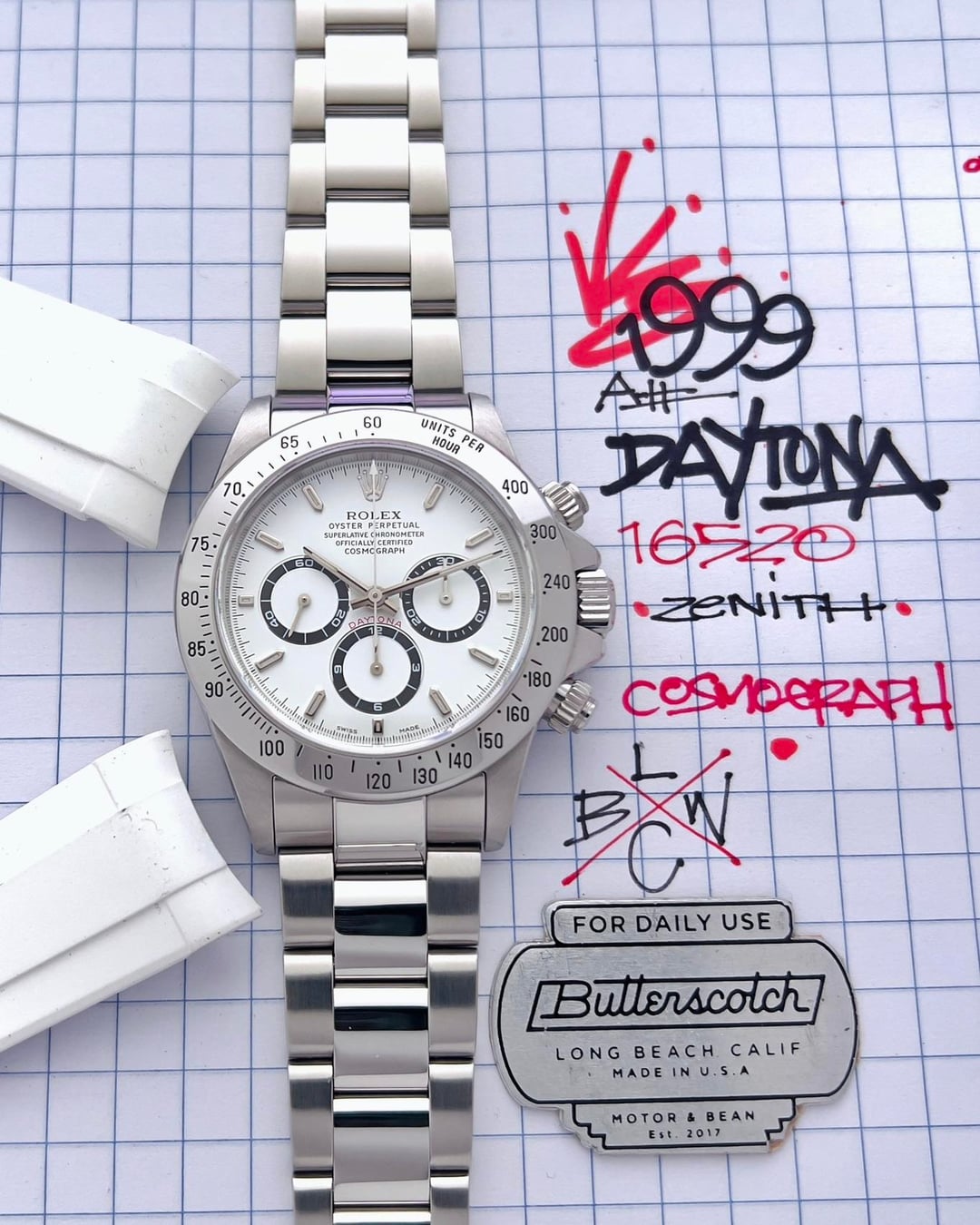 Rolex Zenith Cosmograph Daytona Chronograph ref. 16520 from 1999 A-serial The Daytona is rooted in motorsports and racing—most notably in popular culture the 1963 Paul Newman model with caseback engraving “Drive Carefully Me.” Today, the Daytona almost transcends Rolex and is almost a tier and brand itself. The Zenith component refers to the 4030 calibre movement but the details are all in the dial. An easy way to spot this is the running seconds hand at the 9 sub dial and the thinner hour marker. The last part, once seen cannot be unseen on other newer Daytonas. On this zenith Daytona, notice how the horizontal lines on the 9 o’clock sub-dial line up with the 9 marker. One the Rolex in-house movement it floats above. While this era of Rolex is not considered vintage yet, it is a future icon. Overall, this one has no condition marks and appears to be professionally polished: maintains thicc lugs, stain and brushed finish is still crisp where it should be—minimal to no desk diver rash on clasp of polished center links. While no service history, this one appears to be running per factory specifications or close and it probably was recently serviced by a private watchmaker. _________________________________ * Timestamp pix Videos and timegrapher: https://drive.google.com/drive/folders/1LuKzi3Ipl_1SA2r1L0-nmmYa0rF5lENb?usp=sharing * Specifications: 40mm case X 20mm lug width X 47h lug to lug X 12.5cc with sapphire crystal. * Box and papers: box yes, papers no * Bracelet: original mate to the watch measures total length with head to 7.8in so we recommend for a 7.65in wrist and under. Also includes white Rubber B DM106cd strap on tang worth $200 ___________________________________ * Video is the best way to view the watch if in-person test drive is not available. Due to the different characteristic of the cameras and gadgets used, the color of the watch you purchase may not be the same as shown on this website or on our Instagram. * will consider trades that make sense but please consider time, shipping, and trade value—not market. - local special: can possibly accommodate at ButterScotch in Downtown Long Beach by appointment - All sales final unless the watch is misrepresented or lost in transit (always fully insured) - Link to [feedback here](https://watchcharts.com/repcheck/user/soycowboy?source=reddit&type=feedback) ____________________________ Asking a *negotiable* **$23500** via bank wire, Zelle, and/or venmo Price includes fully insured Fedex shipping in the USA— hand delivery in long Beach with drinks or coffee on me ;).