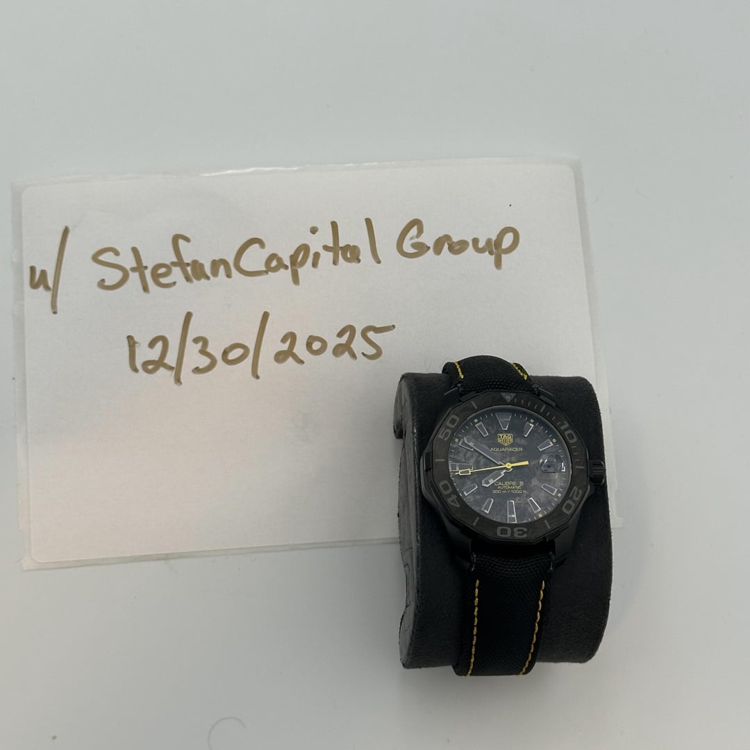 [WTS] TAG Heuer Aquaracer Calibre 5 Carbon – Limited Edition (750 pcs) – Full Set • Reference: WBD218B.FC6446 • Year: 2019 • Condition: Very good (minor, normal wear only) • Limited Edition: 750 pieces worldwide (numbered, not disclosed) • Case: 41mm titanium w/ black PVD/DLC • Bezel: Carbon, unidirectional • Movement: TAG Heuer Calibre 5 (ETA 2824-2) • Power Reserve: 38 hours • Water Resistance: 300m / 1000ft • Crystal: Sapphire w/ cyclops • Strap: Black textile w/ fold clasp Includes: ✔️ Original inner & outer boxes ✔️ Original warranty card (dated Jan 27, 2019) ✔️ Manuals ✔️ Full set Discontinued carbon Aquaracer. Lightweight, stealthy, and increasingly hard to find in full-set condition. https://imgur.com/a/G9AmLSN Price: $3920 Location: USA (CA) Shipping: USA only. Insured. Happy to ship to an authenticator at buyer’s request. PM with questions.