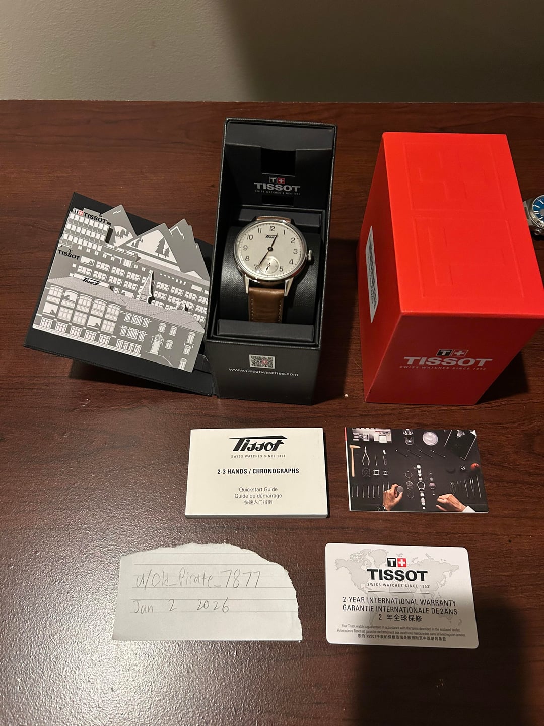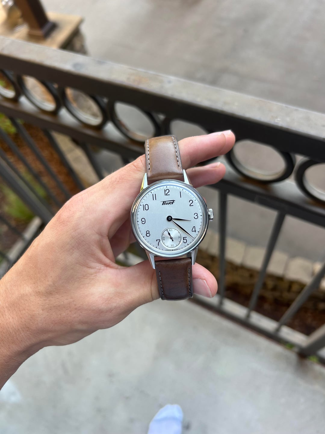 Hello all, Today I am selling this beautiful Tissot Heritage Petite Second Hand Wind and I am asking for $450 USD which includes shipping and handling within the united states, if you live outside of the united states and are interested let me know we can figure something out. This watch is in almost completely new condition with no scratches on the crystal and just a few tiny scratches on the body. I bought it on here a few months ago but I am looking to downsize the collection some. Below are more details about the watch: Ref: T119.405.16.037.01 Case: 42mm Height: 11.35mm Material: 316L stainless steel (brushed and polished) Crystal: Domed sapphire crystal with anti-reflective coating, sapphire crystal case back Water resistant: 50mm Movement: ETA 6498-1 – hand-wound – 17 jewels - 18,000vph (2.5Hz) – 46-hour power reserve – central hours, minutes and small seconds (non-hacking) I understand the concern with my account not having many transactions, I am very open to doing anything to help you feel secure with your purchase, weather that is showing you forms of ID (as long as it isn't my birth certificate or social security card LOL) or facetiming you to show you I am real, or whatever else you would like. Let me know if you would like more pics of the watch I would be happy to take some. Thanks!