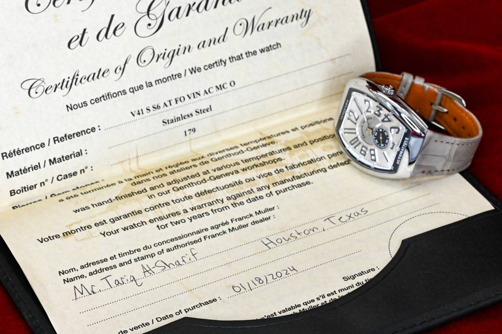 Hello, selling a lightly worn Franck Muller Vanguard Slim Vintage. Dial features Cotes de Geneve(Geneva Waves) in the center and hand painted applied numerals. Watch is in Excellent condition, with minimal signs of wear. Circa 2024. Offer includes box, outer box and Certificate of Origin and Warranty and extra stainless steel bracelet. Asking $6800