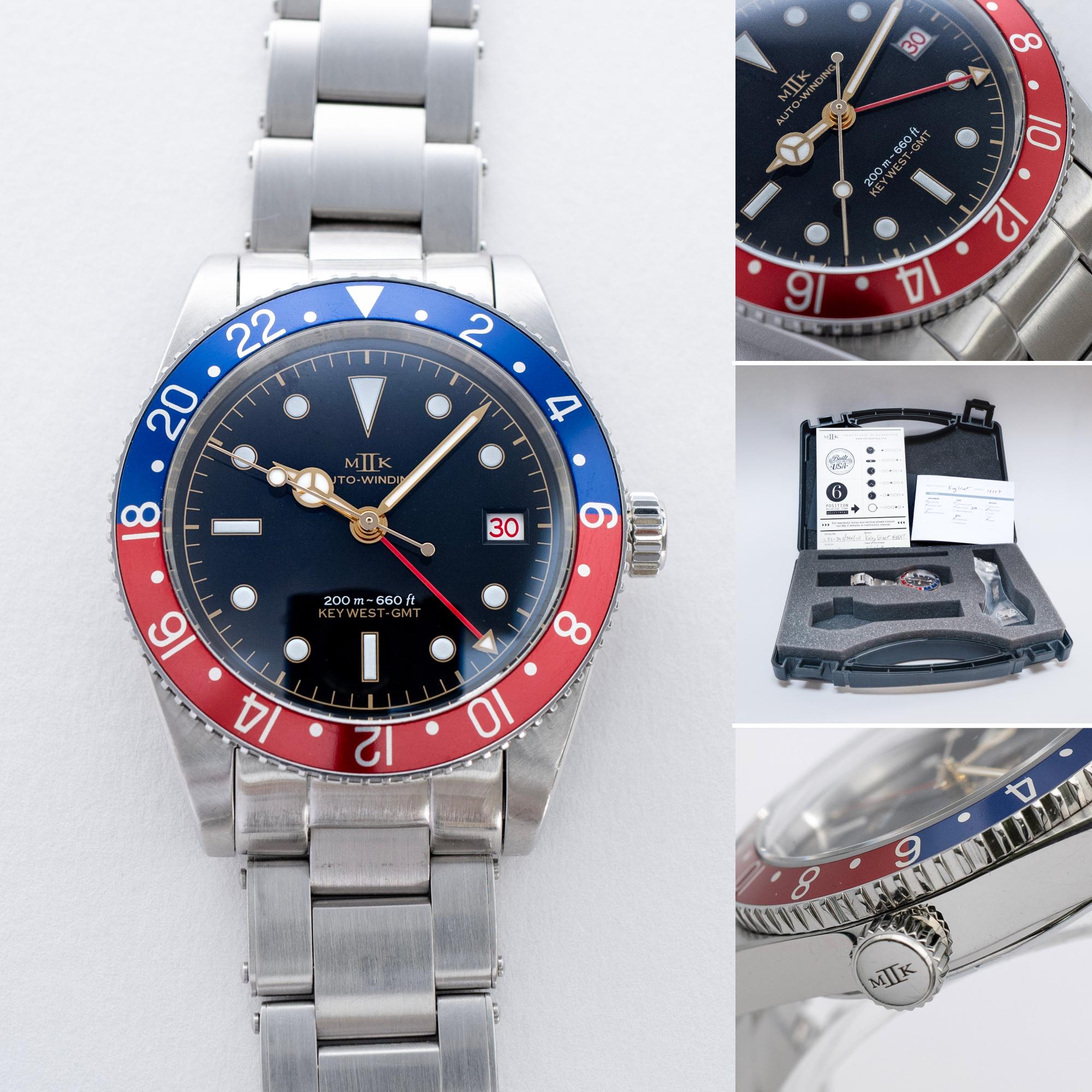 **Offering:** MK II Key West GMT full set in very good condition. **Price:** $1 200 USD net to me. **Pictures:** [https://imgur.com/a/bj6VGpG](https://imgur.com/a/bj6VGpG) **Timestamp:** [https://imgur.com/a/JxPCRxp](https://imgur.com/a/JxPCRxp) # Origin story Many enthusiasts regard the MK II Key West GMT as the finest modern interpretation of the vintage GMT‑Master. MK II is the brainchild of Bill Yao, known for his patient attention to detail and build quality. This model stays faithful to the classic design while offering a robust modern wearer’s piece. It features an aluminum insert with alternating red and black sections, a distinctive true gilt dial, and a *roulette* date wheel that alternates between red and black numbers - all a nod to the original. Only a couple of hundred of these watches were produced, so you won’t see them often. # Condition The watch is in overall good, attractive condition. The case is strong with crisp bevels; the bracelet shows typical light marks from normal wear and strap changes. The bezel insert has very minor hairline marks, and the case back shows light marks from removal. Lume is bright and everything functions as it should. I’ve intentionally made all hairline scratches, scuffs and the single ding on the bezel very visible in the photos so you know exactly what to expect. It comes on the original bracelet with all extra links as well as any original accessories (box, travel case, paperwork, etc.). # Specifications * **Case width:** 39.8 mm * **Case length:** 47.6 mm * **Case thickness:** \~15.2 mm * **Lug width:** 20 mm * **Weight:** \~82 g * **Lume:** Super‑LumiNova BGW9 * **Movement:** Swiss automatic ETA 2824‑2 * **Accuracy:** running about ±6 s/day on my wrist * **Finish:** satin‑brushed 316L stainless steel * **Water resistance:** 20 ATM * **Set includes:** watch head, full bracelet with all extra links, original box, papers # Shipping & payment I can ship from the EU *or* Texas. Insured express UPS or DHL shipping is included in the price. Payment via Wise, PayPal (Friends & Family or Goods & Services if you cover fees) or bank wire. I reserve the right to choose the buyer. Feel free to reach out with any questions or if you need additional photos / a video call. Thanks for looking!