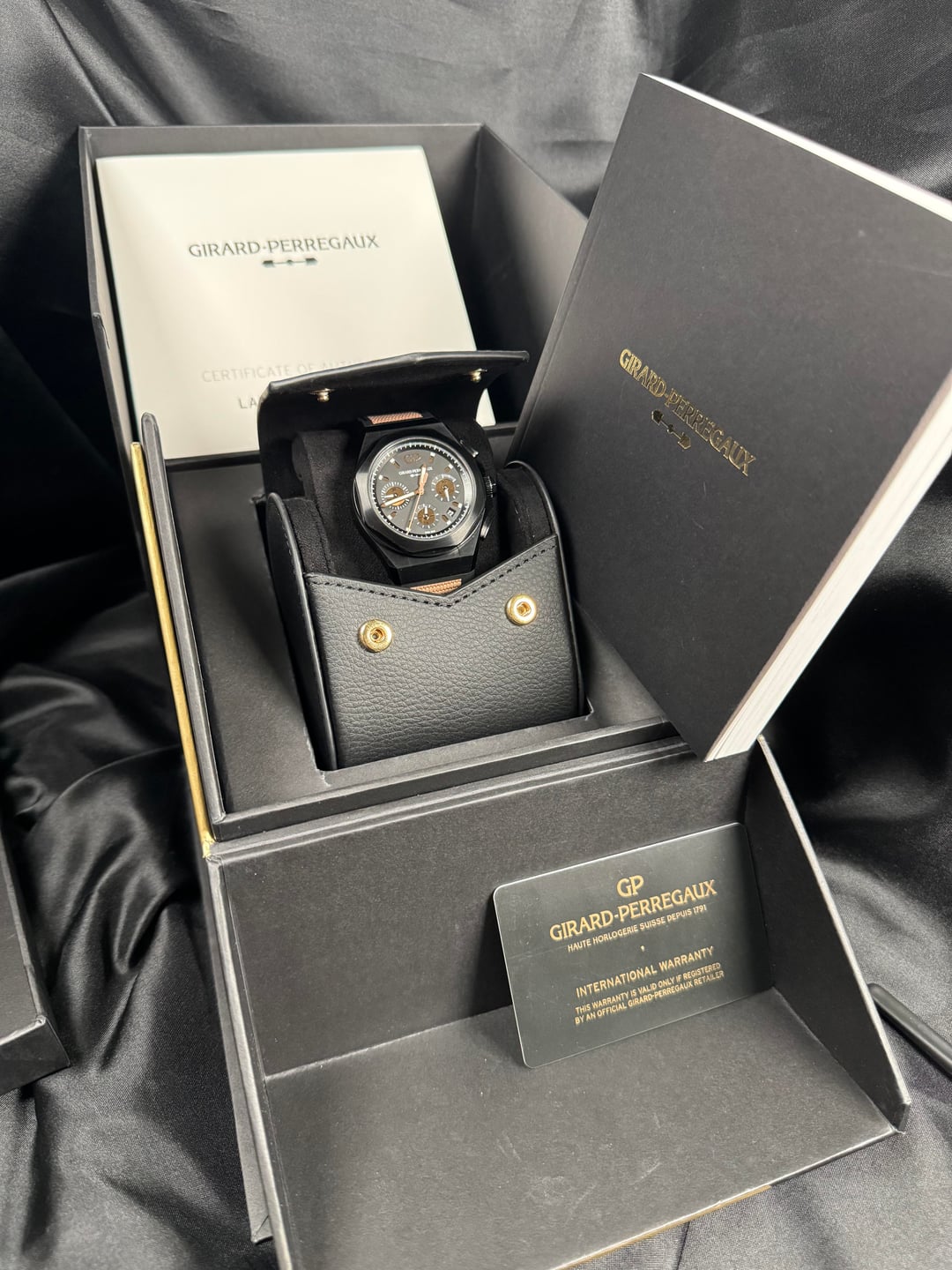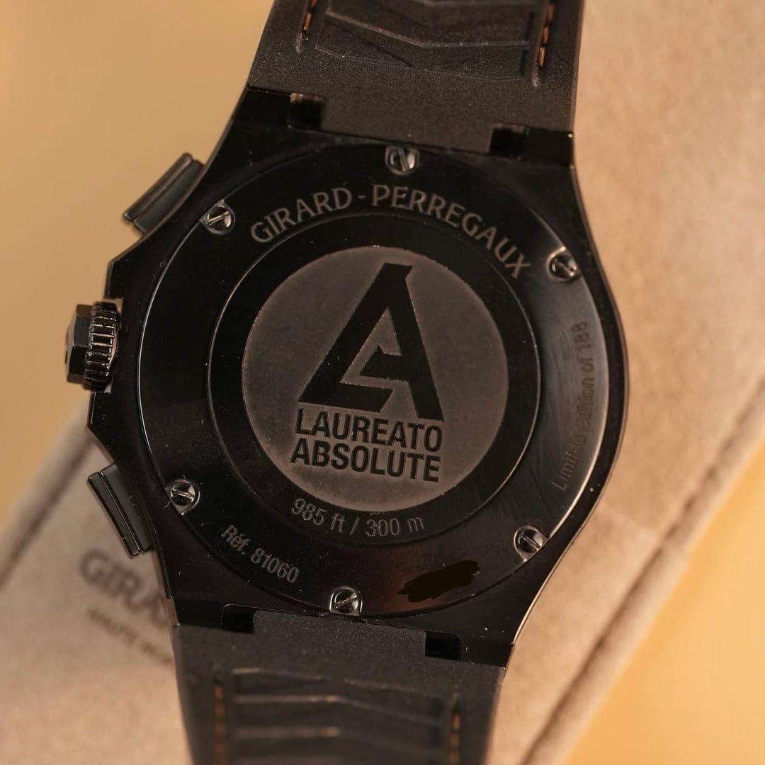 Girard-Perregaux Laureato Absolute “Gold Fever” – Ref. 81060-21-492-FH3A 2022 – Full Set – Like New Condition – Limited Edition 188 Pieces - comes with extra full black original strap MSRP ~ $22000 PRICE $10250 ship included Condition Like new condition, very lightly handled, no notable signs of wear. Comes as a complete full set from 2022 including original box, warranty card, and booklets. Details • Limited Edition of 188 pieces worldwide • 44mm case in black PVD-treated titanium • Automatic calibre GP03300 chronograph, 46h power reserve • Black dial with contrasting gold accents • Date display, chronograph, small seconds • Water resistant to 300m • Rubber strap infused with 18k rose gold, titanium folding buckle Story The Laureato Absolute “Gold Fever” is one of the most striking interpretations of Girard-Perregaux’s modern icon. Its bold 44mm PVD-titanium case is paired with an innovative rubber strap injected with 18k gold, highlighting both sportiness and luxury. With only 188 pieces produced, it’s a rare and collectible chronograph that balances rugged capability (300m WR) with a refined design language. It is the perfect fusion of indestructible titanium and precious gold that you can enjoy on a daily occasions. Movement • Manufacture Calibre GP03300-1058 • Self-winding mechanical, 63 jewels, 419 components • Frequency: 28,800 vph (4Hz) • Hours, minutes, small seconds, chronograph, date