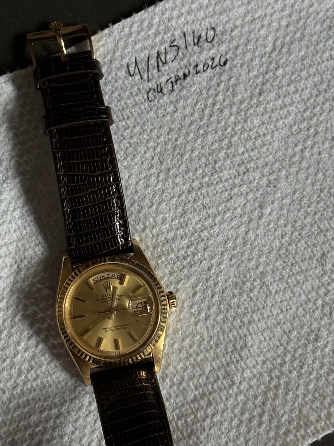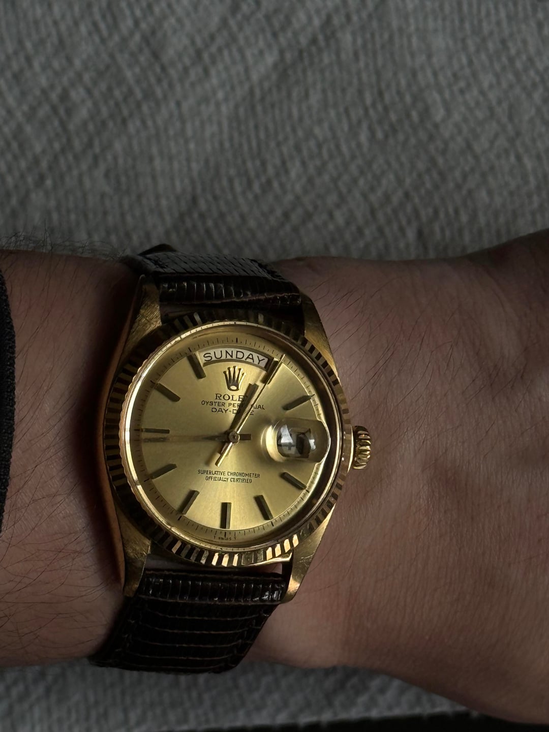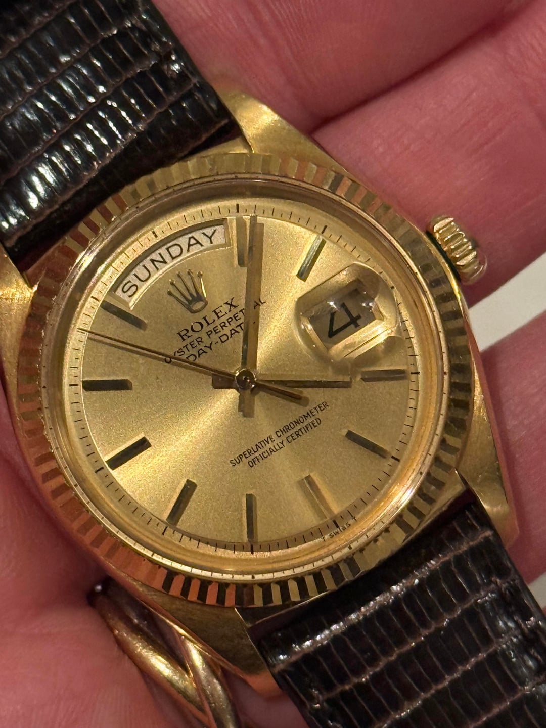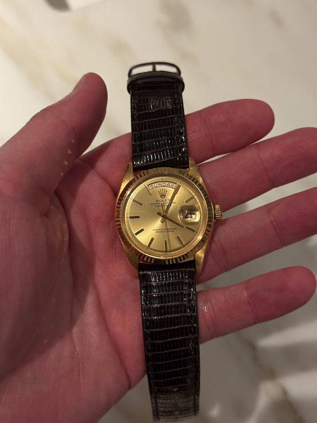 Up for sale is a classic Rolex Day-Date ref. 1803 in 18k yellow gold. This is the iconic “President” Day-Date featuring the pie-pan champagne dial, fluted bezel, and day/date complication with quickset through the crown. Details: • Reference: 1803 • Case: 18k yellow gold • Size: 36mm • Bezel: 18k fluted bezel • Dial: Original champagne pie-pan dial • Crystal: Acrylic with cyclops magnifier • Movement: Automatic – runs and sets properly, runs strong. • Strap: Genuine lizard strap • Buckle: 18k Rolex-signed buckle stamped 750 SWISS Condition: • Watch is in good vintage condition with honest wear consistent with age, minor case wear. • Dial presents nicely with great color and even tone • Day and date change properly @ 12. What’s included: • Watch as pictured on genuine lizard strap+ extra strap. • 18k Rolex-signed buckle Asking 9300 obro, accepting all trades (include TV for any trade offers) Would prefer to trade for Cartier Santos or another Rolex equal value