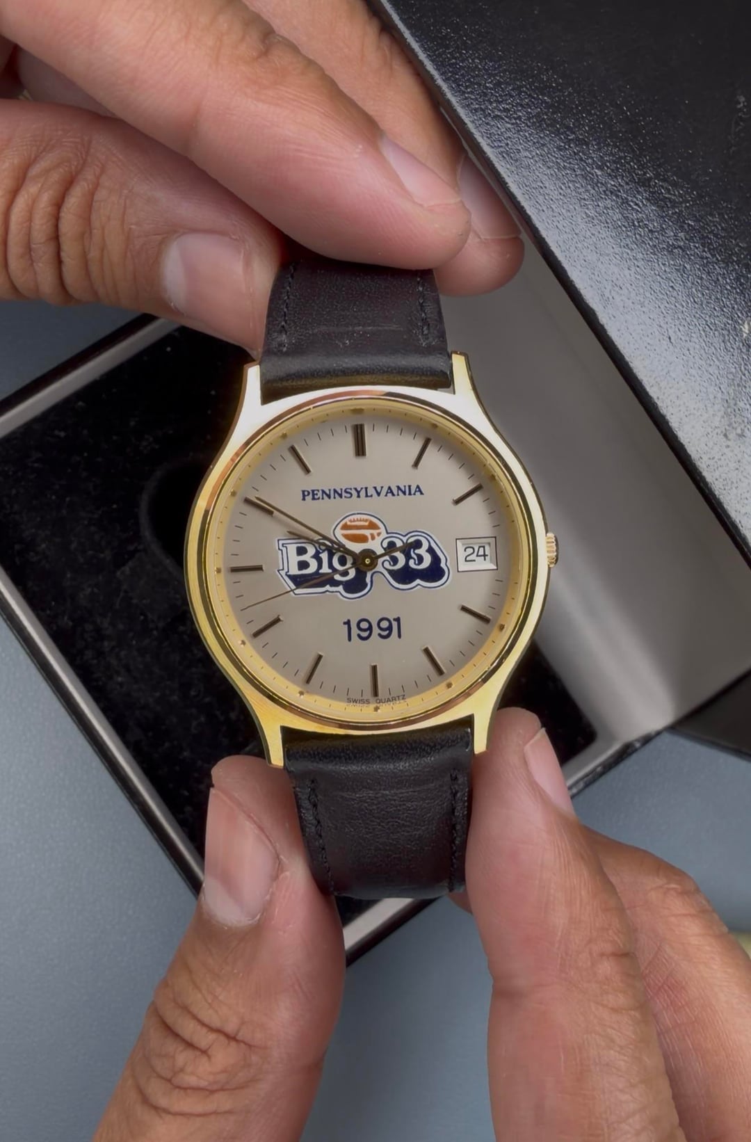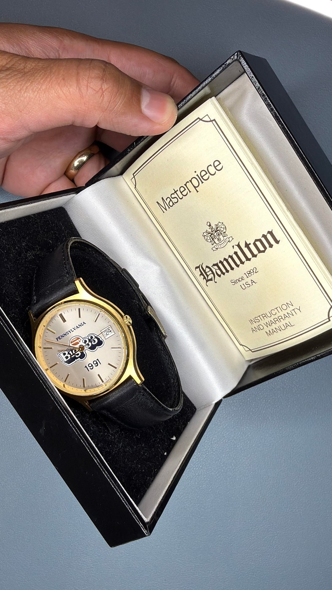 Hamilton Masterpiece Big 33 Limited Edition - Full Set -Details: A beautiful gold colored watch in amazing condition! The strap shows signs of wear, but the case itself is in near pristine condition! This is a unique neo-vintage piece from 1991, you won’t find one in this condition and full set anywhere else! Makes a great a great gift, or affordable dress watch for your collection! -$147 shipped -Included shipping (US). I accept Venmo, Zelle, CashApp, and PayPal (+4% if using G&S) -Case size: 34mm -Movement: Quartz -Timestamp: https://imgur.com/a/gMuyY1p -Location: Downtown Los Angeles -IG: @ColeccionDeLosSantos -TikTok: Chris.DeLosSantos