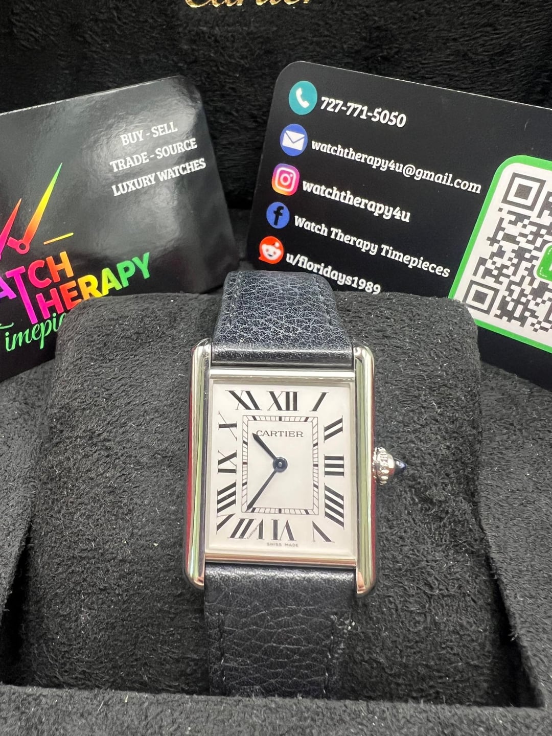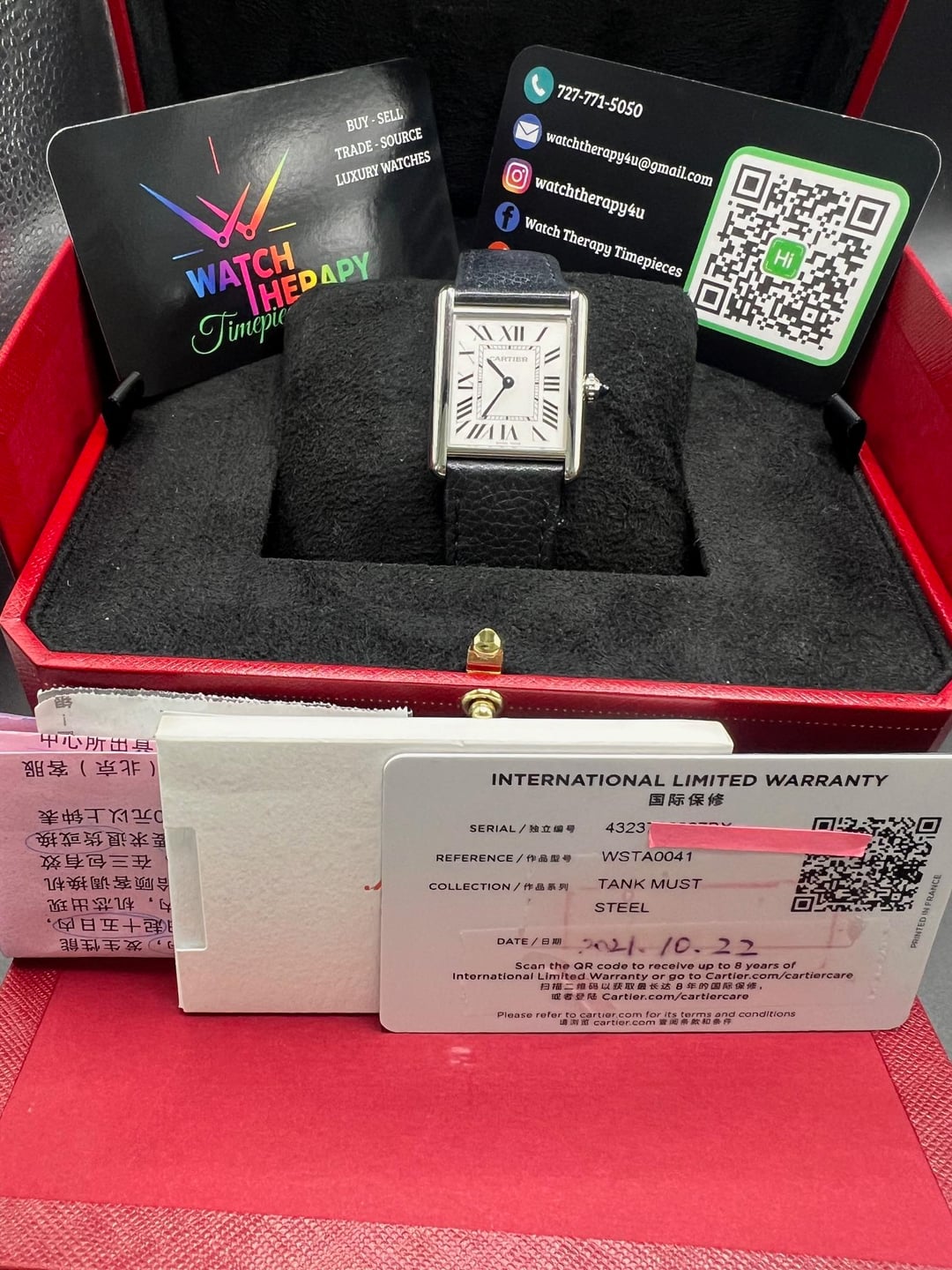 **F/S: Cartier Tank Must 10/21 Ref: WSTA0041** **Shipping from Florida.** **Specs:** \* Elegant SS Case, blue steel sword shaped hands and Cartier’s beaded crown set with a blue cabochon-shaped spinel. \* 33.7mm x 25.5mm \* Black leather band with SS buckle \* 30M Water Resistance \* Quartz movement **Includes**: Warranty card 10/21, double boxed, booklets. **Condition:** Great preowned condition- a few superficial hairlines on the polished parts. Strap has some wear, but a lot of life left. **Price: $2,699.00 + Insured shipping to your local FedEx for pick-up in Con US**. I am also open to a face-to-face public transaction in or around the Tampa Florida Region, within reason. I have many strong and viable references within Reddit and from Buy/Sell/Trade Watch Facebook groups. Always willing to jump on a call or meeting link to show you the watch. Thank you and please reach out if you have any questions or concerns. Florida residents may be subject to sales tax w/o a valid reseller cert. ***No Trades, TY*** **Location**: Tampa Florida **Payment:** Zelle or Wire Timestamp: [https://imgur.com/a/fHJLKTo](https://imgur.com/a/fHJLKTo) FB: Watch Therapy Timepieces IG: [@watchtherapy4u](https://www.reddit.com/u/watchtherapy4u/)