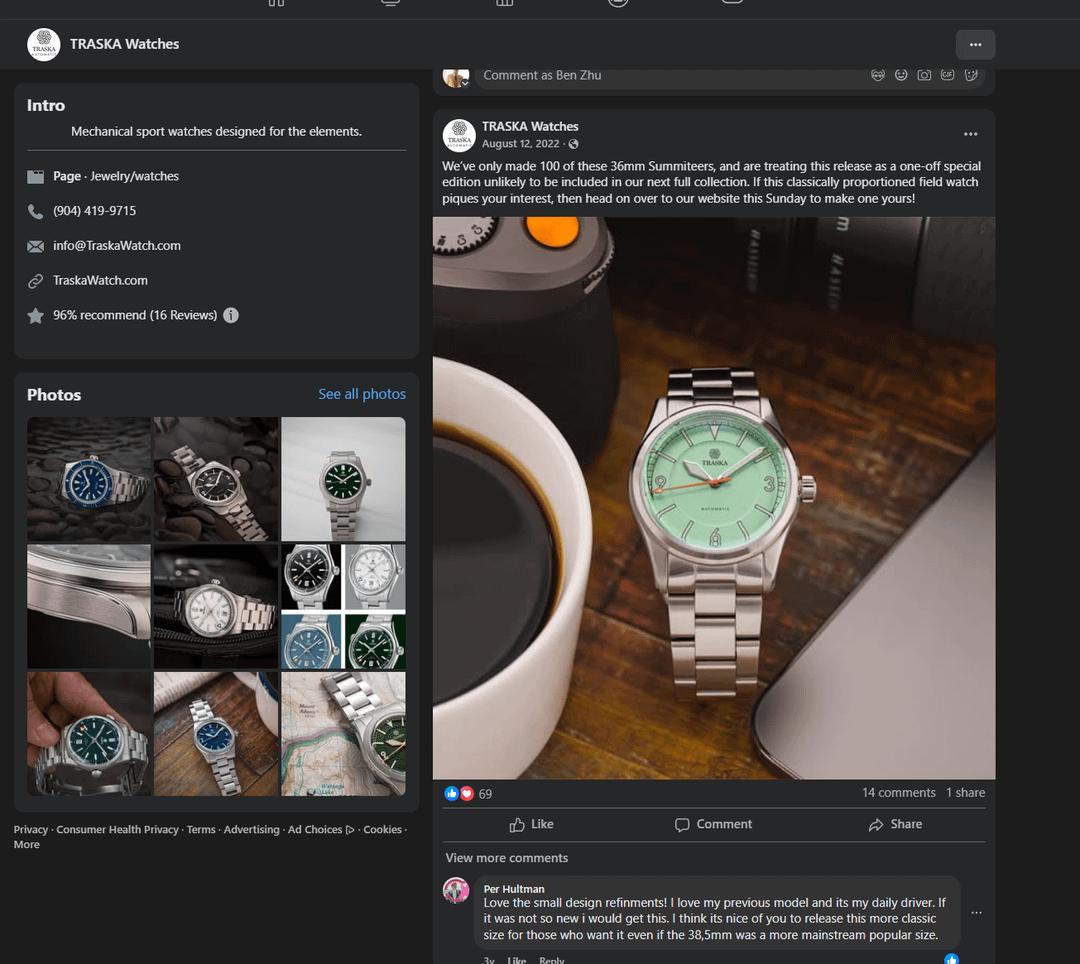 For sale: Traska Summiteer 36mm Mint Green 1/25 limited - Like New Condition 650 Shipped! \-------------------------------------------------------------------------------------------------------------------------- Price: $650 USD (fill in your price) Condition: Like new condition! Worn about 10 times. Please review the pictures for more details! \-------------------------------------------------------------------------------------------------------------------------- Details: • Extremely rare traska. This was bought when the first 100 batch of traskas summiteers were made in 36mm in 4 different dial variations. Only 25 were made in this dial variation and were all sold out in less than 4 minutes. This dial color was never made again after. See pictures for the post about this. • Case size: 36mm • Movement: Japanese Miyota Movement • Dial: Mint Green • Crystal: Sapphire • Bracelet: Stainless steel with solid links & clasp • Water resistance: 200m • Currently sized for 6.25 inch wrist but extra links that were taken out are provided. \-------------------------------------------------------------------------------------------------------------------------- Included: Watch, original box and original carry pouch. Shipping: CONUS shipping included. Will ship securely within 1 business day after payment clears. Payment: Venmo, Paypal, Wise, Wire. Contact me if you want to pay a different way! Timestamp: Please refer to the photos. Please feel free to PM or chat with any questions. Thanks for looking!