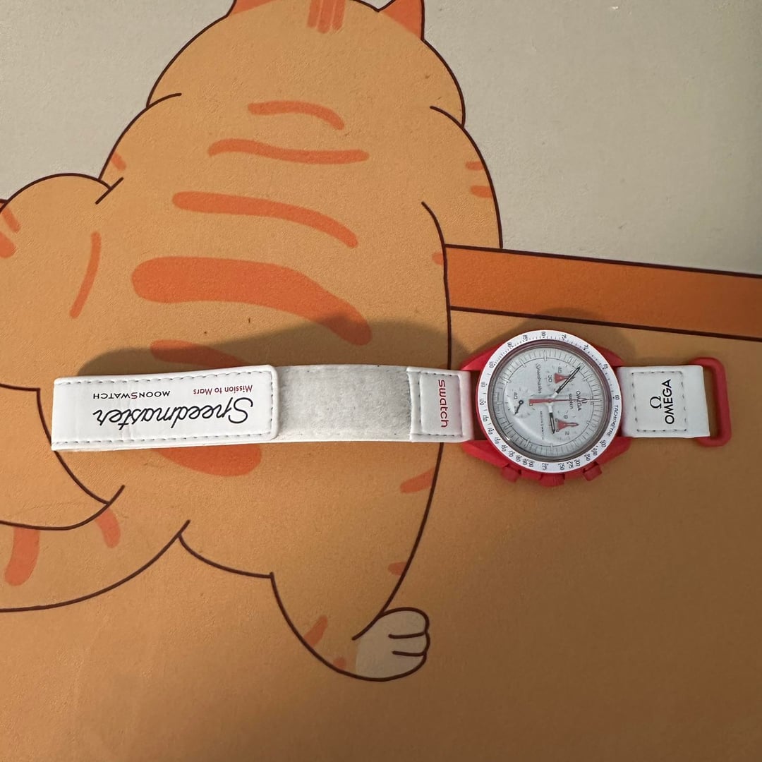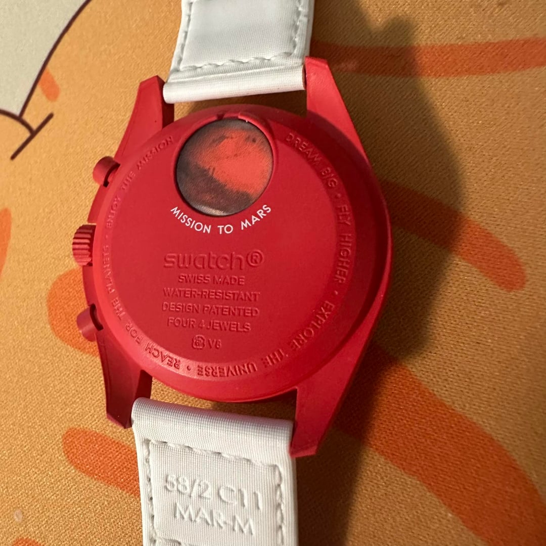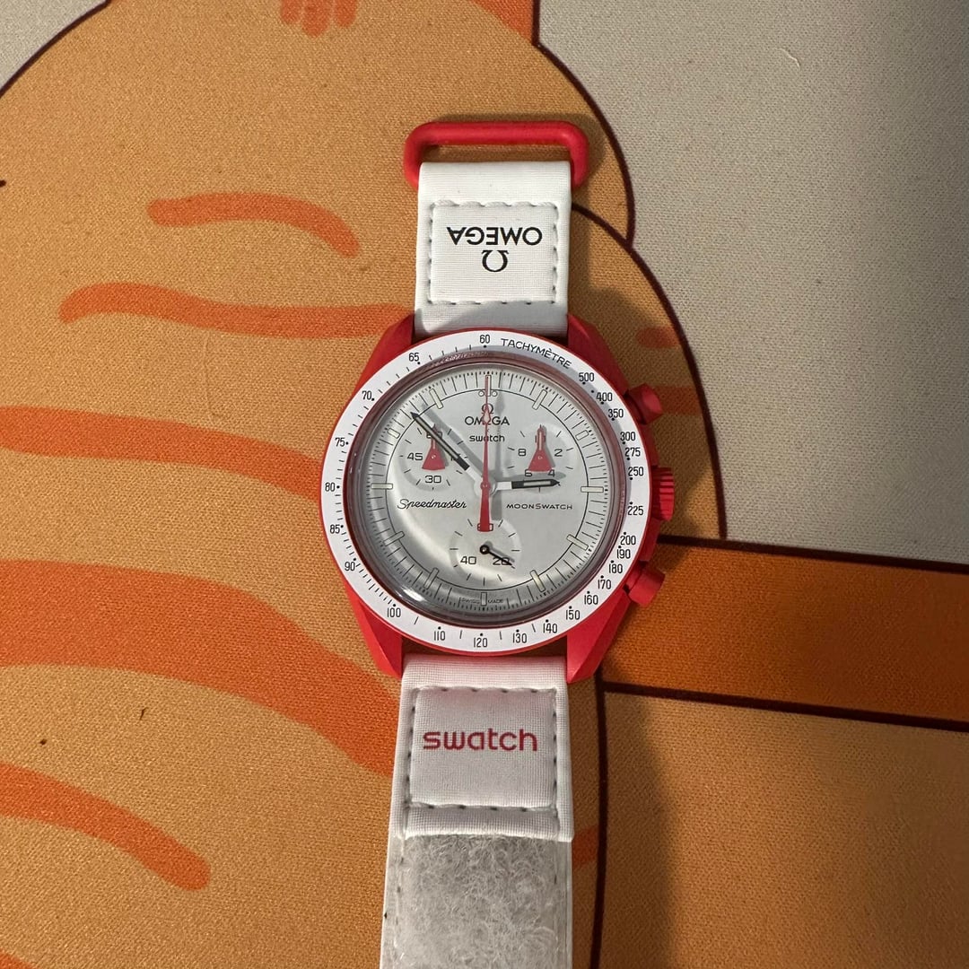 For sale: Omega × Swatch MoonSwatch — Mission to Mars - Excellent Condition $199 Shipped! \------------------------------------------------------------------------------------------------------------ Price: $199 USD (fill in your price) Condition: Excellent condition. Worn only about 5 times. Please refer to images for condition! \------------------------------------------------------------------------------------------------------------ Details: • Case size: 42mm • Case material: Bioceramic (white with red accents) • Movement: Swiss quartz chronograph • Dial: White with red subdials and hands • Crystal: Acrylic • Strap: OEM Velcro strap \------------------------------------------------------------------------------------------------------------ Included: Watch with original box and papers Shipping: CONUS shipping included. Will ship securely within 1 business day after payment clears. Payment: Venmo, Paypal, Wise, Wire. Contact me if you want to pay a different way! Timestamp: Please refer to the photos. Please feel free to PM or chat with any questions. Thanks for looking!