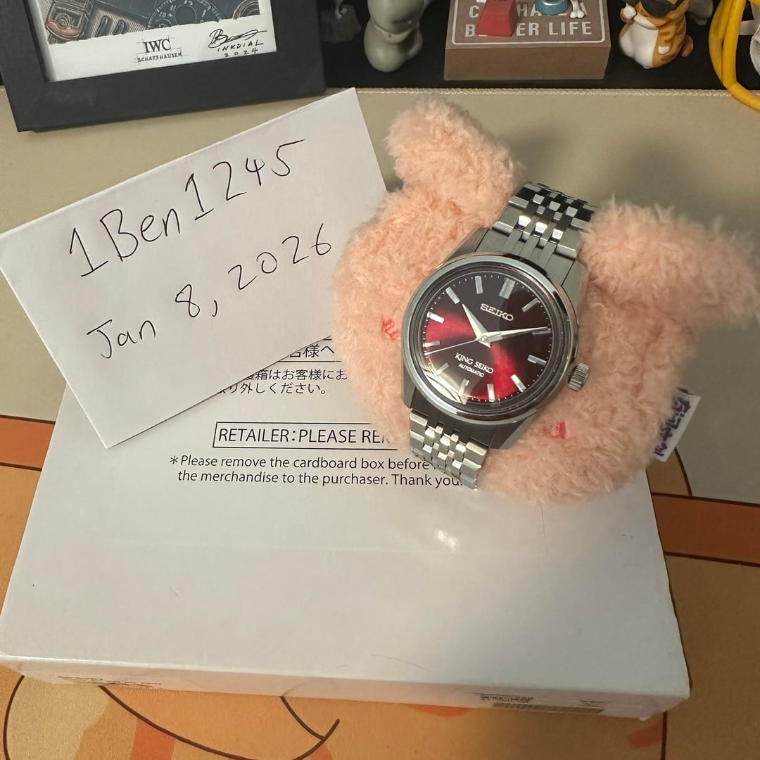 For sale: King Seiko 37mm Red Sunburst Dial SPB287J1 - Excellent Condition $1500 Shipped! \-------------------------------------------------------------------------------------------------------------- Price: $1500 USD Condition: Excellent condition. Only worn 7-10 times. Please look at pictures for more detailed overview of the condition! \-------------------------------------------------------------------------------------------------------------- Details: • Discontinued model. I'm seeing some sellers sell it from Japan but after import taxes, these range anywhere from $1800-$2300 depending on condition. This is the cheapest one on the market. • Case size: 37 mm diameter, \~12.1 mm thickness • Movement: Automatic with manual winding (Seiko 6R31, \~70 hr power reserve) • Dial: Red sunburst “Garyu-Bai” style • Crystal: Box-shaped sapphire with anti-reflective coating • Bracelet: Stainless steel with deployment clasp • Water resistance: 100 m / 10 bar \-------------------------------------------------------------------------------------------------------------- Included: Watch, Original box, King Seiko Travel Pouch, Hang tag Shipping: CONUS shipping included. Will ship securely within 1 business day after payment clears. Shipping insurance and signature upon delivery will be included. Payment: Venmo, Paypal, Wise, Wire. Contact me if you want to pay a different way! Timestamp: Please refer to the photos. Please feel free to PM or chat with any questions. Thanks for looking!