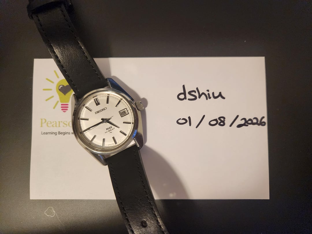 For sale is my King Seiko 45KS 4502-7001 in mint condition. It's been well taken care of during my ownership but I simply don't wear it enough. The crystal is perfect, edges and angles are sharp, no scratches anywhere. The watch was last serviced in 2025, keeps excellent time, looks and functions like new old stock. The watch comes with the following: - Original gold medallion caseback that is full and complete - Black Kuoe leather strap with buckle - Clear sapphire caseback - Aftermarket "KS" signed buckle from Vintage Time AU The dimensions are measured as follows: - 36.7mm diameter - 41.3mm lug to lug - 9.7mm thick (including crystal) - 18mm lug width Asking $800 USD shipping included. Open to any questions you may have! Thanks for looking.