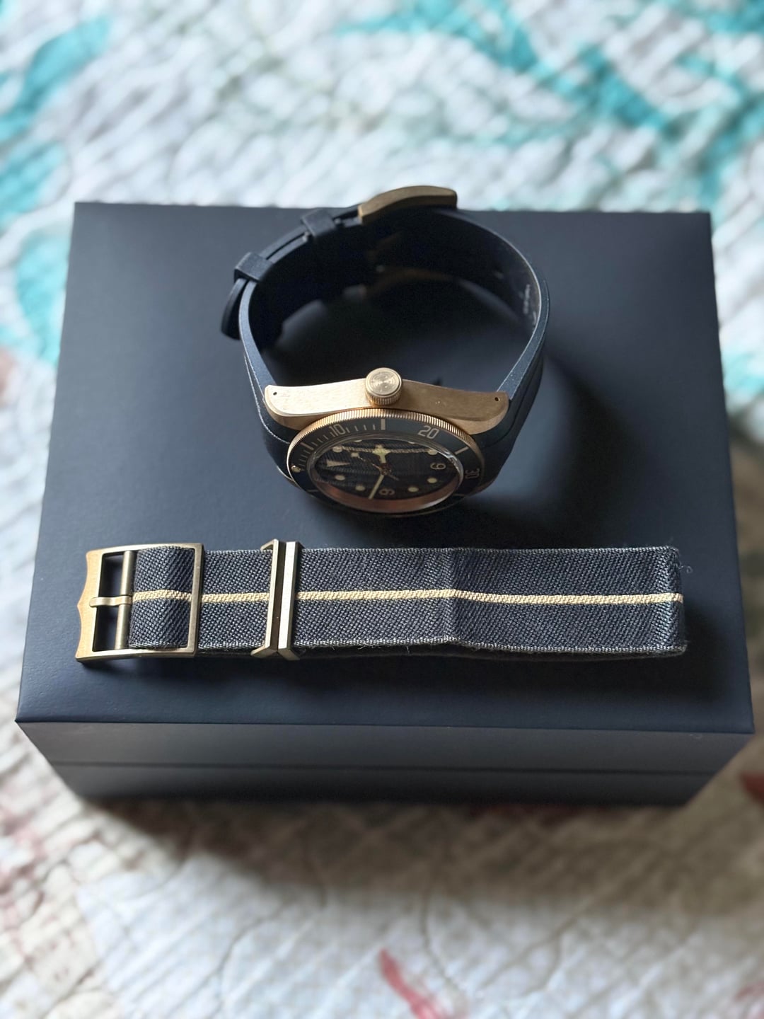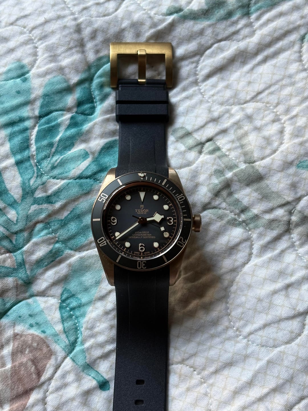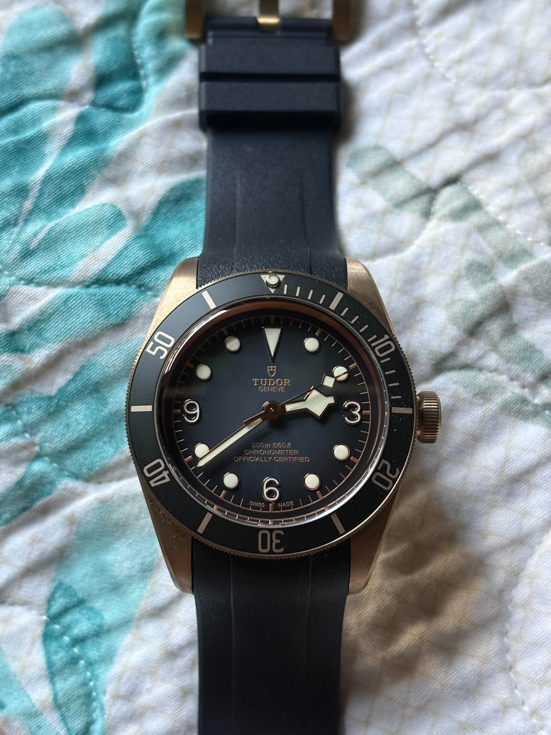 Black Bay Bronze 43mm Black Bay Bronze 43 on RubberB strap with aftermarket bronze buckle. Original nato strap included. Box, papers, warranty card dated 2/10/2024 Scratches on bottom left lug, clean crystal and bezel. Running great Price: $3000+shipping CONUS only, no trades please PayPal F&F, Venmo, Zelle Shipping via FedEx Please comment here before PMing